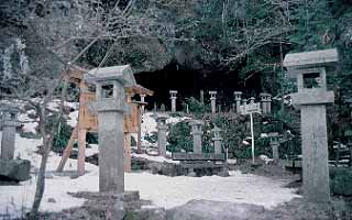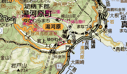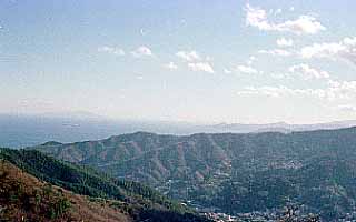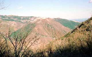 1998年1月25日(日)快晴 (JR・湯河原よりバスで)鍛冶屋BT1218…1248幕山公園1258…しとどの窟1345… (90) 30 (200) 47 15 椿台1400…1433城山1450…1553JR・湯河原 (580)33 (・563) 63 (40) 体力度A 神経度A+(倒木がなければA)(歩行合計約3時間25分) ◇5万図 熱海 小田原 (集成図「箱根付近」) □筆者参考文献 「神奈川県の山」(山と渓谷社)他 湯河原の背後は箱根外輪山の南面となっており、そこに突き出た南郷山と幕山には、96年4月28日に行きましたが、もう一つの代表的ハイキングコースが、幕山から南西に新崎川の対岸に位置する城山で、やはりこちらも火山の裾野特有の伸びやかな地形と青い海の明るい展望を満喫することが出来ます。特に、今日は自宅最寄りの埼京線(東京都板橋区)からも丹沢がひときわくっきり見える展望日和でしたので初島の向こうに大島まで見えました。 湯河原から鍛冶屋BTまで歩いても30分程です。新崎川左岸遙か上を沿う車道を歩き始めるとBT前の五郎神社の林から鳥の声が多数聞こえます。30分程歩いて浄水場の先まで来ると新崎川に接してきます。この辺りは幕山公園として園地になっておりまして、幕山登山口でもあります。ここまでは、鍛冶屋BTの一つ手前の診療所前BSから新崎川右岸沿いの道を来ても歩程は殆ど変わりませんが、左岸沿いの方が高い所を通るので開放感があるような気がします。 幕山登山口付近は岩と梅林が目立つ。幕山公園には、梅園があり、一部咲き始めていましたので、観光客の姿も見られました。更に、渓流沿いの車道を進むと橋を渡って150m位先を「しとどの窟(いわや)」を示す指導標に従って左に入ります。この辺りまで来ると、観光客の姿はありません。 やがて、山道らしくなりますが、遊歩道のように整備されています。ただし、所々低木が倒れて道に覆い被さっており、くぐれない場合は「高巻き」せざるを得ませんでした。この辺は、北東面の沢沿いなので、登るに従って残雪の道となりますが、シャーベット状に再凍結しているので、それほど潜りも滑りもしません。かなり源流に近付く頃右手に源頼朝が潜伏したと言う「しとどの窟」を分岐します(往復5分程)。 しとどの窟。 トンネル手前(北東)から幕山方面。両側に多数の石像が立つ道を登れば、林道に飛び出し、コンクリの割れ目から多数のつららが鍾乳石のようにぶら下がり、時々それが落ちて不気味な音が響くトンネルがあります。ビビりながらそれをくぐれば急に気温も上がったように感じ、目の前がぱっと明るく開けます。南西面の展望が広い椿台です。 椿台からは大島も見える。椿台からは石畳の道を緩く登って行きます。先程のトンネル上の尾根に沿って南下して城山を目指します。662.5m三角点峰の南西を巻き登って稜線上、次のピークの手前辺りが本日の最高点(約610m)です。このピークは北東側を巻き、明るい稜線沿いを海に向かって少しずつ高度を下げて行きます。次のピークの手前では左の巻き道が通行禁止になっているので、そのままピーク目指して僅かに登れば、山頂は芝生の広場。ここが城山です。 城山山頂からは360度の大展望。尤も、北面と西面は、箱根と伊豆の山々に遮られてそう遠くまでは見えませんがそれはそれで素晴らしく、また、東から南にかけては三浦半島まで続く海岸線の伸びやかな眺め、青い海と大島、そして、今日は東京の高層ビル群らしき柱状建築物まで見えます。 下りは、始め気分の良い林間コース。やがて、何度か林道を行ったりショートカットしたりしてぐんぐん下り、最後に東海道線のガードをくぐって200m右手が湯河原駅でした。 ▲項目索引▲ ◎トップページへ戻る◎ |