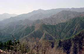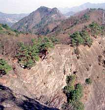 大岱山(おおぬたやま)は、5万図に山名注記がありませんが、中央線・大月の北方、雁腹摺山(1857)へ続く尾根上の金山峠の少し大月寄りで尾根が分岐するあたりの、山頂が5万図で1180mの等高線で囲まれた部分にある山です。大月付近で言うと西方の高川山など、昔は穴場だったらしいのですが、今ではすっかり団体客でごった返しています。しかし、北にあるこの山は、今のところまだ訪れる人も少な目で静かな山歩きが楽しめます。 ガイドブックにあった猿橋838のバスは消滅していて、奈良子行は午後までありません。仕方なく、848上和田行の奈良子入口BSで下車。20分ほど歩いて、ふたつ目のBS林沢戸入口から左へ下りて行って、民家の前を通り、小橋を渡れば、右に目印の製材所。その角を右折すれば、すぐに目印の薬師堂が左側にあり、そこへ入ってお堂の左裏手から山道に入ります。 尾根へ取り付いて登ると、ふたつ続けて左から車道の終点が突き上げてきて、その上のあたりで一時道が不明瞭になりますが、歩き易そうな所を選んで上へ上へと、尾根を登り続けます。何本か現れる道は、尾根から遠ざからぬように、選んで行きます。大抵は目的地に向かっていますが、歩き易さ(厚い落ち葉の上は滑ります)や距離(直登かジグザグか)が異なります。林の中、ただひたすら登り続けるとやがて一時的に平坦な痩尾根となったり伐採跡地になったりはしますが、その後も登り続けます。やがて背後の百蔵山や扇山が同じくらいの高さになり、登りが緩むと、穏やかになった尾根道は左に折れます(山神平)。石尾根チックな伸びやかな尾根を僅かに進むと宮路山です。距離的には、まだ序の口ですが、ここまてで、本日の登りの大半は消化したので、ほっと一息つきます。 大岱山へはちょっと下りがあった後、再び気分の良い道を散策気分で進みます。やがて、小さな源頭部を左へトラバースして、やや不明瞭になった道を少し注意して進むと、一登りで、大月方面から尾根が合わさる、大岱山東峰。ここから西が大岱山の頂稜部ですが、比高10m程のピークが4つ位あって、どれが最高点か判りませんでした。ひとつ目のピークは南に、ふたつ目は北にと小頂稜が不連続に斜めにずれて重なっていて、その間の窪地は、ガイドブックによれば、獣たちが集まるヌタ場を形成していたらしいです。3つ目のピークで本日始めて登山者に出会いました(初老男性二人組、その後も稚児落しまで誰にも出会わず)。4つ目のピークで一休み。北に樹間ながら目立って見えているのは、姥子山?。雁腹摺山は、その左遙か奥の、左半分ワラの色、右半分深緑(樹木)のあたりでしょうか。4つ目のピークからは本格的に下っているようで、5万図1177標高点峰らしきピークは大分低く見えるので、どのピークが山頂なのか同定出来ませんでしたが、大岱山の標高は、約1190mと見ておけばいいでしょう。一応山頂候補のすべてのピークを踏んで、東峰から大月方面への尾根を下ります。 桜沢峠まで下り一方で、随所に好展望地があるので、最近出来た(筆者のS53年版5万図には未記載)送電鉄塔・送電線が目障りなのを除けば、非常に愉快な道です。途中僅かに登ったピーク(下から見た場合はピークだが、実際は肩のような所。東海自然歩道の焼山もそうです。)は1006.2三角点のセイメイバン。ちょっと一休み。 セイメイバンから滝子山方面を望む。桜沢峠からの登りは、あまり歩かれていないようで急に道がか細くなります。5分強で登り着いたピーク高ノ丸は何の変哲もない林の中ですが、天神峠への下りで再び道がはっきりしてくるのは、天神峠を車道が乗越しているので、車で来て往復する人が多いのでしょうか。 天神峠の次の鉄塔ピークから振り返る。再び登ると、痩尾根や露岩や松が出現する面白い道になります。天神峠から15分程の所にある720m*1 等高線の鉄塔ピークは、360度の展望台です。少し先の713.5三角点を過ぎて、右(南西)寄りに向きを変えて下って行くと、待望の稚児落し。岩殿山へ尾根と、南西に派生した小尾根に挟まれた>型の100m程の絶壁を見下ろせます。 稚児落しから岩殿山を望む。この辺から、細かい登降を繰り返し、兜岩へは、裏側へ一旦下って反対側を戻るように登ります。ザレた道や、鎖場をビビりながら下ると、やがて岩殿山との鞍部に当たる築坂。ここを右に下れば大月駅へ行けそうですが、中央自動車道の山側上部に出てトラバース不能で逆戻りと言う噂なので、そのまま岩殿山分岐まで進みました。しかし、分岐点は頂稜部の一角まで数分の所まで上がった所だったので、ここまで来ては寄らねばと思い、山頂へ往復しました。 岩殿山山頂は頂稜部の東端にあり、絶壁の上から見下ろせば、猿橋駅の向こうに、以前百蔵山から見ても気になっていた、神楽山からの尾根の末端がシリコンウエハーのように平らに削り取られた造成地*2がヤケに目に付きます。何なんでしょうね?、これは。 ※2021年後付け註 *1 ネットの地理院地図