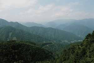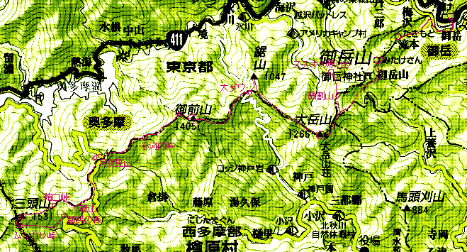 このころ、ちょっとした趣向があって、山頂の数を稼いでいました。今回の無理矢理山頂数稼ぎツアーは、「奥多摩主脈縦走路」として整備されている道です。かなりのロングコースで、日もだいぶ短くなってきたこのごろですから日没が心配されますが、大岳神社から先は懐中電灯があれば夜間でもほぼ安全に歩けるほどに整備されています。三頭山を10時に出たとして、大岳山まで6時間掛かったとしても16時で、まだ日没までには余裕があります。多少の遅延があったとしても、暗くなるまでに大岳山を越えることは、まず間違いがありません。その後のコースは縦走路なら夜間も含めて5〜6回は通った経験があり、しかも、御岳神社〜ケーブル駅一帯は、大きな山上集落(旅館等)になっていますので、万一の場合を考えても心強いのです。 ◎三頭山へ 以前、御前山から下ったときは、西原峠経由でしたが、今回の計画は距離もぐっと伸びるので、JR五日市線・五日市駅から都民の森までタクシーを奮発。 都民の森からは、前回通行禁止だった大滝経由の道を辿って1時間ほどで、笹尾根最上部のムシカリ峠に達し、更に右手へひと登りで三頭山山頂(昔の西峰)です。 都民の森・森林館から大滝までは、ほぼ平坦なウッドチップの遊歩道で、その先も三頭沢の渓相を楽しみながらの比較的緩やかな登りで、山頂まで難なく達することが出来ます。 この3連休で一番天気がいいと予想されたこの日でしたが、気温が上がったせいかモヤのため、富士山は見えず、手前の三ッ峠も薄く霞んでいました。それどころか目の前の権現山さえシルエットとしか見えません。 ◎三頭山〜小河内峠 三頭山から鞘口峠(数馬峠)まで400m近く下ります。そこから登り返して小さなコブをいくつか越えると右手に砥(といし)山へ分岐する道があります。木段の道を登った先、山頂の30mほど手前でこの道は右手に逸れてしまいますので、「進入禁止」の標識がある藪道へこっそり入っていくと、金網で囲まれた施設の左手が砥山の山頂で、それを示す標識も2枚ありました。この先、尾根伝いに行けば縦走路に出合うでしょうが、まだ藪漕ぎの季節には早いので、先ほどの分岐まで3分ほど戻りました。 この辺は奥多摩自動車道が近いので、バイクが爆走する音がチェーンソウのように響きます。筆者手持ちのエアリアマップでは、自動車道は尾根の東側を通っていて、月夜見山の先で渡るまで、縦走路には出合わない事になっていますが、実際には月夜見山までに2度稜線上で接します。特に1度目は道路の西側が切れ落ちていて歩道がないので、100mほどビビりながらの車道歩きを強いられました。ここは、鹿倉山方面の展望がよいので、車を気にしながら写真撮影。 月夜見山へ向かう車道より丹波川上流の山々。月夜見山も、展望のない地味なピークでした。およよよよ。もう12時近い。ここから御前山まで1時間では到底無理。御前山に12時半過ぎに着いて、13時までゆっくり休憩するという甘い夢は脆くも潰え去りました。 非道いことに、月夜見山から下り出合った自動車道を渡った先でコース途切れ、車道を月夜見第2駐車場まで200mほど都民の森方向へ戻らなければなりませんでした。 駐車場からは、尾根上の広い道を御前山方向へ下って行きました。最低鞍部の標高は1000mを割りますので、御前山まで400m登り返さなくてはいけません。防火帯らしき(ただし、所々立木あり)広い道を小さな上下をしながら登っていくと、ほどなく、正面に鷹ノ巣山方面が望めるベンチもあって、小休止に絶好の小河内峠です。 小河内峠より石尾根方面。◎小河内峠〜御前山 ここから先は、三頭山周辺に比べて出会う人も少なく、静かな山歩きが楽しめます。御前山に向かって序々に登って行く防火帯(?)の尾根道からは、振り返れば三頭山が大きく望まれますが、今日は霞み気味です。 白いスーパーバッグ(スーパーマーケット等で買った物を入れるために寄こすポリ袋)をぶら下げた人3名発見。山菜採りでしょう。付近には100mおきくらいに、「許可無く、植物・昆虫等の採取をする事を禁じます」の表示があり、その真ん前で採っているのですから、確信犯です。防火帯(?)は、その全幅8〜10mに亘って草をきれいに刈り取らた跡が残っており、山菜採り氏曰く「もったいないなぁ」。防火上必要があって刈り取ったということであれば、「採取禁止」と矛盾しないのでしょうが、そういう理屈は山菜採り氏には、理解出来ないのでしょう。 前衛峰の惣岳山あたりからまた人影が増え出します。意外にあっけなく登り着いた御前山山頂は、雰囲気は悪くないのですが、人出が多いのを嫌い、三角点を踏みつけただけで通過。 ◎御前山〜大岳山 御前山からいくつか分岐を見送って、ひとしきり下り、少し登ったピークには、ベンチもあり、ここで小休止。無名峰かと思っていたら、木に「クロノ尾山」と書いてありました。1山儲け!。 その先の鞘口山には、なんと2〜3家族の団体がくつ