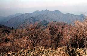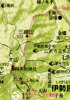 96年12月21日(土)快晴 煤ヶ谷BS820…1040三峰山1050…1300大山1315…1450大山ケーブル駅BT (150) 140 (△935) 130(△1252) 95 (315) 体力度B+ 神経度B(歩行合計約6時間15分) ◇5万図 藤沢、秦野 □筆者参考文献 「遊歩百山 5」(山と渓谷社) ここでいう三峰とは、有名な秩父の妙法ヶ岳〜雲取山あたりのことではなく、また、丹沢山から北東に延びた尾根上の顕著な三つのコブ(丹沢三峰)のことでもなく、丹沢東部の大山の約0.5Kmほど東の地点から、見晴台への尾根を南東に分けて、北東へ分岐し北に延びるする尾根上にある、小さなコブコブのことです。本日の主眼は、ここから尾根続きに大山へたどることです。 筆者手持ちの数冊のガイドブックには、どれもこれも三峰と大山はそれぞれ別に紹介されていて、尾根続きで距離も近いこれら2山を結ぶコースは、不動尻から三峰への道が尾根に出た地点と、不動尻から大山への道が尾根に出た地点の間の尾根道が空白になっています。しかしこの間を歩いた報告、(遊歩百山 5)によれば、別に難路でもなさそうでしたので、「草が枯れた季節には行ってみたい」という気持ちがムクムクと湧きあがっていたのです。 煤ヶ谷バス停からすぐ橋を渡って、左へ川沿いの舗装道路に入り5分ほどで左手に立派なトイレがありますが、これは行き過ぎで1分ほど戻りました。バス停から4分ほどで右へ分岐している細い車道が三峰へのルートですが指導標にネットがかけられていたため見逃してしまったのでした。 これを登るとやがて山道となり、もうすぐ稜線だと思ったら、物見峠への分岐で「経験者向き」などと恐ろしいことが書いた看板があります。この看板はこの先の稜線上にもありますが、はっきり言ってコケオドシです。(物見峠経由の方は行ってないので判りませんが。)やがて、稜線上に出ますが、振り返り見る対岸の仏果山(747)がまだ同じくらいの高さに見えるので、「もうひと登りあるな」と思わせます。まさしくそのとおりで、少しずつ高度を稼ぎながらやがて訪れた北峰への登りは、きつく感じました。やはり、肝臓が弱っている(γ−GPTが###)ところへ前日まで3晩連続忘年会だったのが効いているのか。「三峰山まで0.6km」の標識から山頂まで30分もかかってしまいました。 バス停から2時間の予定でしたが2時間20分もかかってようやく三峰(三角点峰)山頂に着きました。道中思ったのは、流石はお役所仕事、不要に見える鎖も時と場合によっては役に立ちましょうが、はしごの橋は、踏み外しそうで怖く、むしろ下を通った方が安全に思える所もありました。ガイドブックには「訪れる人は少ない」と書かれている三峰山ですが、それは、大山や塔ノ岳と比べたらの話でしょう。好展望ながら喧騒の山頂は早々にに退散して、大山を目指します。 三角点峰山頂から南峰を経て20分ほど行ったところにベンチがあり、一般的なルートはここから左へ尾根を離れて不動尻方面へ下っていってしまうので、すかさずベンチ裏へまわり、尾根上をたどるのが本日のハイライト。ここから、約30分は、特に尾根が広い区間では踏み跡が判然としない道となります。しかし、薮はほとんどなく、樹間からの大山方面の眺めと、木に巻かれた赤テープを追っていけば迷うことはありません。ルートがやや左へ屈曲するとやがて、不動尻〜大山の道に合流します。合流点の少し手前から眺める三峰方面は、彫刻刀でえぐったように幾すじものルンゼが頂稜部にきれ込んで、なかなか精悍な姿です。 大山への登りより三峰山を振り返る。合流点付近からは、大山がバテた気分のところへ絶望的な仰角で望まれます。実際、標高差も400m以上あり、バテバテの体に活を入れて喘ぎ喘ぎ登ります。電線をくぐるあたりは好展望で、前方には大山山頂のアンテナ塔が大きく、振り返れば、ここから見る三峰も小粒ながらきりっとした姿です。やがて、見晴台からの道を合わせて、最後の頑張りで大山山頂です。三峰山から2時間10分かかりました。 山頂からはまず東方が見渡せ、北へ回り込むと立派な水洗トイレがあり、(凍結期間のため閉鎖されていました)その横を通ってさらに西へ回り込むと丹沢方面の展望がひらけます。山頂には缶飲料の自動販売機(平地で110円のが240円なのは仕方ないでしょう)もあります。 下山は、ヤビツ峠だとバスがあるかどうか心配だったので、下社へ。しかし、下社ケーブル駅を見逃して石段の多い男坂に入ってしまい、伊勢原駅へのバスが出る大山ケーブル駅バスターミナルまで歩くハメに。しかし、幸か不幸か、このケーブルカーは、標高差を稼ぐというハイカーの期待(?)に応えるほどのものでなく、標高差はたったの280mですのて、延びた歩程は30分ほどです。 阿夫利神社下社。ケーブルを使って登るコースは、バス終点から追分駅(ケーブル下)、下社駅(ケーブル上)から山頂までかなり登りでがありますので、大山への一番楽なルートは、ヤビツ峠からということになります。また、大山からの下山ルー