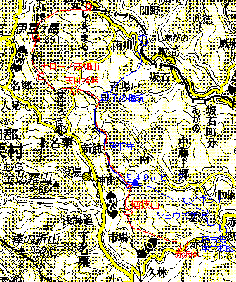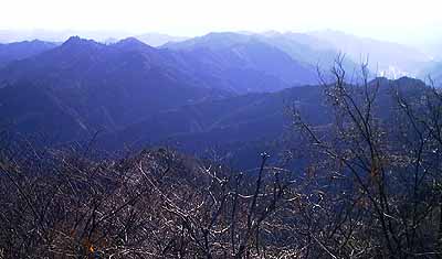 98年12月21日(月)晴 西武線・正丸835…940伊豆ヶ岳1000…古御岳1020…ナローノ高畑山1055…中ノ沢頭1115 (300) 65 (△851) 20 (830) 35 (695) 20(△623) …天目指峠1137…子の権現分岐1215…釣り鐘ピーク1300…1330 548mピーク鉄塔1340 22 (490) 38 (640) 45 (580) 30 (540) …仁田山峠1352…1417楢抜山1425…1545赤沢BS(バスで飯能へ) 12 (400) 25 (△554) 80 (190) 体力度B 神経度B (歩行合計約6時間40分) ◇5万図 秩父 □筆者参考文献 「埼玉県の山」(山と渓谷社) 伊豆ヶ岳から南東方向に尾根を辿るコースは、ガイドブックでは通常竹寺付近までしか紹介されていませんが、前回、末端の原市場付近から登り、子の権現まで歩くことが出来、伊豆ヶ岳から尾根の末端まで縦走可能なことが確認出来たので、本日は早速実行。ただし、途中の尾根が二股に分かれる548mピークの直下の鉄塔からは、前回歩かなかった南側の尾根へ入り楢抜山を経て、こちらの末端の赤沢付近へ下ろうという計画です。 正丸駅から指導標に従い途中正丸峠への道を右へ見送り、沢沿いの道を行きます。支尾根へ出るための詰めの泥斜面は昔は滑りやすくて難所でしたが、登山公害(?)で木の根が露出してきて若干歩き易くなりました。この辺は訪れる人が多いせいか中には私有地へ入り込んでシイタケ・タケノコ・その他山菜等失敬する悪党がいるらしく有刺鉄線や「私有地につき立ち入り禁止」の看板がやたらと目につきます。 伊豆ヶ岳名物の鎖場には「落石のため通行しないように」との表示がありました。平日の朝とあって前後に登山者もいないので問題なさそうでしたが、表示がありながら突入して万一事故を起こしたりすると何言われるかわかりませんので、女坂(巻道)を登りました。 もう少し遅い時刻だと登山者でごった返す伊豆ヶ岳山頂も、今回は筆者一人で、大展望を独占することができました。大展望とは言っても、周りの山に比べて標高が低いのであまり遠くの山々までは見えません。勿論、山名についている伊豆などは丹沢山塊に邪魔されて見えません。しかし、東方、平野方面へ没していく低い山並みはいい感じです。 伊豆ヶ岳より本日辿る尾根方面。いよいよ縦走開始。古御岳への下りは、「関東ふれあいの道」らしからぬ悪場です。登りもきつい。古御岳からは大きく下りますが、その後穏やかな道になり、さほどの登りもなくナローノ高畑山に着きます。「ナローノ」とはどんな意味なのでしょう。ここは、5万図の高畑山(622.7m三角点)よりひとつ伊豆ヶ岳寄りのピークです。それでは、三角点峰には何と表示されているのだろうと思い、気が付かないまま通り過ぎることのないように注意深く歩を進めると、案の定縦走路は北面を巻いています。縦走路の右側のやや藪っぽい尾根道を辿って三角点を発見。「中ノ沢頭」と表示されていました。縦走路に合流し車道の通る天目指(あまめざす)峠へ下ります。そこからの登りもややきついですが、少し先は明るく開けた伐採地となっています。 やがて子の権現が見えるとすぐに竹寺への分岐へ入ります。もし、子の権現が初めてなら片道数分なので往復して来てもいいでしょう。ここから548mピーク鉄塔までは前回の逆コースとなります。所々で対岸の都県境尾根を中心とした展望が得られます。竹寺近くの釣り鐘ピークを越え、竹寺や小殿への道を分け、「関東ふれあいの道」じゃなくなった後も明瞭な道が続きます。電線沿いの道となってしばらく登り下りすると548mピークの手前の鉄塔に着きます。 電線沿いの伐採地より楢抜山の双耳峰。さて、いよいよここからが本日のハイライト、未知の領域です。南へ仁田山峠まで急降下。車道の切り通しの脇から再び登り始めると何だか不気味な雰囲気に。今までとはうって変わって藪っぽい道になって前途困難を思わせます。木の間から名栗湖が見える程度で、殆ど展望のない急登の末辿り着くピークは僅か手前で道が左へ逸れているので、折角ですから寄って行きますが別段何もありませんでした。一旦下って登り返したピークが5万図上553.5m三角点の楢抜山です。この辺からは、木に巻かれたピンクのビニールひもを見逃さないように注意しながら歩を進めます。すぐに石灰岩の積み重なった天狗積ピークですが、その後は相変わらず展望も特記すべき事項もないまま、所々不明瞭になる道を外さないように注意して赤沢へ下りました。 住宅地へ出たら川沿いの道僅かで街道へ。赤沢BSは、右へ100mへ行った所にありました。 本日は、平日のため、伊豆ヶ岳〜竹寺付近も数組のハイカーと出会っただけでしたが、楢抜山周辺まで来れば、たぶん休日でも殆ど人に会わず、静かな山歩きが楽しめると思います。 ▲項目索引▲ ◎トップページへ戻る◎ |