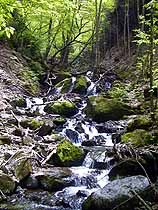 熊倉山は長沢背稜から北に派生した尾根上の一峰で、西方、大血川を隔てて連なる三峰付近(妙法ヶ岳〜霧藻ヶ峰)と比べると格段に無名なので、静かな山歩きが期待出来ます。ただし、このコースの1100mという標高差は奥武蔵にはないもので、また、交通の便も若干悪いですし、奥武蔵のハイキングよりは気合いを入れて出掛けました。 馴染みのない山なので、白久(しろく)駅から、ルートを見つけるのに苦労するのではないかと心配していましたが、行ってみたら駅前から指導標完備でした。谷津川沿いの車道を行きます。ガイドブックでは、この車道が左へ屈曲する手前で右手の登山道に入ることになっていますが、筆者は指導標に従って、そのまま斜度をました車道をジグザグと登って行きました。そして、とうとう大肌尾根を乗越す地点まで登り着いてしまいました。そこは、左手が駐車場のような広場になっていて、右手に山道の入口を示す指導標がありましたので早速入っていきます。 ごく緩い登り下りの後、本格的なジグザグの登りが始まります。だいぶ登ると植林がまだ若木の所があって、秩父盆地やその周りの山々が見渡せます。更に登ると、雑木林となって傾斜も緩むのでジグザグの角度も緩んできて新緑の中、さっきよりはのんびり歩けて気分のいい道です。更に登ると、尾根は傾斜が緩み痩せてきますのでジグザグはなくなります。この辺までは登り一方で、効率的に高度を稼いで来ましたが、この辺からは、頂稜部のいくつかのピークも見えてきて、山頂ピークが見えているのかどうかは解りませんが、そこに辿り着くまでに、いくつかのコブを登り下りしなければならないことが窺えました。 登りの大肌尾根より秩父盆地。始め、小さなコブを2つ越えました。道が急なので、下りには神経を使います。その後、大きく登って、小さく下る事を繰り返して高度を稼ぎましたが、急登箇所も多く、逆コースはこれを下りに使うのでかなり大変だろうと想像されました。途中に山頂と武州日野への分岐を示す指導標がある最後の急登を登り切れば頂稜の一角で、北端にツツジの花がせり出し、中央の露岩に三角点があり、南端にも露岩がありました。 途中では、一組追い越しただけでしたが、さすがに山頂ともなると数計10数人のハイカーがいました。しかし、幸いにも、最奥(南端)の露岩は空いていたので、そこで昼食にしました。頂稜部全体的に立木のため展望は良くありません。ただ、三角点からは西方が開いていて、妙法ヶ岳〜霧藻ヶ峰の尾根の向こうに白石山(和名倉山)が目立ちました。 下りは、先ほどの分岐を指導標に従って武州日野方面へ入りました。このコースは登りが尾根道だったのに対して谷の源頭部の斜面をジグザグと下ってその後ほとんど谷沿いの道です。ひとしきり下った、カールの底のような平坦地は笹平で、新緑が鮮やかですが、団体がいたので足早に通過します。 ガイドブックには尾根道とありますが、谷の中の小尾根なので気分的には谷の中を下って行く感じです。沢に降り着いた所に潰れた廃屋があり官舎跡の表示がありました。左へ小尾根を乗越して、折り返して沢へ下ってくると合流点である三又で、ここからは新緑に彩られた渓相を楽しみながら、沢を左右に絡んでの下りになります。やがて、一ノ橋を左に渡ると河原よりは歩き易い沢沿いの山腹道となり、右手に祠を見てしばらく先で車道に出ます。 下り三又付近の清流と新緑指導標に従って車道を下ると里に出て、Y字路になります。どちらでも武州日野駅へ行けますが、左手へ下って行く如意輪観音堂経由の道の方がやや近そうです。観音堂を過ぎて真新しい切り通しを越えて少々で秩父鉄道の線路に突き当たり、武州日野駅はすぐ右手です。 ▲項目索引▲ ◎トップページへ戻る◎ |