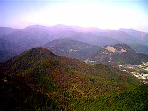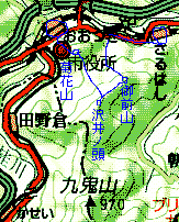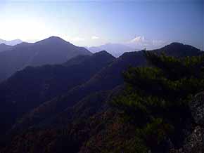 中央線・大月の南方の神楽山−九鬼山のコースは、最近ではポピュラーな縦走路になっていますが、その途中、沢井ノ頭付近から北西に突出た支尾根上の小ピーク・菊花山は地元の人以外には余り知られていないと思います。このコースは、いつも整備されて指導標も完備したコースばかり歩いている人、あるいはいつもコースの判断を同行者任せにしている人にはやや手強いと思いますが、歩程が短いので、日が短くても朝から登り始めれば、道を誤ったと思ったら何度か引返して試行錯誤しても日没の心配はなく、草の枯れて尚且つ雪のない季節には、単独行によるルートファインディング入門コースとして好適だと思います。 実は、筆者は、この2週前に、三ッ峠のバリエーションルート仮称東尾根を目指して、富士急行・東桂から湯ノ沢峠への林道で十数頭の野犬に出合い、ビビって引返して、その帰り折角なので猿橋で下車して比較的歩程が短いこのコースへ入ったのでした。しかし、歩き出したのが正午ごろだったので焦っていて何度か道を間違え、最終的にも菊花山に到達することなく下山するハメになってしまいました。と言うことで、本日、再挑戦です。 すっかり近代化された猿橋駅の南口を出て西進すると右手から線路を渡ってきた国道20号に合流します。猿橋駅北口から国道20号沿いに来たと思われる十数人の中高年団体の後ろについてしまいました。日曜日とはいえ、まさかこのコースを団体が行くとは思えませんでしたが、取敢ず追い抜きます。大パーティーは足が揃いませんから、追い抜いてある程度距離を空けてしまえば、追いつかれる心配なく、のんびり静かな一人旅が楽しめる筈です。 20分程で「御前山」の指導標と「厄王山」の石標があるので左に入り、すぐ右後ろから合流する簡易舗装道を登って行きます。沢沿いの道が左に橋を渡ると朽ちかけた一の鳥居があり、ここから山道となります。 登り始めると、まさかこっちには来ないと思っていた先程の団体が鳥居付近に到達しているのが見えましたが登りならますます差がつくと思われるので安心です。沢沿いに山腹を行く道は、源頭部近くではジグザグとなり、二の鳥居のある支尾根鞍部へ登り着きます。そこからは、始め尾根を右手から巻いて、更にジグザグに登ります。やがて、小さな尾根の上に出ると、菊花山が見下ろせます。露岩も出た尾根道を登ると厄王山(岩室のような祠)の前を通り過ぎます。足場の悪い道を数十m行くと、そのまま山腹を巻いていく道と、左へ厄王山−御前山の尾根に取付く道に二分します。前回は、左折したらやや難路だったため、万一行き止まりだったら下りに数倍時間がかかりそうだったので、すぐ引返して巻道へ行ってしまいました。巻道は、御前山より九鬼山寄りで縦走コースに出てしまうので、戻るように御前山を往復することになりました。今回は時間があるので左折して直登を目指します。道も定かでなく藪っぽい急斜面を両手動員で登ると厄王山−御前山の尾根に取付く事が出来ました。この尾根上には藪っぽいものの、はっきりした道がついていましたので、厄王山からはもう少し明瞭なルートがあるのかも知れません。この尾根道を緩く登っていくと神楽山−九鬼山のコースと交差して、その先僅かな登りで御前山(御前岩)に登り着きました。 御前山山頂から九鬼山方面。御前山の頂上は露岩になっていて、5万図に崖の記号はないものの、南面は50mくらい切れ落ちています。ここは、岩と松というおあつらえ向きの場所で、展望も抜群なのです。快晴なものの生憎薄いモヤが覆っていて、余り明瞭な眺めではありませんが、九鬼山へ続く稜線の上に富士山、前道志、道志等の方面の眺めを楽しむ事が出来ました。先程の団体が迫ってきたので、ここを辞します。 ここから、沢井ノ頭までは、神楽山−九鬼山の縦走コースを行きます。僅かな急降下の後、露岩を左手から巻いて、次のピークからは御前山を振り返る事が出来ます。比較物が何もないと小さな岩に見えますが、山頂に人の姿を見いだすと南面は50mくらい切れ落ちていて、上部20m程がほぼ垂直、下部も60゜以上の傾斜であることが確認できます。 九鬼山への縦走路から菊花山(左手前)と岩殿山(右中)。次のピークから沢井ノ頭への鞍部付近は伐採地になっていて、岩殿山や南大菩薩方面の眺めが素晴らしく、沢井ノ頭手前−菊花山の尾根もよく見えます。鞍部から沢井ノ頭への登りに入ると右手に菊花山へ続く尾根へのショートカットとなる巻道があります。前回はここを行きましたが、進むに従って藪も濃くなりルート不明瞭、足元も一歩毎に10pもずり落ちるようなフカフカの道で余り快適ではありませんでした。今回は時間も十分にあるので、沢井ノ頭へ寄って行くことにしました。しばらく登ると目的の尾根が右に分岐します。ここから沢井ノ頭の頂上へは片道3分程でしたが、細長くてあまり頂上らしくなく、木立に囲まれて展