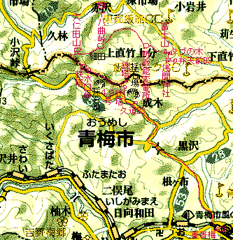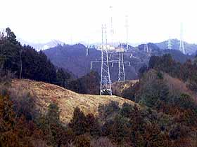 近場の低山の面白そうな無名コースはないかと探して「秩父の低山」で見つけ、この日の2週間前に挑戦。家を遅く出て、飯能から間野・黒指行きのバスの便が悪く名郷方面へのバスに乗り小沢(こさわ)BS下車。小沢峠経由の逆コースを採りましたが、何回か道を間違えた挙げ句突然目の前に現れたのは尾根上を平らにして造られた巨大人工施設。宇宙基地のような異様な印象でしたが正門の表札を見ると「新飯能変電所」。近くをうろつきましたが直竹富士山に続くと思われる尾根道を発見することは出来ず、変電所の取り付け道路をトボトボと下山しました。今日はバスの時刻に合わせて家を出て、参考文献の道順で再挑戦です。 この手の山は、尾根には大体仕事道が通っているので、それほど藪漕ぎすることなく比較的安全にハイカーに出遭わない静かな山歩きとルートファインディングのスリルを楽しむ事が出来ます。 飯能からの間野・黒指行きのバスは名栗川を渡る頃には乗客は筆者のみ。丘陵を1つ乗っ越して直竹川沿いを遡ります。終点近くの弁天前BSで下車。車道を少し進むと右手に立派な浅間神社を発見。「タブの木」への指導標に導かれて急登開始。歩き始めて15分ほどで山頂への直登路とタブの木経由の道が分岐しますので、右へタブの木を目指します。すぐに県天然記念物のタブの巨木があり、その先を登って行くとタブの向うに平野方面の展望が広がります。急登僅かで奥社のある富士山の山頂に着きます。 浅間神社入口。いよいよ縦走開始。小さなコブを越えながら少しづつ高度を上げて行き、この辺で唯一名のある大仁田山を目指します。3〜4個目のピーク手前の森林公社の看板付近は南面が開け、大岳山方面の展望が素晴らしい。その更に先のピークからやや右手に進路は曲り、やがてあっけなく車道に飛び出してしまいます。これは前回下った取り付け道路ですが、逆コースでここを発見できなかったのは当然とも言えるはっきりしない入口です。これで、前回「最後の詰め」は誤りましたが、ここまで通ったコースは概ね間違っていなかったことが判明しました。コース上の尾根が整地され、参考文献にない変電所が建設されていた訳です。この道を左へ進めば変電所ですが、道の反対側に小径を発見。今回はこちらを採り、尾根通しに行くことにしました。道路建設後通る人も希なせいか本日最も藪がひどい斜面で、道はすぐに不鮮明に。僅かの距離を強引に登って尾根道に出ましたが、1つピークを越しただけで取り付け道路に降りてしまいます。ここは尾根の上で変電所の正門(東側)はもう目の前です。変電所の縁を右手から回り込みますが、巨大な施設のため5〜6分掛かります。西側の北端からは巻道もありますが、今日は更にやや南へ回り込んで尾根道を目指します。尚、北側巻道経由で右手に10分ほど下ると前回迷い込んだ広大な鉄塔台地があり、明るく開けていて名栗川流域の集落や山々の眺めが素晴らしい所です。尾根道だった道も1つピークへ登ると右へ巻下っていくので、正面の尾根へ突っ込みます。途中右手からまた巻道に出合いますが構わず尾根を行きます。やがて新所沢線49号鉄塔の所から東電巡視路に入るので、ここからしばらくは尾根に拘らなくても安心で、道なりにピークを適当に巻いて行くので大きな登り下りもなく楽ちんな道です。 やがて、木造屋根付きの石地蔵がある4差路(四十八峠)に出ます。すぐ左下には細田集落が見えます。いい感じの山上集落なので、車道へ降りて里を5分ほど通った先から支尾根上の道に取付いて大仁田山の手前で合流するのもいいのですが、今日は右上数mの墓地前からピークを1つ巻いて次の鉄塔の上を通り、尾根を登ります。登り切って平坦になると、やがて何の変哲もないY字路に。しかし、ここから右へ1分半位で本日の最高峰大仁田山ですので見逃さずに寄って行きます。よく整地されていますが展望のない寂しい所です。 分岐に戻り更に進むと25×40pくらいの金属板に黒ペンキで「成木尾根」と書かれ左右の方向の地名を記した看板があります。2つ目の看板の辺りが遙か雲取山に端を発する長沢背稜の末端部に当たる都県境尾根への合流点です。右は小沢峠方面で、すぐに大仁田山とほぼ同じ高さで明るく開けたピークがありますので、そちらへ行く場合食事にするのは大仁田よりそのピークがいいかも知れません。小沢峠まで例の看板が続きますので迷うことはないでしょう。前回そちらから来たので今回はヘアピンカーブを曲るように左折して都県境尾根を逆方向に行けるところまで行ってみることにしました。(こちらへは先程の1つ目の看板から左方へ巻いて入る事が出来ます) 1つ目のピークを越えた鉄塔からは、両側に眺めが開け、左方はさっきまで縦走して来た尾根で、変電所も見えます。右方は奥多摩方面で幾重もの山並みが望めますが、青梅丘陵雷電山の北の採石場が痛々しく目立ちます。ここからは周囲の地形を観察して