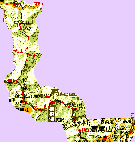 2000年 5月27日(土)曇晴れ間有り 京王線・高尾山口810…915高尾山930…1015城山1025…1105景信山1110…堂所山1154… (190) 65 (△599) 45 (・670) 40 (△727) 44(・731) 18 明王峠1212…1245陣馬山1304…和田峠1316…醍醐丸巻道分岐1340…1441市道山1449… (720) 33 (△855) 12 (695) 24 (740) 61 (△795) 58 1547臼杵山三角点1552…1658元郷BS (△842) 66 (260) 体力度B+ 神経度A+ (歩行合計約8時間15分) ◇5万図 八王子 上野原 五日市 □筆者参考文献 「東京付近の山」(実業之日本社) 「東京周辺の山」(山と渓谷社) 今月、ハイキングに行ってないので心と体が緑のシャワーを欲している。今日は、天気は下り坂で夜になったら雨の予報ですが、朝起きた時点では陽も射しているし、どこかお手軽で尚且つ多少は歩き応えのあるコースへ行こうと思いました。 高尾山から陣馬山に続く奥高尾縦走路は、遙かなる三頭山から続く都県境尾根笹尾根の終末部に当り、都民の定番ハイキングコースです。比較的便利な奥多摩や丹沢より更に交通至便で、新宿から1時間弱で到達する京王線・高尾山口駅が出発点(あるいは終着点)であるにも拘わらず、明るく伸びやかで風光良くコースはなかなかのものです。しかし、そのため人出が多いのは当然の事。静かな山歩きを好む筆者としては、良さと便利さの割には訪れなくなってしまった地域ではあります。 今回、「お手軽で尚且つ少々歩き応えのあるコース」という事で飛びついてしまったのに拘わらず、普通に和田峠で終わるのでは、ありきたり過ぎると思い、戸倉三山の市道山〜臼杵山へつなげる事を考えました。しかし、そうしてみれば結構ロングコース。後半、天気と日没を気にしながらのやや心細い山旅となりました。 長いコースの場合、出来るだけ出発点を奥深い地に、後半を交通の便利な地にするコースの方が、安心して歩けますので、筆者の場合、大抵はそうしているのですが、今回、出発点のお気楽さが勝って、いつもと逆に取り付きやすい方から入ってしまいました。交通至便を生かしてあと1時間早く出発すれば後半部もじっくり味わえたでしょう(^^;)。 ケーブル駅の手前から、左手の稲荷山コースへ入ります。この道は、尾根通しで、時々展望もあるのでケーブル駅−高尾山のルート(他に6号路琵琶滝コース、1号路表参道、ケーブル利用・リフト利用の各ルートあり)の中でも筆者の最も好むところです。途中、ルート名の由来かどうかは判らない稲荷や、都心部方面が見渡せる四阿ピークや南高尾・丹沢方面を見渡せる場所で写真を撮りながら進めば右手の谷を通る6号路が近付いて来て詰めの段階が近い事を知ります。ルートが右へ回り込み、最後の階段に一汗かかされれば、高尾山山頂の一角ですが、折角なので右へ50mほどの三角点を往復してきます。山頂の展望は十三州大見晴台という割には、立木や建造物のために、普通には茶店の横から富士山方面が見える程度です。 いよいよ陣馬山方面へ縦走開始(奥高尾縦走コース)。山頂直下の下りが終わると左手に大垂水峠への分岐がありますが、そちらへ行っても実は一度合流します。その後も何カ所か巻道が現れますが大してパワーセイブにもならないので陣馬山までは風光の良い(あるいは巻道よりすいている(^^;))尾根通しの道を採ります。城山、景信(かげのぶ)山と好展望のピークを踏んで行きます。景信山は山頂手前が茶屋の敷地になっていて、飲食物を注文しない人には居心地が悪いのですが、東の縁からは、辿ってきた尾根や、右に丹沢大山、左に北高尾山稜が望まれます。茶屋の奥の山頂からはこれから行く方面や奥多摩の山々が望まれます。 景信山山頂からこれから行く方面。この先も、さほどの登り下りもありません。縦走路は堂所山の南面を巻いてしまうので、右手の分岐を見付けて登ります。この道は尾根通しではなく、巻き始めてから山腹を強引によじ登る感じで、山頂は稜線に出て少し右手へ行った所です。北高尾山稜コースに少し入った所にある堂所山は誰もいない事を期待していたのですが、狭い山頂は10数人でごった返していましたのですぐUターン。奥高尾縦走コースへの西側の合流点へは穏やかな尾根道です。 名王峠で相模湖への道を分け、陣馬山へ。流石に「陣馬高原」は大袈裟ですが、山頂は、広々とした雰囲気で、展望も広いです。冬場なら、富士山は勿論、南アルプスの好展望台でもあります。この日は、季節的なこともあって、しかも天候も下り坂で、残念ながら視界が利かない日でしたが、そういう時、目立つのはやはり先へ続く笹尾根で、生藤山方面が壁のように立ちはだかります。ただ、茶屋の陰に隠れて足下の藤野周辺の小さな山たち(藤野鷹取山、金剛山・鉢岡山)を確認することが出来なかったのは残念です。 ここでのんびりして、ここから下ってしまってもいいのですが、本日は初志貫徹で臼杵山方面を目指すことにします。ハイキングを始めて間もない頃、初めて高尾山から歩いた時にはここまで随分長く感じたものでし
