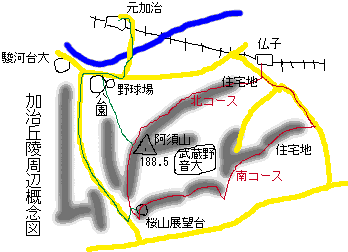 桜山展望台からは正規の加治丘陵コースを東へ辿ります。この道は、元々サイクリング道路なのですが、今では、専ら散策の人か、あってもジョギングの人とすれ違うくらいなのでのんびり歩けます。やがて、車道に出合います(次項参照)が数m右手からコースは更に続きます。この辺へ来ると右側には住宅地が迫っています。次に車道に出合うとサイクリングコース終了。車道を左へ行けば、やがて先ほど見送った車道を合わせ仏子駅へ行くことが出来ます。この道は始め左側、やがて右側に縁石で仕切った歩道が付属していますのでそこを行きます。線路の少し手前で右に入って、南口(裏口)から駅へ入った方が若干近道になりますが、道なりに踏切を渡ってから右に北口(駅の正面玄関)回り込んでも構いません。【参考】加治丘陵コース 1996年 9月16日(月)晴 西武池袋線・仏子1600…1653桜山展望台1713…1755西武池袋線・仏子 (80) 53 (190) 42 (80) 体力度A 神経度A(歩行合計約1時間40分) ◇5万図 川越 青梅 □筆者参考文献 「埼玉県の山」(山と渓谷社)本コースの概要は、北コースと南コースの2本の主に尾根を通る道が、「<」形に西で接合されている感じです。その間の谷は、武蔵野音大の敷地になっています。 仏子駅から南西方向へ数分。その谷に少し入った所から、北コースの東端の入り口へ登のですが、この辺は棚田状の住宅地となっていて、道がわかりにくい。ちょっと、沢沿いに行きすぎて、戻るのも業腹なので右手の林の中の仕事道に突っ込みました。数分の登りで、無事メインルートへ合流。 西の屈曲点近くに、188.8m三角点峰 阿須山がありますが、山頂は展望がなくまだ草丈の高い季節ですので、今回は巻いてしまいました。 屈曲点付近は尾根通しではなく、西側へ巻き下ってから、「桜山展望台へ400m」の看板見て、左後ろ方向へ、ヘアピン状に登り返します。(前述ショートカットも可能) 本日のハイライト、桜山展望台からは、360゚の好展望が得られます。山塊から少し離れているため、近くの山が壁にならず、視界が開けます。気象条件がよいときにまた来たいと思わせる所です。丹沢から奥多摩、奥武蔵の眺めは圧巻でしょう。 展望台からは、南コースを東進します。20分弱で車道に出ます。この道を左に行けば、仏子駅への近道ですが、歩道がなく車の脅威に晒されますのでお薦めで来ません。直進すると、遊歩道が続きますが、右側は住宅地になっています。5分強で南コース入り口。車道を左へ行けばやがて先程の近道と合流し、仏子駅の近辺へ。 ▲項目索引▲ ◎トップページへ戻る◎ |