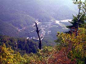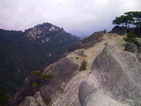 10月も下旬、しかし、近場の藪山を漕ぎ進むにはまだ草や虫も多い。前日、遅く起きて中央線梁川の寺山(今年2月行った)へ行ってみたものの、山道に入ってすぐ転進(「退却」とも言う(^^;))。上り電車で藤野まで戻り金剛山(3月に行った)へ登ってきました。今回は鉢岡山や宝ノ峰へは周らず423m峰の展望が目当てで、新和田集落北の鞍部から下る休憩込み1時間強の小さな周回コースでした。足慣らしにはなったと言うことで、この日は早く起きたので、かねてより狙っていた羅漢寺山へ行く事にしました。以前、南ア北部の眺めを求めて訪れた白山(しろやま;そこも白いカコウ岩で出来ている)から背後に峨々として白く光って見えた山が羅漢寺山でした。 羅漢寺山は日帰りの山としてはアプローチが比較的長く交通費もかさみますが、訪れてみて期待通りの価値はありました。往復にかかる時間も、山好きにとっては好ましい景色を賞でながらの旅なので退屈しません。 ガイドブックでは甲府駅から金桜神社経由昇仙峡滝上行きバスで御岳郵便局BS下車となっていましたが、そのバスは少ないので、グリーンライン経由のバスで終点昇仙峡滝上BTに下車しました。ここからバス道をそのまま登っていきます。金桜神社経由だと対面から来るので、羅漢寺山分岐点に近いバス停が利用できた訳です。左にロープウェイ山麓駅(仙峨滝駅)を見てしばらく進むと右手に大きな堰堤が見えるくらいで、残念ながら谷の両側に峨々とした岩壁はなく、平凡な風景が続く道です。交通量は比較的少ないのですが、広い車道の割にはきつく登って行き、羅漢寺山分岐点まで2Km強で約100mの標高差を稼いでしまいます。 歩き出して30分ほどのところ、左に分岐する舗装道が羅漢寺山への道です。この道は左右にくねりながら今までより更にぐいぐい高度を上げていきます。しかし、未舗装になるころ雑木林の美しい穏やかな尾根上の道となり、非常にいい気分。ロープウェイを使わないでこのコースを辿って良かったと実感します(^^)。 パノラマ台へ向かう雑木の林道。やがて、左方の視界が開けたと思ったらロープウェイの軋む音が聞こえ、僅かな登りで神社、ロープウェイ山上駅(パノラマ台駅)前、展望台ピークへと続きます。この辺は、ロープウェイ利用の観光客で賑わっています。ロープウェイ駅前から弥三郎岳までは、本来は10分ほどの道のりだと思うのですが、あまりに景色がいいので写真を撮ったり、また足支度の良くない観光客に混じっての行動ということで、結構時間がかかります。展望台ピークから木の枝越しに見る弥三郎岳は、「えっ、あんなとこ、登れるの?」と言う感じですが、こういうピークの常、絶壁の裏側(左方)からするすると巻き登る事が出来ます。 パノラマ台付近より弥三郎岳を望む。弥三郎岳の山頂三角点標石の周囲は何故か賽銭だらけ。付近は、記念写真を撮る人などが入れ替わり立ち替わりやって来ますので、その先の一段下がった岩稜上で食事にしました。眼下には、アプローチで見えた堰堤(荒川ダム)が堰き止める能泉湖や、昇仙峡滝上BT周辺の駐車場等がかなり急な俯角で見下ろせましたが、あいにく遠望が利く天候ではなく、南ア等の山々を見ることは出来ませんした。 弥三郎岳付近より昇仙峡滝上BT方面を見下ろす。弥三郎岳からは、先ほどのロープウェイ駅前へ戻りますが、白砂山方面への分岐指導標を見落としてしまい、神社より先、来るとき寄らなかった「うぐいす谷」(?)展望台を往復(所用数分)してしまいました。白砂山方面への分岐は、ロープウェイ駅前付近、食事処などで一番賑わっている場所にありました。筆者は、人が居ると足早になってしまうので、人混みにある分岐点はいつも見落とし勝ちです(^^;)。 この道は始め山腹をジグザグに下って行き、谷に突っ込むような印象があり、「下山道に入ってしまったのではないか」と不安になりました。しかし、その後、山腹を左に辿り、低くなった尾根に合して一安心。僅かで、左へ白砂山への分岐があり、樹林帯を登っていくと、白いピーク。ここが白砂山山頂と思いましたが、そこは白いカコウ岩の岩稜の始まりでした。ここの岩は締まっていれば靴底のグリップが大変良いのですが、風化して砂になった所は、ずるずると滑ってビビります。一部右手樹林帯へ逃げて、岩稜を辿れば、末端部の山頂に着き、弥三郎岳が美しく望まれます。末端ピークより1つ手前のピークの方が高いような気がしましたが、何れにしても、殆どの観光客はここまでは来ないし、いくつもの白いピークが連なるので、食事は混雑する弥三郎岳より、こちらの岩稜上の何れかのピークを方が良いかも知れません。 白砂山の岩稜と弥三郎岳。先ほどの分岐へ戻り、尾根の西面を行く道も、この時期、色づき始めたばかりですが、いい感じの雑木林です。しかし、獅子平方面への分岐を過ぎると溝状にえぐれ、しかも踏み固められていない、ちょっといやな感じのジグザグ