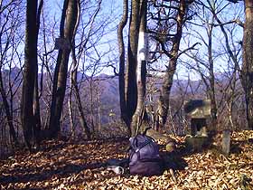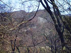 2000年12月 9日(土)快晴 JR・大月1008…尾根末端1038…叉平山1135…1214花咲山1233…1317アンテナ付近1324 (360) 30 (380) 57 (610) 39 (761) 44 (640) …車道1340…NEC1355…大月インター入口1426…1452大月 16(460) 15 (420) 31 (360) 26 体力度A+ 神経度B- (歩行合計約4時間30分) ◇5万図 都留 □筆者参考文献 「中央線の山を歩く」(藤井寿夫) 花咲山(参考書によると「梅久保山」が正しいとのこと)は大月の北西、桂川左岸、浅利川と真木川に挟まれたミニ山塊にあります。五万図にも山名注記のない無名の山ですが、この季節、静かな山歩きにはもってこいです。実際、山中1人の人間にも出会いませんでした。 大月駅は出入口が南側だけなので、駅前広場から裏道を右へ行き、渡線橋を渡りますとすぐY字路ですので左を選びます。道は、段丘崖に沿うように右から弧を描いて下って行き浅利橋を渡ります。道なりに行き、中央道をくぐった辺りの左上が取付くべき尾根の末端部なのですが、直登する小径がないので、そのまま車道を川沿いに300mくらい進んで、廿三夜碑の建つ逆Y字路を左へ折り返すように入り、右手に団地を見て登って行くと中央道のフェンスに突き当たります。 この辺が花咲山からの尾根の末端なのですが、左(南)側は何かの造成工事中で切り崩されて人工の斜面になってしまっています。人工斜面ともともとの右斜面で稜線を形作っていて、そこはコンンクリート製の排水溝になっていますので、それに沿って登って行きました。標高差40メートルも一気によじ登ると小祠が現れ、その右手からは、笹藪の中のトンネルのような道が始まりますが、しばらく我慢して行けば、気分の良い雑木の尾根道となります。ただし、落ち葉で足下が滑るので、傾斜がきつい所等では難儀します。次の右斜面をトラバースする部分では滑って転げ落ちそうでビビりつつ慎重に歩を進めました。 その後は小さなピークを越えながら、いい感じの尾根道が続きます。ただし、左手の眼下はゴルフ場で、先ほどから尾根上に「花咲CC」の杭が続いていたのはそのためでした。やがて、ややはっきりした岩頭へ登り着きます。ここは、叉平(さすでいら)山らしいのですが、4等三角点(610.2)の標石を発見する事が出来ませんでした。 叉平山近く、樹間より稚児落し方面。次は五万図で600m等高線が小さな輪になっているピークで、真ん中は饅頭のように岩が頭を出しています。これを下ったコルには石仏があり、峠っぽいのですが、左右の道は廃道風です。ここからいよいよ花咲山への登りですが、全般的には叉平山から見て想像した感じより穏やかな道です。登るにつれ、今まで高川山に隠れていた富士山もようやく顔を出してきました(^^)。やがて肩のような所で左へ回り込んで最後のひと登りをすれば花咲山の山頂です。周り360度、全て立木に覆われていますが、密度は低いので、その先にどんな山があるかは分ります。 花咲山山頂。南西に延びる尾根を下って、日陰を登り返した717mピークも岩っぽく、ここから立木越しに見る花咲山は結構とんがっています。更に下って、小さなピークを2つ越え、3つ目を右から巻いた先に礫岩が露出した場所があり、そこからの滝子山を中心にした西面の展望はすばらしいです。 礫岩が露出した尾根上より滝子山。その先、尾根が左へ分岐しているのに気付き、そちらへ入ってみると、すぐにU局の中継アンテナ施設がありました。ここから尾根を南へ下れば真木を経ずにR20方面に出られるはず。施設のメンテナンスのための道があるものと思っていたのですが、それらしきものはなく、また、その少し先で尾根が見た目標高差10mくらい急激に落ち込んでいるので、諦めて元の道に戻りました。 やがて、道は明らかな下りとなり、眼下の人家も大きくなって行きます。この下り道に電線があることからも、やはりアンテナ施設のメンテにはこちらからの道を利用しているものと思われます。 子供達の声が聞こえるようになると、やがて車道に飛び出し、川の向こうに校庭が広がり、その向こうには三つ峠や鶴ヶ鳥屋山あたりが大きく望まれます。車道を左へ辿ります。この辺からですと、初狩駅の方が少し近いのですが、列車本数等を考えて、大月駅へ戻る事にしました。 高川山を眺めつつ1kmほど歩くと、NECの工場があり、その先は中央道が塞いでいますので左折し道なりに行くと左へループを描いて中央道の下をくぐり、橋を渡ったらR20に出ます。バス停もありますが次のバスまで1時間以上あったので、左手に今日巡ってきた尾根続きを見ながら大月駅を目指しました。途中、R20から左に平行する道に入り、突き当たったら右へ小陸橋で線路を跨げば、すぐ左の裏道が、今朝駅から来た道の続きの部分です。 帰り道、R20より花咲山(右)と717mピーク。▲項目索引▲ ◎トップページへ戻る◎ |