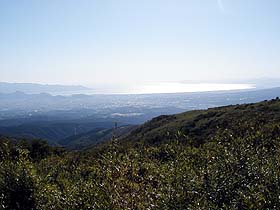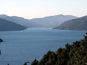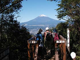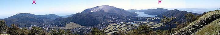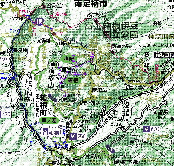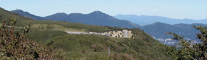 箱根外輪山のハイキングと言えば、銀座通りは乙女峠から時計回り方向にある金時山、明神ヶ岳方面(「乙女峠〜塔ノ峰」)ですが、反対側にも行ってみたいと思っていました。前日から急に気温が下がったものの、まだ葉が落ち草が枯れる季節ではありませんが、しっかりハイキングコースがあるようなのであまり藪はないだろうと思い、行ってみました。 小田原駅前からバスに乗り、仙石で下車。乗っていった桃源台方面往きのバスはここで左折してしまいますが、そのままバス通りを直進すれば、乙女口まで徒歩でも30分も掛かりません。しかし、交通量が多くてちょっといやな感じなので、運良く利用できればこの区間もバスに乗った方が安全かも知れません。私は初めからバスはないものと決め込んで歩いていたら、後ろからバスに抜かれました(T_T)。 乙女口まであまり歩行者は見かけなかったのに、山道に入ると、流石、日曜日の有名観光地、先程のバス利用者なのか?結構人がいます。単独行の身軽さで何組か追い越しつつ、ぐいぐい登ればさほどの苦労もなく乙女峠に着きました。 乙女峠。乙女峠はハイカーで賑わっていましたが、殆どの人は金時山方面に向かうので、逆方向に向かって歩き出した途端、あまり人に会わない静かな道となりました。しかし、道は大変良く整備されていて、藪もありません。のんびり、ゆるく登って行くとパラボラタワーの目立つ丸岳山頂で、ここで急に南東面の視界が開けます。目の前にはものすごい、山と湖と海まで入った大パノラマが広がるのに、山頂には数人(^^)。今頃金時山などでは、こぼれ落ちそうなほど人のでごった返している事でしょう。 ![]() 丸岳からの大パノラマ。 これから進む方向に目をやると芦ノ湖と駿河湾の間を稜線が砂州のように仕切っている感じで面白い眺めです。稜線に沿って走る車道に自動車が数珠繋ぎになっていて陽光で輝いているのも見えます。 下り始めますと丸岳から先は、何故かササやススキ等のブッシュのみで、木のない明るい草原の尾根となっています。しばらく下って行くと何か臭い感じ。風は大湧谷方面から来てるようなので、もしかしたら、火山性のガスのせいで森林が育たないのか?なんて思いました。 かなり下ると樹林の中の道となります。この辺から先は、右側を併走する車道「芦ノ湖スカイライン」に接したり離れたりして行くことになります。 やがて、下り坂の途中に唐突に「長尾峠」の標識。一応左手に道が分岐しているようですがあまり峠らしくありません。「長尾峠」標識から5分ほど行ったところに「展望駐車場」の案内標識があり、その先の指導標に従って右へ入ってみました。この道、駐車場の直前は何故か藪で、かき分けて降り着いた駐車場も、確かに富士山は見えますが、ただの広場でトイレやドライブイン等の施設はありません。 100mくらい先に見える料金所まで車道を行きますと、料金所の手前には清潔な水洗トイレがありました。駐車場からここまでハイキングコースに戻る道がないのですが、料金所の50mくらい先は鞍部なのでそこからハイキングコースに戻れそう。料金徴収員に断って、車道の縁を鞍部まで通らせてもらい、無事ハイキングコースに復すことが出来ました(^^)。ここから箱根峠まで、右手の車道(芦ノ湖スカイライン)は自動車専用道路なので、歩くわけには行きません。好むと好まざるとに拘わらず、ずっとハイキングコースを通ることになります。 両側が背丈を超えるほどの高さのブッシュになっているところもありますが、湖尻峠までは樹林はなく明るい尾根道を行きます。ピークを巻く車道と尾根を行くハイキングコースが接する鞍部付近にはドライブ客休憩用の駐車場&園地が作られています。3つ目くらいの園地「芦ノ湖展望公園」で一休み。ベンチに座ると正面に愛鷹連峰が目立ち、勿論逆方向には芦ノ湖等カルデラ内が望めます。 目の前のピークを越えて、湖尻峠へ下ります。 ![]() 園地の奥左に丸岳を振返る。中央に金時、更に右奥に丹沢。 下りきった鞍部、車道が三差路になっているところは、地名を現地の標識に見いだすことは出来ませんでしたが、湖尻峠です。尚、湖尻を殆どの人はコジリと読むようですが、昭和36年発行の5万分の1集成図「箱根附近」にはわざわざウミジリとフリガナが付けてありますので、それを見て以来私的にはウミジリの方がしっくり来ます。 もし、ここまでで、十分歩いたと思ったのなら、ここから桃源台に下って、芦ノ湖遊覧船で箱根町へ行くのも一興だと思います。ここから先、エスケープルートはありません。もっとも、ここから先も、交通量のある車道が併走しているので、深刻な事態が生じた場合は車を呼ぶなど何とかなりそうですが。 ここから三国山への登りは再び樹林帯となります。本日の累積標高差は大したことはないのですが、ナマった体に、歩き出して4時間くらい経っての標高差250m近い登りですので、山頂近くの登