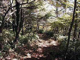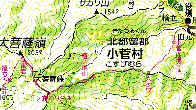 いよいよハイキングの季節到来。1日のハイキングは久々なのでそこそこ距離はありつつ標高差(登り)の小さいコースを希望、しかも寒くなる前に標高が高めの所へ行っておきたい、と言うことでこのコースを選択。昔の青梅街道を甲府盆地から奥多摩側へ抜けるというスケール感もあります。登りは少々で、後はだらだらとのんびり下れるのではないかと思ったのですが。通常は裂石から2時間掛けて歩いて登るところ、福ちゃん荘までタクシーを奮発(5380円でした)。ここから唐松尾根を登ります。初めは林道風、やがて樹林の山道となって、更に上部はススキの斜面。振返ると富士山から甲斐駒までのパノラマが広がるので、ここより登ったからと言って更に展望良くなるとは限らないと思い、しょっちゅう写真を撮るために立ち止まりますが、時間経過による気象条件の変化を別にすれば、最上部の雷岩まで上がったとき一番広い展望が広がるのでした。でも、デジカメなので、フィルム代・DPE代等発生せず、重複ショットもそれ程気になりません(^^;)。 雷岩のすぐ左で稜線に出て、左へ僅かな下りと登り5分ほどで大菩薩嶺三角点。以前読んだガイドブックには「頂上は樹林のため展望がないうえにアンテナが建っていておもしろくない。」とありましたが、山深い静けさがあって憩うのにいい感じの所です。現在アンテナはなく、また、昔来たときあった大菩薩嶺の由来を説明する看板もなくなっていました。 昔あった看板(1971.05.02撮影)。三角点ピークからここまでを頂稜部と言っていいくらい標高差のない雷岩まで戻り展望を満喫、写真を撮りまくります。快晴ながら、今朝の中央線車中からの眺めは若干モヤっていましたが、案の定、遠景で明瞭なのは富士山や南アルプスの2000mくらいから上部です。 雷岩からの展望。ここから大菩薩峠までの明るい尾根道は本日のハイライト。普段はガツガツ歩くときが多い筆者も写真をとりつつのんびり歩きます。大菩薩峠は人混みのため立ち止まらず通過。ここから、打って変わって樹林帯の登り(熊沢山)となり人影がなくなります。嶺からはほぼ下り一方を期待していた筆者としては少々バテましたがピークの反対側からはまた笹原の明るい鞍部が望まれ、下り着くと「石丸峠 1957m」の標識があります。しかし、地図を見ればその標高は次のピーク(天狗棚山)のものでこの辺は1920mくらいの筈です。このまま行けば小金沢連嶺ですが、鞍部から僅かに登った所(天狗棚山手前)に骨だけの小屋(?)があり、ここから左へ牛ノ寝通りコースが分岐しています。 牛ノ寝通り側から分岐点を振返る。流石に昔の青梅街道、旧峠道のためか、人通りは少ないのですが完璧に整備された道で、時折「小菅の湯」を示す道標があります。しかし始めは「牛ノ寝」というのんびりした名の割にぐんぐん下って行く部分が多いです。 やがて小さな伐採地があり、クイのようなものの見える僅か左の稜線へ登ってみれば割れた「榧ノ尾山」の標識と三角点標石があり、正面には小金沢山や雁ヶ腹摺山方面が高く望まれ結構下って来たことを実感しました。 ここからは分岐の大ダワまで穏やかな道が続きますが、標高1320〜1420mの間で緩い下りと登りが繰り返し、普通の体力ならのんびり歩けるであろうこの道も、今日の足弱な筆者にはやや必死に歩く感じでした。 牛ノ寝通りの道。ショナメの鞍部を過ぎて、大マテイ山手前の大ダワは小菅への分岐点ですが、名前からイメージするほど顕著な鞍部ではありません。手前が小規模な伐採地となっており、飛竜山方面を眺めながら小休止。気温も上がってこの時期虫が多いのがちょっといやな感じ。 ここから大マテイ山へ続く稜線を離れて左へ下って行きます。30分強でY字路となりますが、右の「小菅の湯」方面へ下ると遠回りになりますので、左「小菅村」の道へ入ります。この辺、一旦傾斜も緩みいい感じの美林です。さらにどんどん下り、民家の脇から車道へ出たら道なりに下って行けば村役場が見つかり、正面に村内路線の、旅館側に奥多摩駅−小菅路線のバス停があります。 雷岩〜大菩薩峠は、観光地のような人の多さでしたが、その後は石丸峠付近で2組計4人、牛ノ寝通りではすれ違った人計2人、大ダワで2組計5人に出合っただけで、「整備が行き届いているのにすいている自然林の道」という点では合格です。あとは、「牛ノ寝」の名のようにのんびりした気分で歩けるかどうかは体力次第(^^;)。 ▲項目索引▲ ◎トップページへ戻る◎ |