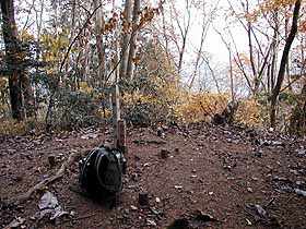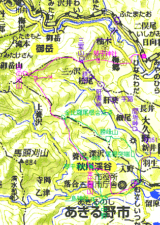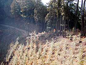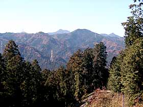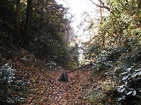 2002年11月30日(土)晴 JR青梅線・二俣尾751…921三室山930…949新所沢線23号鉄塔959…肝要峠1017… (220) 90 (△647) 19 (530) 18 (450) 83 間坂峠1140…1210白木の社1220…1310五日市線・武蔵五日市 (270) 30 (340) 50 (180) 体力度B- 神経度B (歩行合計約5時間10分) ◇5万図 五日市◇5万図 八王子日の出山〜日向和田ルートは吉野梅郷を通ることもあり、早春の人気ルートですが、途中、三室山(647m三角点峰)を巻いてしまっています。その三室山から南東に武蔵五日市の北、日の出町萱窪付近まで延びているのが通矢(つうや)尾根です。 通る人も希なこの尾根に、付近の地名にもない「通矢」という風流な(?)名が付いている由来を知りたくてネットで検索してみると、「平安時代、勝峰(かつほ)山にたてこもった反乱軍・平将門めがけて放った官軍・俵藤太秀郷の矢が、平井川を飛び越えてこの尾根をかすめた。」という事ですが、よほど離れた場所から射ったのでないと勝峰山と通矢尾根では方向が余りに違う気もします(^^;)。 この尾根は、標高も低く、仕事道を拾って行くようなルート故、藪っぽい事が予想されるので、もっと季節が進んだ真冬〜早春に行こうと思っていたのですが、富士急沿線の文台山へ行来たかったこの日、午後から雲の出る天気予報だったため、先日(11/16)の御正体山〜石割山のように殆ど終日霧の中と言う事が懸念され、急きょ、近場のこのコースへ行くことにした訳なのです。 三室山までは、せっかくなので、今まで通ったことのない愛宕山経由としました。 二俣尾から左へ進み、「吉川英治記念館」の標識に導かれて右折、小学校の前を下って奥多摩橋を渡り、広いバス通りに突き当たって左折、程なく右手に愛宕神社入口の石の鳥居がありました。少し先の吉川英治記念館付近まで行って引き返し、愛宕神社に入ると、日ノ出山方面を示す指導標に導かれて登り始めます。 神社で高年登山者と遭遇。この人はあろうことか平然とラジオを鳴らしていますので、逃げるように先へ進むと尾根を乗越して下り気味。やはり、尾根を登るのがルートのようで、あわてて引き返すと、その間に追い抜かれ、尾根の登りでは例のラジオマンのすぐ後ろになってしまいました。 少し静止して、追い付かないように行きますが、ラジオマンは昔ながらのスタイル(重い荷物を背負って、ゆっくり、ゆっくり歩く)なので、日帰り軽快登山(荷物を軽くして、スピード重視で行動)を旨とするこちらも超スローペースにならざるを得ません(^^;)。 忍び難きを忍ぶこと1時間ほど、送電鉄塔の所でかのラジオマンが休息するすきに一気に抜き去ります。これで、聞きたくないラジオを聞かなくて済みました(^^)。ここから10分ほどで愛宕神社の奥社と見られる愛宕山を通過。更に進むとはっきりした道は尾根を右に逸れます。これは三室山の西で日の出山からのルートと合流する筈のものですが、遠回りを嫌ってやや藪っぽい尾根道を直登すれば頂稜に直接登り着くことが出来ました。左へ40m程で、三室山の三角点。誰もいない山頂で本日最初の大休止・軽食(カレーパン)。 三室山山頂三角点。東へ下って、日の出山〜日向和田ルートを横切れば、いよいよ通矢尾根ルートに突入。ここから藪っぽくなった道を更に下って行きますが、右下から工事の音。実は、右側少し下の山腹を林道が平行しているのです。やがて下り切る手前で、道は倒木(と言うよりは伐採した木)にふさがれて少し迂回を余儀なくされます。しかしその後は歩き易い送電巡視路となって、新所沢線23号鉄塔に着きます。ここからは右後ろ大岳山方面や、前方肝要集落、その上送電線の向うに臼杵山方面、更には丹沢山塊を眺めることが出来ます。本日2度目の大休止・軽食(アップルパン)。しかし、青さも残る草地の上には虫も飛び、やはりもっと季節が進んでから訪れるべきだったと後悔します。 その後は、終盤の白山神社手前ピークまで、終始林業のためと思われる仕事道を行きますので、道が不明瞭になる所は殆どありませんが、区間によってよく手入れされていたり、藪っぽかったり色々です。指導標はありませんので分岐がある毎に、KKD((^^;)経験と勘と度胸)を試される事になります。勿論、地形図、コンパス、皮軍手は大活躍です。GPSも持参したのですが、長いこと使わなかったので、死んでしまったようです。全然、衛星を捕捉してくれません(ToT)。 鉄塔から5分ほどの分岐(左の支尾根へ入りがちなので要注意)から右へ林道めがけて急降下します。降り着いた鞍部では林道に数mまで接近。この辺りは本日のコース中一番藪が濃くなり、ヘビ等の出現の可能性にビビリながら通過。ジャージのズボンはマジックテープの原理で草や実だらけ。ここでも訪れた季節を後悔します。 登り返してしばらく山中を行き、やがて、下り着いた鞍部は肝要峠。左右の峠道の他、林道が右後ろから左前へ乗越て行くので、林道を横切って向うの法面の縁を登って尾根道に入ります。少し進むと左へ梅ヶ谷