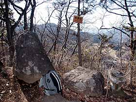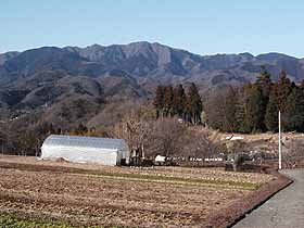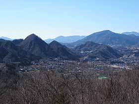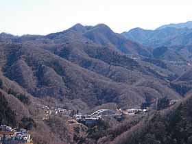 2003年3月2日(日)快晴 JR中央線・藤野1152…1250京塚山1300…1330一本松山1345…天神峠1425… (210) 58 (350) 30 (△337) 40 (320) 30 1455金剛山1510…葛原神社1540…1624藤野 (・491) 30 (280) 44 体力度A+ 神経度A+ (歩行合計約4時間10分) ◇5万図 上野原 □筆者参考文献 「中央線の山を歩く」(藤井寿夫)朝日夕刊マリオン「山便り」の記事に従って藤野丘陵を歩いたのは96年6月でした。汗だらだらの季節に、藤野駅から道の傍らに点在する野外オブジェを愛でつつ、一本松山−金剛山−藤野駅とメインルートを歩いたのですが、その後新たな参考書で追加情報も仕入れたので、初夏よりは適期と思われた今回は前回より少し大回りに歩いて見ました。 藤野駅前のR20は狭くてR20には見えません。少し右(西)へ行くと相模湖上流部を渡る弁天橋への道が左へ下って行きます。弁天橋を渡って左へ行きますが、右がメインルートで、何れも一段上の車道へ東西で通じています。車道は右へ水面から離れて更に右へ分岐してくねくねと登って行くと一段上の広い車道へ突き当たり、少し左へ行くと右手が園芸ランド事務所の入口です。 戻るように登って行くと、売店もある駐車場の手前右に遊歩道の入口アーチがあり、入って行くと、遊歩道の証明か白いラチというかサクというかガードレールのようなものがあり、これは本日のコース中「遊歩道」とされている道では至る所に見られます。右に沢を見る道は枝沢を渡って本流の橋を渡る頃には、ナラ・クヌギの美林となって左岸を登って行きますが、迷う恐れのない明瞭な道なのにやたらと気にビニール製と思われるリボンが結んであり、先程のラチといい、いささか興をそがれました。その後、右へ分岐する道がありましたが、これが主稜線への道だったかも知れません。再び沢を渡った道はUターンするように右岸を登るともなく伝って、入口の売店の上へ戻ってしまいます。 このまま下って振り出しへ戻ってしまうのかとの不安もありましたが、道也に行くと照明施設もある広い運動場の手前に「山火事注意」の赤い看板があって、右へ尾根通しに登って行く道がありました。やがて、左へ運動場の背後に回り込み、更に登って行けば主稜に突き当たりました。右へ5分ほどで京塚山(石山)です。 京塚山からは立木越しに丹沢主脈や、特に大室山が目立ちます。また、ロープをくぐって(^^;)南東の崖っぷちに立てば、石砂(いしざれ)山の双耳峰が麗しく眺められました。奥久慈袋田で月居山を見た時のような気分です。 京塚山より石砂山を見る。京塚山から西へ5分ほどのピークは直進すると枝尾根を下ってしまいますので、あわてて引き返し僅かに右へ下った後、すぐ左が主稜のルートです。主稜を行くとメインルートは左へ巻くところ、右、尾根通しの道を指導標が指していますが、完全に錆びていて行き先が読めません。もしかしたら、一本松山への直登ルートかも知れないと思って登ってみるとあっけなく小ピークに到着。坊主山でした。 そのまま先へ下るとすぐメインルートに復します。しばらく後の分岐で比較的新しい指導標が倒れたまま「右一本松」を指しているのでそれに従い右へ行くと、頂上手前と思われる地点、OL標識「I」の所にまた分岐があり、少し右へ巻いた後更に左へ登る分岐を行けば三角点のある一本松山でした。 ここからは西側が開けて、相模川上流方向、高柄山、鶴島御前山、四方津御前山、扇山、権現山の眺めが抜群です。相模川本流は当然、鶴島御前山と四方津御前山の間を通っているのですが、ここからの眺め的には、まるで四方津御前山の後ろ(右=北)の盆地様に開けたところ(上野原の河岸段丘上の市街地の向こう)を通っているように見えます。 一本松山より、手前鶴島御前山と四方津御前山、右奥扇山、中央最奥滝子山。ここから名倉小学校方面へは直接下る道がありますが、先程までの遊歩道が良い道過ぎてこちらを通る人が少ないのか笹藪が深そう。今日は気温が高いので藪漕ぎする気分にもなれず、OL標識「I」の所まで戻り、一本松山の南側を巻いて舗装車道へ出ます。ここにも遊歩道入口のアーチがありました。 平坦な車道を南へ辿ります。この辺は、一本松山の山塊と金剛山の山塊を低くつなぐ広い尾根の上に当たり、ちょっとした高原情緒というか桃源郷の趣を感じます。左手名倉小学校の校庭の向こうにもう一つの金剛山(約420mの双耳峰)を眺めながら行くと右手に酒屋があり、その先右手に葛原(とづらはら神社)の石段があります。石段を登って境内を通っても、すぐ先のY字路を右へ入っても金剛山へのメインルートの登山口へ行けますが、今回はY字路を左へ行き、車道を天神峠(日向峠)まで登って尾根通しに金剛山山頂を目指すことにしました。 天神峠のやや手前で左(東)高倉山(△378.7)への登路を見送り、峠の切り通しの先から右手の石段を登ります。更にロープもある急登2ヶ所を登り、一段落かと思いきや、石の小祠ピーク等いくつものコブを越えて登って行