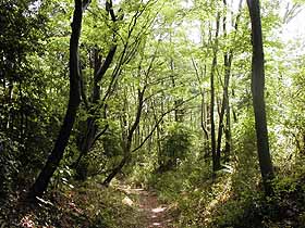 2003年6月1日(日)曇一時雨 JR・相原1301…山道入口1312…1341七国峠1351…1353大日如来ピーク1408… (140) 11 (150) 29 (180) (△223) 18 東京家政学院前1418…朱雀路1431…開都入口1441…1503相原 (160) 13 (190) 10 (160) 22 (140) 体力度A 神経度A+ (歩行合計約1間55分) ◇5万図 八王子東京周辺のハイキングで七国峠と言えば、飯能の南、東青梅からツツジの名所、霞丘陵ハイキングコースを経て辿ったりする場所が第一に思い浮かびますが、今回行ったのはそこではなく、八王子の南、町田市との境の東西方向の尾根上の七国峠です。台風崩れの低気圧の影響で、曇り基調でゆっくり回復予報のこの日曜日、大リーグを見た後、ハイグレードな散歩という感じで、新緑に漬かる気分で出掛けました。 ネットで検索してみると七国峠付近には鎌倉古道が通じ、ハイキングと言うよりは史跡の道が整備されているようです。この付近、八王子側は宅地開発で立入禁止のため、町田市の相原周辺を歩くことになります。五万図で見ると、JR・相原の西側から住宅街を経て北西に登って行くのが最短のようですが、それでは余りにあっけない感じなので、峠へは市境の稜線を東から辿ることにしました。 改築成った相原駅の東口から、造形大〜八王子方面への車道を北上します。先程、京王八王子からJR・八王子まで歩いた頃は陽も射していたのに、今はどんより黒雲も層を成す空模様です。しかし、周りは栽培、自生含めて花が多い道です。反対運動の看板も立つ乗馬クラブを右手に見た先、五万図が示すあたりに、左へ山道の入口を見つけました。指導標はなく、車道とも思えるような広いを緩く登れば、すぐに尾根上の道となります。この辺、早くも新緑の雑木に囲まれた、幸せな歩程です。 しかし、すぐに右側(北側)には立入禁止のサクが現れ、その後、北側の展望が開けます。視界の右側は緑豊かな森林、そして左側は、宅地開発のために伐採後、整地された赤茶けたベアグラウンドです。このころ、ついに細かい雨が樹木に当たる音が聞こえます。 稜線の北側。そこから先、道は細くなり、ぬかるんだ谷に降りたり、草地やササが被る道を行ったりで靴やズボンは水が浸透し、泥も付き、顔にはクモの糸が掛かり、前日までの雨のなごりと現在この天候ではやや不気味な道です。この辺りに限ってはやはり冬枯れの季節向きかも知れません。 尾根道になってちょっと行った先、五万図上「峠」の字の南東の鞍部は、相原駅からの最短ルートとも思われた太い道も登って来ており、ここが七国峠かと思いましたが、指導標の「七国峠」は更に先を指していました。 そのまま、道也に尾根のや左を行くと、やがて右後ろから太い道を合わせ、すぐ先の指導標に「七国峠」とありました。五万図「七」の字の南西、北側から回り込んだ辺りです。目の前のY分岐、指導標によると左・「丸山表」、正面・「鎌倉古道」で、一見こちらが西のようですが実は南向きで、右・「お大日さま」方面に直角に曲がって登って行く道が西方向です。 程なく登り着いた広いピークには先程の指導標から予測されたように大日如来像があり、説明板もあります。また、その左後ろには「七国山関七州見晴台跡」と彫られた石の標柱もありますが、樹林のため展望には恵まれません。ここが五万図223.1m三角点ピークの筈なので標石を探しますが、なかなか見つかりません。草に埋もれかけた三角点標石をやっと見つけたのは、右手奥の端っこで、「大切にしましょう」の標柱も倒れて朽ちかけています。 大日如来像がある三角点ピーク。更に道也に行き次のY分岐は左を選べば、雑木の道も後僅かで、やがて浅い谷のような平地に下り着き、左・休耕田のような草地、右・植林の境の道となります。既に雨は止んでいます。程なくバス通りに突き当たった正面は「東京家政学院」です。バス停は数十m左で、更にその先100mくらいを左折して裏道に入ります。 やがて道は低い尾根を緩く乗っ越して行くので、峠にあたる辺りでは前方に橋本の市街地が望まれます。この地点、左から来る車道の先は七国峠のようです。というのは、右手に「朱雀道」(鎌倉古道)の入口があるからで、無論そちらへ入ります。 再び入った雑木の道は木洩れ日も射していい気分。また雑木の中を歩くことが出来、今度は木洩れ日も射してますます気分の良い道です。しかし、10分程であっけなく下り出た「開都」の入口は、先程の東京家政学院前のバス通りを南下した、大戸−相原のバス通りとの交差点のすぐ北東の地点です。指導標「順路」に従って少し東へ行った後右折してすぐ、ファミレス「ガスト」の脇で大戸−相原のバス通りに出て、左(東)、相原駅方面へ向かいます。 このバス通りは相原駅の300mくらい南でJR・横浜線と交差しそうなので、左諏訪神社入口の少し先で左へY字に分岐する裏道に入ります。この道は期待したほどぴったり駅前に突き当たるような道ではありませんでしたが、バス通りよりは近い位