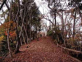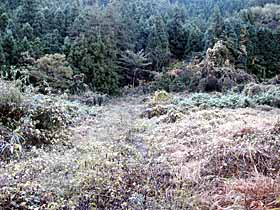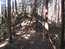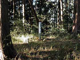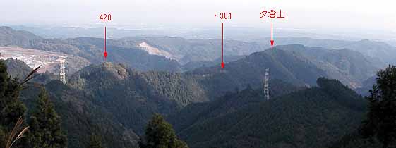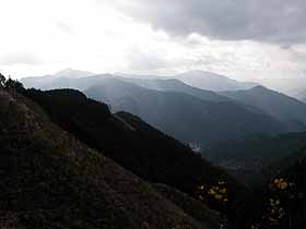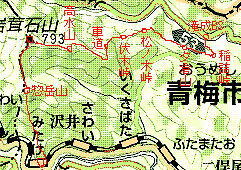 2003年11月14日(金)快晴後曇 (JR青梅線・青梅よりバス)滝成BS 900(道探し)910…稲詰峠930…949夕倉山955… (200) 20 (330) 29 (△411) 50 松ノ木峠1045…1100伏木峠1105…1210高水山1223…1246岩茸石山1252…惣岳山1322… (380) 20 (400) 65 (・759) 23 (△793) 30(・756) 53 1415JR・御嶽 (240) 体力度B- 神経度B (歩行合計約5時間10分) ◇2.5万図 武蔵御岳 □筆者参考文献 「多摩100山」(守屋龍男)この日は、有休を取っていたのですが、天気も良さそうだったので、参考書で見つけた知られざるコース、高水山から東方に続いている低い尾根(参考書によれば「ノボリオイゾネ」)を歩く事にしました。しかし、ここだけだと1日潰して行くには短か過ぎて勿体ないので、伏木峠まであまりタイムロスせずに行けたら、本丸とも言える高水山を目指す事にしました。 青梅駅前から上成木行きバスに乗車。しかし、乗ってみるとこのバス、東青梅経由でしたので、東京方面からですと東青梅駅から乗った方がよいかも(^^;)。滝成BSで降車後、近くの低い石垣に腰掛けて、青梅駅で買ったハンバーガーで腹ごしらえ。 参考書には「資材倉庫の先を左へ」とありますが、それらしき施設が見当たらないので、バス停の裏から橋を渡って、右手の落ち葉に埋もれた簡易舗装道を登っ行くと台地状になった先で完全に藪の中となりました。そこで、その手前右手へ分岐する細道を行くと、果樹園のような立木がまばらに植えられた広場に出てしまい、その先のルートが特定できません。先が見えないまま強行突破するのは、道でもない他人の畑の中をうろうろすることになり、地元の人に見咎められそうなので、取り敢えずバス道まで引き返しました。こういう無名の山では尾根に取り付くまでが第一関門なのはいつものことです。 始めに登ってみた簡易舗装道の先は藪の中に消える(^^;)。バス道の100mくらい先には建設会社のガレージのような施設が見えましたので、行ってみるとその先に左折路があり、これが参考書の「資材倉庫」であると同定し、その道に入りました。この道もすぐに細くなり、結局先程の果樹園様広場に出てしまいましたが、こちらからですと、僅か盛り上がって山の方へ続いている小径幅の帯を発見できました。広場の中をそこまで行ってみると、その帯状の盛り上がりはやはり道で、山道へつながっていました。 台地状の広場から急斜面の山道に変わると道は明瞭になり、着いたノボリオイゾネ上の鞍部が稲詰峠ですが、反対側へ下る道は既に廃道の様です。いよいよ、ここから西へ尾根を辿ります。 参考書には、夕倉山(411.2m三角点ピーク)へは「幾つかの小ピークを北側(右側)に巻き…」とあるので、最初の左(南側)への巻き道は無視して、尾根を登って行くと、2度ほど北側から巻いた後、尾根上の緩い登りで辿り着くピークを一つ越し、その次のピークが夕倉山でした。 夕倉山山頂。夕倉山からはやや右(北西)へ下り、このあと出来るだけ尾根上を行きますが、先が急斜面のため左を巻き下る箇所があり、錆びた索道の車輪が放置してある先の鞍部は茗荷峠とのことですが、気が付かずに通過し次のピークへ登りました。 やや急登を登った後の381m標高点付近、木に巻かれた青のビニル紐に導かれて右へ折れ下ります。また、やや急登で登り着いた、木の祠の残骸の様なものがある420m等高線ピークからも右へ下ると、尾根の合流する僅か手前でY字路となります。参考書の概念図ではこの辺が松ノ木峠になっており、本文の「十字路」と言う記述と異なるので、ちょっとうろうろしましたが、本日のルートがくぐるべき送電線が尾根を横切るのが左方に見えましたから、左へ僅かに下って行くと、参考書本文の記述通りに十字路になっている松ノ木峠に着きました。 松ノ木峠手前のY字路。このように、個人著の紀行文を参考書とする場合、本文がガイドとして使うにはルートの説明が不適切な場合があることの他、附図の不正確さにも警戒が必要です。 松ノ木峠からも尾根を行きます。すぐに鉄塔の下を通り、大指山(450m等高線ピーク)、455m標高点ピークと越えて下って行くと、藪っぽっくなって鞍部に着きました。ここが伏木峠で、北側は植林帯で暗く南側の眺めも対面する尾根が近くて閉塞感のある所です。 参考書ではここから右(北側)へ上成木BTまで下ってお終いですが、今回は高水山を目指して正面の尾根を登ります。 ここから、参考書にも2.5万図にもない道を本日最大の標高差150mくらい登ります。ひとしきり登った後、やや左へ続く尾根に合流、更に登りますと傾斜は30度くらいにもなり、勿論両手動員ですが、藪が薄いし、足下も悪くないので難路という感じではありません。時たま水平道のような踏跡を横切りますが、横へ行ったからと行って登り易くなる訳でもなさそうなので、ひたすら上を目指すと、たまに木に巻かれた目印が目に入り、選択が正しかった事を裏付けてくれます。左手にトタン板のようなものが見えたら、程なく車道に飛び出しますので