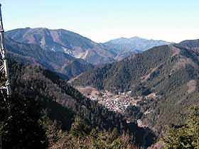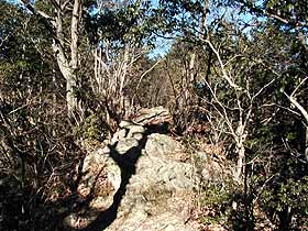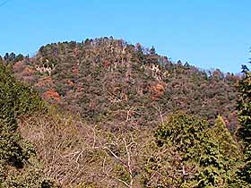 2003年12月21日(日)快晴 JR五日市線・武蔵五日市823…908光厳寺916…953城山1010…1119荷田子峠1125… (190) 45 (260) 37(△434) 69 (400) 17 車道1142…沢戸橋1214…1128五日市郷土館1145…1300武蔵五日市 (260) 32 (190) 14 (190) 15 体力度A+ 神経度B- (歩行合計約4時間10分) ◇2.5万図 五日市 □筆者参考文献 「東京近郊 日帰りハイキング」(馬場渓二)戸倉三山・臼杵山から北東に下る尾根を辿った場合、荷田子峠から左・荷田子へ、あるいは右盆堀へ下るのが定番となっています。しかし、尾根は更に東へ五日市の街の西端に聳え立つ城山(戸倉城趾)まで続いています。城山については、ガイドブックにも殆ど紹介されていませんが、今回の参考書には一般向けコースとして紹介されていますし、ネットで調べてみると城山−荷田子峠間も道はあるようです。是非歩いてみたいと思っていました。戸倉三山と結びつけて歩けばロングコースとなりますが、今回はこの個人的未踏の部分だけのショートコースが丁度よい。 というのは、先週末も快晴だったのに、久々に通風発作が出てしまい、山歩きどころではなかったのです。秋の健康診断で、春には240もあったγ-GTPが95に減るなど、肝機能を示す数値に軒並み改善がみられ、喜んでいたのも束の間、突然地獄を見ました(^^;)。しかし、薬を飲んで発作箇所左足親指付け根付近の痛みも治まり、今週末も快晴と言うことで、今度こそ、軽いハイキングでもいいから出掛けようと思っていたわけです。以前より笹平から市道山−臼杵山−城山と辿るコースとして歩こうと温めていたのですが、人通りが少なくて、短めで、個人的未踏のコースと言うことで、今回、城山−荷田子峠だけ抜き出して歩いてしまいました。 武蔵五日市から、数馬方面へ向かうメインのバス通りを西進すると、やがて正面に目指す城山の金字塔が目立ってきます。小中野の交差点から左へ入り、沢戸橋を渡って右折すれば沢戸橋BS。そのすぐ先を左折して路地へ入り登って行くと小学校の角に突き当たり、右へ。更に小学校の脇を左折して登って行けば光厳寺。門前の御影石のベンチに腰掛けて駅コンビニで買ったサンドイッチで腹ごしらえ。 バス通りより城山を望む。寺の右手の道を登って行くと墓地になりますが、更に上への道は見当たりません。墓地の左手から寺の裏へ回り込み、藪っぽい道を更に左へトラバースして行くと、左手から登って来る明瞭な道に合流。後から見たら参考書の附図も左へ行くようになっていましたから、寺の前から左を目指すべきでしたが、本文に「寺の裏手に回り込み」と書いてあって附図は別ページだったため、つい一番広い右手の道を行ってしまったのでした(^^;)。 この道も始めはトラバース気味に登って行きますが、やがて尾根を捉えて右へぐいぐい登ります。更に、支稜から主稜へ移ったような感じで左へ登って行くと、足の置き場に溜まった落ち葉で滑りやすい露岩帯を慎重に登って行きます。左手に手摺りが現れた後の2〜3m程は、妙義白雲山に登った時のように左右の足の置き場を考えつつビビりながら登りました。 露岩帯の尾根道を登る。辿り着いた城山山頂は、戸倉城趾の本丸で、立木のため残念ながら西側中心の山岳展望はありませんが、東方のみ視界があり、五日市の街並みがジオラマのように見下ろせるほか、西武ドームや副都心の高層ビル群も目立っています。駅コンビニで買ったおにぎりで昼食。 山頂から尾根を西へ辿ります。すぐに右手への下降路を分けた後、5分弱で双耳峰の西峰とも言うべきピーク(出丸。本丸とほぼ同じ標高。)に着きます。直接先へ下るのは急すぎるので、僅か手前に戻って右から巻き下りますが、この辺から指導標もあり、道も高水三山なみに明瞭で、駅からも近いのに、筆者か何冊か持っている、奥多摩のコースが収録されているガイドブックのどれにも載っていないのが不思議な感じです。 すぐに連続して2基の鉄塔の下をくぐりますが、1基目の送電鉄塔下からは、秋川の谷沿いに、三頭山まで見ることが出来、また、臼杵山方面は高く大きく望まれます。 鉄塔下より、松生山、三頭山方面を望む。ここから、荷田子峠までは、小さなアッブダウン等もあって、地形図上の距離は短いのですが、縦走している気分です。 やがて、右手、まばらになった立木越しに荷田子の集落が見え、荷田子峠が近い事を悟ります。そして、左(南面)への巻き道が現れすぐ先の左分岐道は沢戸橋方面(盆堀側)との表示がありますが、反対側への道がないので峠とは思えません。取り敢えずは尾根道を行き2つほど小ピークを越えると、右手に荷田子への下り道が現れますが、今度は盆堀側への道がありません。しかし、やや戻ったところから南面に分岐する巻き道が、先程の盆堀側への分岐につながっていそうなので、ここを荷田子峠と同定しました。 以前、盆堀側へ下ったので、今回は荷田子へ下るべきだったかも知れません。しかし、荷田子からバスに乗らなかった場合、