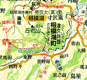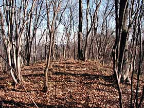 石砂(いしざれ)山は、麓からの標高差が小さく東海自然歩道も通っていますが、アプローチのバス便が悪く、隣の石老山と比べると登る人はずっと少ないようです。以前、篠原から東海自然歩道で登った時は篠原の登山口からから山頂までの雑木の道は非常に快適でしたが、藤野から篠原まで、車道で一山越えて行くアプローチが途中小雪などチラつき苦難の道だったという印象でした。それでも、当時は帰りに下り着いた西野々BSから三ヶ木BTへの道志川沿いのバスはあって、今よりマシだったような。今回は、東海自然歩道ではなく、バリエーションルートを東から西へ辿りますが、前回何も考えずに割愛してしまった西峰(北峰)を踏むのも目的の一つです。 橋本駅からは頻発するバスで三ヶ木BTへ。そこで東野方面へのバスに乗り換えて行きたいところですが、時刻表を見ると、このバスは土日は1本もなく、平日数本あるのみ。もともと本数が少ないくてアテにしていなかったので、即、歩き始めます。 少し南下した後、仙洞寺山の手前を右折、正面に丹沢主脈、右手に石老山の厖大な山体を眺めながら道志方面への車道R413を行くと三ヶ木から1時間ほどで結構高い橋を渡って、道志川の南岸の段丘が小盆地状に広がった感じがする青野原に入ります。 やがて、右「青野原オートキャンプ場」への分岐点がありますが、手前にあるはずの青野原BSがないので更に進みました。しかし、200mほど進んで右手に見える石砂山東尾根の突端より西へ進んでしまった感じがしても、青野原BSがありません。それで先程の分岐へ戻り、そばにある自動販売機で飲料を買っている地元の人らしき人に、「青野原のバス停はどこですか?」と訊いたところ、「(一本南側を通っている)旧道の方。」との答え。それなら、ここが、目指していた右折分岐点らしそうなので、三ヶ木側から見て右(北)への道へ入ります。 今までが、段丘の上だったので、河原へはかなり下って行きます。左手に地形図の「津久井青年の家」だったと思われる施設(現在は別施設)を見て、分岐から数分でキャンプ場に着きます。その先の吊り橋を渡って、左、急傾斜の木で土留めした階段で河原に下ります。そこは堰堤のすぐ上で、砂利が溜まっているため流れは潜っているらしく、水を跨ぐことなく正面の段差を登って対岸を探せば、堰堤のすぐ上流側に登り口を発見。ここからいよいよ石砂山東尾根の登りです。この手の山では、登山口が見つかれば第一関門突破と言う以上に計画完遂に近付いたと言えるのですが…。 藪の中いきなり両手動員の急登。やがて、道はジグザグに登って行きますが、所々道が外傾していたりずり落ちかかっていたりして、しかもササ藪に谷側へ押されるので少々ビビります(^^;)。その後道は右へトラバースし続けます。倒木(間伐材?)も多くなって来たし適当なところで斜面を直上しようと思ったら、かすかな足跡を発見。それを追って直上すると、上手いことブッシュを避けながら尾根道に達することが出来ました。ここで、皮軍手と鈴(野獣&ハンター除け)を装着。しかし、ここまでも結構な藪道でしたから、登り口手前の河原で装着すべきでした。本日はこれ以降、下山時里に出る間際まで常に尾根を外さないようにして歩く事になります。 2度ほど肩のような所でダマされた末ようやく425mピークに登り着きました。いきなりの難路で、結構、精神的にビビっていましたが、引き返してさっきの道を下るのは御免こうむりたいので、最悪でもこの先、石砂山へは辿り着かないと。石砂山まで行ければ、前途を断念しても安全に下れるであろう東海自然歩道がありますから(^^;)。 ここから、石砂山本体の登りの手前までは、標高差の小さい登降があるのみですが、2度ほど北への枝道に引き込まれかけました。なかなか油断のならない尾根です。 石砂山東尾根より、仙洞寺山、三角山、茨菰山方面。401mピークを気が付かずに通りすぎた辺りでは近くに鉄塔はないはずなのに送電巡視路のような標識があって道が交差していましたからいざという時エスケープルートになりそうです。また、「ギフチョウ パトロール 実施中」の表示も現れ、いよいよ石砂山本体の領域に入った事に安堵します。しかし、まだ難関は待っていました(^^;)。 いよいよ石砂山本体への登り、ひとしきりジグザグに登った後、雑木の美林の中、幅広くなった急斜面の直登となるのですが、アリ地獄のようなザレた斜面に特定の道はなく、どこをどう登るかは自分の判断しかありません。成り行き任せで右手を行くと、傾斜はきつくなるは、立木の間隔は広くなるはでちょっぴり途方に暮れます。とにかく、このちょっと上の石砂山山頂まで上を目指すしかありませんが、ちらっと先程のエスケープルート(らしきもの)が脳裏をかすめるくらい難渋しました(^^;)。しかし、取り敢えず左へトラバースしてからまた登り始めると、間隔が広すぎる立木の代わりとして何とか手掛かりに
