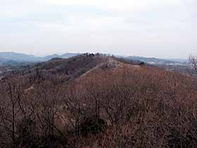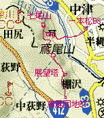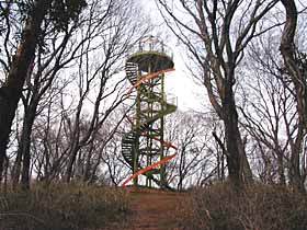 2004年2月28日(土)晴 (小田急・本厚木よりバス)鳶尾団地BT1408…1428展望塔1435…1441鞍部1448… (90) 20 (213) 6 (140) 10 1458鳶尾山1504…1535七尾山四阿1540…1553八菅神社奥ノ院1601…1627一本松BS (・235) 31 (200) 13 (160) 26 (95) (バスで小田急・海老名へ) 体力度A 神経度A (歩行合計約2時間00分) ◇5万図 藤沢 八王子 □筆者参考文献 「神奈川県の山」(広島三郎)日曜日が午前中雨の予報なので、この土曜日はどこかへ行きたいと思っていました。始めは本格的なハイキングも考えていたのですが、前週の残業疲れのせいか、寝覚めの頃に左膝脇をつってしまい、ヒルウォーキングに切り替えました。というより、主な失敗は前日の飲み過ぎで寝過ごした事と二日酔いで気力・体力が失せた事ですが(^^;)。 昼前に自宅を出て軽く、でもそれなりに歩ける場所は近場ではもう殆ど近年は行き尽くしているので、ややアプローチは遠くなりますが、かなり以前一度行ったものの、記録がなく、記憶も既に殆どなくなっている鳶尾山・八菅(はすげ)山へ行くことにしました。 鳶尾団地BT前の道を左へ。実は、ガイドブックを持ってくるのを忘れました(^^;)ので取り敢えず高まりを目指して、すぐの交差点を右折しましたが、帰宅後ガイドブックを見た感じでは正規のハイキングルートは、もっと先を右折するようです。駐在所の前を通って行くと目の前に公園。見たところ公園の裏手から登って行く道はありません。しかし右手にコンクリの階段があるのでそこを登って行きます。階段はずっと続いていて、いくつかの踊り場挟んで4〜50mほどの比高を一気に登って、やがて土の遊歩道へ。尾根道となり、左から正規ルートに合流ししばらく登って行けば、バラックの様な神社の広場の奥が展望塔ピークです。 鳶尾山展望塔ピーク 鳶尾山展望塔より仏果山塊(右)と大山 鳶尾山展望塔ピークより鳶尾山山頂方面螺旋階段の展望塔は十分に高く、その上からは360度の大展望が広がりますが、モヤっていてはっきり見えるのは近くの仏果山塊くらい。大山もちょっと霞んでいます。 次の鞍部は平に造成されていて、以前来たときは残土捨て場のような荒涼とした風景だった印象ですが、今では植生に覆われ多少穏やかな印象。でも、ルートは全く記憶が残っていなくて、ここで右手の道に入ってしまい、少し下って引き返し5分ほどロスしました。道也に左へ行くのが正しく、やがて鳶尾山山頂が視界に入って来ます。 山頂一帯は、貴重な自然林が伐採され果樹園のように立木が散在しています。立て札によれば地元愛川町が宝くじの補助金でサクラの名所にしようといるようです。土建業者に金を回す目的(その金の一部が政治家に還元される、あるいは事業が役人の再就職先の確保になるのでしょうか。)で自然林を伐採するような事業を推し進め、しかも、自然破壊を「整備」等と善行のように位置付けているのにはへそが茶を沸かします。しかも、ただでさえ、国も自治体も財源不足で増税必至なのに、いまだにこう言うところで無駄遣いとは!。よく、植樹を自然保護の一種のように唱えている詐欺師あるいはうつけ者を見かけますが、ダム建設等と同じく人工物(植林地)を作ってしまうのですから、植樹は伐採と合わせて二重の自然破壊なのです。自己増殖する植物(生物)であれば、ある意味弾薬より細菌の方が危険性が高いのと同様、ダム建設より罪が重いとも言えます。伐採してしまってから考え直すなら植樹せずそのまま放っておいて植生の回復を待つ方が自然に戻ると言うことで罪は軽いと言えるでしょう。どうしても植樹したいのなら、伐採前と同じ品種の木(当然何種類にもなる)を持ってくるべきでしょう。まあ、もっと高所から言えば人間の営みも自然の一部であり、山を破壊して造成してしまうことも自然の成り行きなのですが。それはともかく、筆者は個人的には、禿げ山は好展望なので好きです(^^;)。 鳶尾山は一等三角点の山として有名なのですが、筆者の5万図では単なる標高点で、一等どころか、三角点の記号自体ありません。ネットで検索してみると、地形図黎明期には確かに一等三角点だったのですが、その使命を終え、標石は地元小学校に移されてしまったようです。現在山頂に、小豆島産桃色御影石で出来ているはずの標石はなく、見つけることが出来るのは、4個の保護石に囲まれコンクリに埋め込まれた金属標のみです。 メインルートは次のピークを左から巻きます。せっかくなので寄ってみましたが、何故か身ぐるみはぎ取られて芯だけになった生木が立っていたこと以外、特記すべき事項はありません。 次の鞍部には簡易舗装道が横切り、尾根通しの道の入口には「行き止まり」の看板が立ちふさがります。地形図で見る限り、八菅山へ尾根通しに行くとしたら、2qくらい更に尾根を辿り、そこから右へ分岐する別の支尾根を戻るように辿ればいい筈なのですが、分岐点よりかなり手前からゴルフ場になっているので、ハイカーの通行は不可