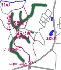 2004年4月3日(土)晴 (小田急・町田よりバス)今井谷戸BS1258…1320こころみ農園付近徘徊1340… (80) 22 (120) 2 1342山崎見本園見晴台(七国山)1353…1432今井谷戸BS(バスで町田へ) (△129) 39 (80) 体力度A 神経度A (歩行合計約1時間10分) ◇5万図 八王子 □筆者参考文献 「多摩100山」(守屋龍男)このところ、天気は周期的に変化するのですが、低気圧の東進が速かったため、週半ば頃に危惧されていた土曜日の天候は、絶好の行楽日和となりました。しかし、例によって前日の夜更かしで遅く起きたため、軽いコースへ出掛けることに(^^;)。 参考書によればこの七国山は「しちこくさん」らしいのですが、こういう場合「ななくにやま」の呼び名も通用している場合が多いので、敢えてふりがなは付けません(^^;)。どのみち、他の七国峠同様、方々が見渡せると言う意味でしょう。 小田急町田駅の新宿側踏切の道を少し北西へ辿ったところにある21番バス乗り場から、本町田経由野津田車庫行き(本町田経由鶴川行きでも可。筆者が乗ったのはこちら。)に乗り、今井谷戸で下車。 僅かに戻って「ダリア園」の看板に従って歩きます。はじめ住宅街の登りですが、左手ダリア園の前を過ぎると少し先で下りに転じるので、その手前から右へ分岐する道を登って行きますと左へ林道風の道があり、これを行きます。 程なく左手に、井桁はあるものの中身は埋まってしまっている古井戸を見ると、その少し先で鎌倉古道が左へ分岐し、そのすぐ先で左右にピーク発見。左(西側)のピークへ登ってみましたが三角点らしきものは見当たりません。右のピークは針金のさくで囲まれて「立入禁止」の看板もあるので取り敢えず後回しにし、登ってきた車道100mくらい前方左手の高みを目指します。 その高み付近は園地状に道が付いていて、いつの間にかシイタケのホダ木等のある「こころみ農園」の敷地内でした。ここを歩き回っていいのかどうか分からなくてビビりながらも、その中の最高点付近を探しましたが三角点は発見できず。 こころみ農園から尾根伝いに更に北上すると、いい感じの雑木。尾根伝いに更に北上すると、いい感じの雑木の道となりましたが、その先、はっきり下りに転じるので、戻って来ます。そして、もう一度こころみ農園付近を探索しましたが三角点は見つからず。 車道を戻り始めると左手に「展望台順路」の指導標を発見。それに従っ畑の縁を僅かに登って行くと、先程後回しにした立入禁止ピークのすぐ脇に着きました。囲いの中(ピーク)をのぞき込むと、僅か数m先に探し求めていた三角点を発見。踏むのは諦めましたが、標高差も1mくらいですから、ここまで来れば登頂したと行っていいでしょう。 やっと見つけた128.5m三角点。付近にはベンチがあり、東側の視界が開け、「山崎見本園見晴台」の看板や展望図もあります。ここで、昼食。 帰りは、また僅かに戻って、鎌倉古道の方に入りました。この道は緩く下りながらこころみ農園ピークの西側を巻いたあと北側の尾根に乗り、最後、竹林を見ると農道のような道に下り着きました。 右へ道也に行くと、程なく道は車道らしくなってきます。やがて、右へ分岐があり、薬師池方面を目指していた筆者はこの道に入りました。この道は七国山の北の尾根を乗っ越して薬師池方面へ続いていそうだったからです。 左手にファーマーズセンターを見て更に登って行きますが、下りに転じる気配は一向になく、気が付いたら七国山方面へ登っていました。あわてて少し戻って右手(登りから見ると左手)へ分岐する道へ入ります。 この道からは、こころみ農園や北へ続く尾根が間近に見えますし、その左方には住宅の建ち並ぶ浅い谷を挟んで七国山頂やその僅か手前の山崎見本園見晴台も見えました。ぐるりと時計回りにすぐ近くまで戻ってきてしまった訳です(^^;)。 七国山と山崎見本園見晴台。そのすぐ先はまた分岐。結果的には左が薬師池方面だったようです。右の道を選んため、いろいろ曲がりくねりながらも、今井谷戸BSから僅か100m強だけ薬師池寄りの地点でバス通りに出てしまいました。ここまで来てしまっては、今井谷戸BSへ戻ることにしましたが、町田駅方面へのバス停は交差点の向こう側にあり、歩道橋を渡っていると、町田駅方面へのバスが通過して行きました(ToT)。しかし、15分に1本くらいはあったので、ダメージは比較的小さかったです(^^;)。 この日歩いてみると、町田七国山付近は、意外に散策者が多かったです。と言っても、混んでいるというわけではなく、5〜10分に一組くらいの割合で出合う程度すが、相原七国峠や霞丘陵七国峠などこの手の無名コースでは1〜2時間歩いて一組出合うかどうかと言うことが多かったので意外でした。自然度は多摩周辺の他のコースに比べても高いとは言えませんが、栽培(スイセン、パンジー、アブラナ等)、植樹(サクラ、ツツジ等)、自生(ニラバナ、スミレ、シャガ等)を含めて、非常に花が多いというのがこの付近の印象でした。 ▲