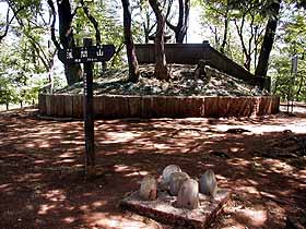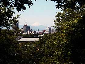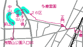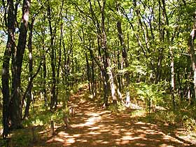 2004年4月25日(日)快晴 (京王線・東府中よりバス)浅間山公園入口BS953…1020浅間山(堂山)1030… (50) 27 (△80) 9 多磨霊園26区1039…1103西武線・多磨 (55) 24 (45) 体力度A 神経度A (歩行合計約1時間00分) ◇5万図 東京西北部 □筆者参考文献 「多摩100山」(守屋龍男)府中浅間山は周囲の住宅街からの比高僅か30mほどの残丘ですが、この季節、束の間とはいえどっぷりと緑に漬かる事が出来ました。 京王線・東府中駅から「ちゅうバス」(ほぼ30分毎。運賃100円。)の多磨町行きに乗り、浅間山公園入口下車。すぐ先の交差点を左折すると前方やや左に青垣が見えます。あれが目指す浅間山でしょう。「間違いないっ!。」 やや広い通りを信号機付きの横断歩道で渡れば、左手の道の入口には「この先通り抜けできません。」みたいなことが書いてありますが、この道こそ青垣方面に続いている感じ。「間違いないっ!。」と、入っていきます。右手は運動施設ですが、左へ右へとカーブしてすぐに左手に浅間山への入口がありました。 早速入って、道也に登って行きます。美林と言ってもいい感じの樹林帯。見上げれば鮮やかな緑の葉の間に、鮮やかな青空。響くのは鳥の声。早速に非日常の世界を浸り始めます。 最初のピークは、手前に「人見四郎の墓跡」の石碑の立つ前山。ここから、尾根伝いに中山、堂山と「く」の字型に超ミニ縦走します。 鮮やかで濃い緑にどっぷりと浸かる道。濃い緑に囲まれた道ですが、中山への途中には、浅間山の名に違わぬようにか、富士見ポイントも用意されています。遠望の利く季節ではありませんが、幸いにも富士山を捉えることが出来ました。 富士見ポイントもしっかり用意され。中山から堂山へは、はっきり山体が分かれる鞍部へ下ってから登り返します。と言っても標高差は10mちょっとです(^^;)。 登り着いた堂山には、浅間神社や三等三角点もあり、如何にも府中浅間山の主峰と言う感じです。やはり、樹木に囲まれていますが、奥多摩大岳山方面が見えました。 府中浅間山(堂山)山頂。堂山からは道也に下るとすぐにきすげ橋(吊り橋風ですが、川ではなく車道を跨ぐ横断歩道橋。)を渡ります。その先の分岐を右に採れば、木は低くなるものあいかわらず緑の中の道ですが、間もなく多磨霊園墓地の26区に飛び出します。 そのまま霊園内の道を行けば、霊園の南縁に沿って東進するようになります。霊園内の道もツツジ等見ながら、散策路としてはいい感じです。やがて、辿り着いた霊園正門から外の道に出て、西武線・多磨駅へ辿りました。 しかし、これは失敗でした。西武線とは言え、本線である新宿線にはつながってはおらず、新宿方面へは武蔵境からJR線に乗り換えなければならない事に気が付いたのは、切符を買って、ホームのベンチに腰掛けてからでした。それなら、「ちゅうバス」で東府中に戻って、京王線で帰った方が遙かに安い(^^;)。しかも、間違って是政へ行ってしまい、府中まで歩くはめに。でも、歩きに来たのですからこれも一興(^^;)。 今回、新緑と鳥の声だけで十分堪能できたのですが、5月になればムサシノキスゲ(ユリっぽい黄色の花)の群落も楽しめるそうです。 ▲項目索引▲ ◎トップページへ戻る◎ |