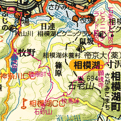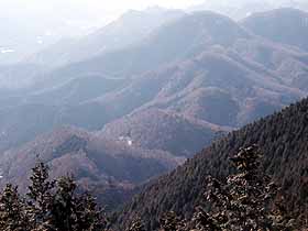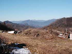 2005年1月9日(日)晴 JR・藤野821…赤沢BS850…951篠原BT1003…1045石砂山1100…1147牧馬峠1230 (220) 29(・221) 61 (・280) 42 (・578) 47 (410) …1320石老山1340…顕鏡寺1420…1445石老山入口BS1450…1456ピクニックランド前BS 50 (700) 40 (340) 25 (・205) 6 (220) (バスで藤野へ) 体力度B 神経度B+(歩行合計約5時間25分) ◇5万図 上野原石老山と石砂(いしざれ)山は牧馬(め)峠の鞍部を挟んで尾根続きになっていますが、両者を結ぶ東海自然歩道は何故か中間で篠原に下っています。そこで、これらを尾根通しに歩いてみる事にしました。多くの人が考えそうなことなので、もしかしたら意外に簡単に歩けるルートかも知れないとも思っていたのですが、やはりハイキングコースになっていなくて、結構手強かったです。と言っても、冷静にルートを選んで行けば危険個所はありませんが。 篠原へのバスの便は期待できないので、もともと藤野駅から歩くつもり。藤野駅前には奥牧野行きのバスが停まっていましたが、どこを通ってい行くのか判らなかったので乗りませんでした。しかし、筆者が出発して数分後に追い越していったそのバスは、乗っていれば赤沢BSまで利用でました。歩程短縮は30分程ですが、赤沢BSまでは交通量も多く飛ばしてくる車にビビりながらの歩程なので、利用した方がよかったかも。 赤沢BSから左折して行く道は、交通量も少なく、のんびり歩けました。篠原へは標高350mくらいの峠を越えて行かなければなりません。鉢岡山登山口を過ぎ、十字架のある施設の建つ峠へ登り着くと扇山や大菩薩方面が望めます。その後平坦に近い道が少し続いてから明瞭な下りとなります。 篠原へ向かう途中の峠より扇山方面。下り切ったら「やまなみ温泉」方面への右折路を見送って、少し先で「青野原」を示す標識に従って右折すれば牧馬峠への道となり、やがて篠原BTに着きます。腹ごしらえしてから出発。 少し先のY字路で左牧馬峠への道と分かれて右へ入って行きますと左手小川に架かる橋の先に指導標がありますが、朽ちかけているので、ちょっと見には天下の東海自然歩道のものとは思えなくて、一度は通りすぎててしまったほどです。このルートは2度目なのですが、蘇るのは雰囲気の印象のみで具体的道順の記憶なし(^^;)。でも、地図の示す場所としてはこの辺のはずで、他に登山口らしきものもないので入ってみると、はっきりした指導標もあり、確かに、石砂山への登山道でした。 道はすぐに尾根に取り付いて、最後は木段もある急登となります。石砂山の頂稜部は南北に長く、その間殆ど平坦ですが、山頂の表示は南端にあって、南面が開けています。 牧馬峠へは、頂稜北端部近くの赤テープから、始めは尾根とは言えない斜面を下って行きますが、ちゃんとジグザク道になっています。やがて尾根らしくなり、一つ目の低いピークは右から巻きます。 二つ目のピーク手前では、登りが始まるところで尾根道の入口には木と木の間にツルのようなものを渡して塞いで、右手の巻き道の方に行くように促している感じ。それで、巻き道を行きましたが少し先が崩れて外傾していて感じが良くないので引き返し、尾根道へ入りました。登り着いたピークは465m標高点と思われます。その先の下りも含め、入口の「表示」に反して、こちらには悪い箇所はありませんでした。 その先に分岐があり、ここにも左を木の枝で塞ぐような「表示」がしてありましたが、ここは地形図で見ると左は支尾根なので、納得出来ます。この後の2つのピークは何れも明瞭な道に導かれて右から巻いて、車道が乗越す牧馬峠に着きました。車道が乗越す峠の場合、切り通しの法面の上で道がプッツりとぎれて、下降路探しに苦労するなんて事もよくあるのですが、石砂山からの道は切り通しの南側すぐ横へ滑らかにつながっていました。 牧馬峠。左手緑色の網の奥が石砂山からの道。石砂山から牧馬峠まで道自体は比較的歩き易かったのですが、支尾根に入り込まないよう尾根の屈曲点毎に地形図と磁針と周りの景色を頻繁に確認して来たので、距離の割には時間が掛かりました。しかし、取り敢えず「前半戦終了」と言う感じで安堵します。ところが、このすぐ後が問題でした。 牧馬峠の切り通しは車道の幅以外に、石老山側はガソリンスタンドが作れそうなくらい広くえぐってあって、法面は高さ30mくらいありそうな大絶壁になっています。勿論、そうでなくても法面を直登するわけではないのですが、その分、幅も広くなり、尾根道への入口を探すには左右にかなり回り込まなくてはなりません。でも、明瞭な道が見付かるなら、大した問題ではなく、石砂山側の様子からそれを期待していたのです。 まず右(南面)へ回り込んでみると、100m先、背丈ほどに低くなった法面の上の木に赤テープ発見。しかし、すぐ右手にある落石ネットのワイヤーの作業道の目印のような感じもして、石砂山側の道に比べたら道とも言えないような所なので一応保留。もう少し先まで探しま