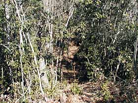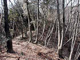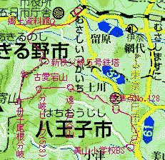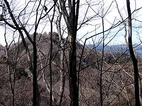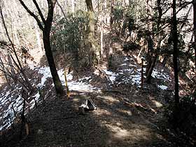 2005年2月6日(日)快晴 (京王八王子よりバス)美山小学校BS 925…1015基準点No.128 1020…林道1117… (200) 50 (320) 57(250) 38 1155遠ノ谷戸山1210…1252分岐ピーク1300…舟子尾根分岐1319…1345古愛宕山1355… (・404) 42 (・523) 19 (590) 26 (509) 27 1422新秩父線5号鉄塔1434…林道1445…1515郷土資料館1534…1549JR・武蔵五日市 (360) 9(210) 30 (190) 15 (190) 体力度B 神経度B+ (歩行合計約5時間45分) ◇5万図 青梅 五日市 ◇2.5万図 拝島 五日市刈寄山の東方には年始めに歩いた入山尾根から山入川を挟んで北にもう1本尾根が横たわっています。ネットで検索しても、尾根の名前は見付かりらず、2.5万図「五日市」で今熊山との分岐ピーク(・523)の東方約1.2kmにある404m標高点ピークが遠ノ谷戸(とおのやと)山であること以外は尾根上に地名は見付かりませんでした。地形図からは、この尾根は標高は低いものの、尾根のつながりが滑らかでなくルートファインディングが楽しめそうで、その一方、採石場等の危険地帯はなさそうなので、藪がひどくなければ主稜線沿いに踏破出来そうです。それで、入山尾根を歩こうと思ったと同じ頃からハイキング候補地にしていたのでした。 今回は、この尾根を登り、刈寄山−今熊山ルートに合流したらこれを少し南西へ辿り、やがて北へ分岐する舟子尾根へ入って五日市方面へ下ろうという計画です。 美山小学校BSで降り、正面の路地を行きますが、登山口など見つかるはずもなく、右手、南北に尾根を乗越して行く車道に合流し、北へ緩く登って行きます。何の情報もない尾根に乗っかるにはそれを乗越す車道を登って峠近くで入山口を探すのが常道です。ただし、峠付近は切り通し状に絶壁の法面が作られている場合が多いですから、その前後を探すことになります。 道路左手(西側)を観察しながら少し行くと、谷状になった所にはサクがあり「立入禁止」の表示。しかし、そのすぐ先、峠(戸沢峠)よりまだ大分手前の小尾根の角のような所にトラロープ発見。(註:2015.03.13 反対側の天合峰に登るために通りましたが、この入口は発見できませんでした。造成工事が進んでいたので、消失してしまったのかも知れません。)早速登ってみると、一部低木の枝が被っていたりはするものの、明瞭な道が続きます。 トラロープを登ってみると意外に明瞭な道が続く。やがて、その道は目指していた主稜線を行くようになります。事前に何のヒントもなかったのに、こんなにあっけなく主稜線を捉えることが出来、ラッキー(^^)。しばらく悩むような分岐もなくこの道に誘導されて尾根上を行きます。やがて、道が北と西に分かれるピークに出ますが、ちょっとだけ悩んだ後、西を採り、正解でした。 更に道也に行くと、採石場の崖が目立つ入山尾根がよく見える場所に着きます。そこには、「八王子市道路台帳 1級基準点 No.128」と書かれた金属プレートが上面に付いた標石がありました。ここまで、距離・標高差の割には時間は掛かっているものの意外に順調です。この調子なら楽勝で分岐ピーク・(523m)まで行って、その後かなりの余裕を持って舟子尾根に入れそうな気分になっていましたが、しかし、案の定、現実はそんなに甘くありません。 「1級基準点 No.128」付近より入山尾根北面。基準点を過ぎて間もなく、進路を塞ぐ灌木や低木がにわかに増えました。それらをよけながらも、とにかく尾根を失わないように進む道ですが、虫など出る季節には絶対歩きたくない道です。この先、遠ノ谷戸山との間に、尾根を南北に横切る林道の峠があるはずですが、なかなかそれらしき景色が現れません。それでも、いくつかピークを越えて行くと植林帯となって、藪もなくなりました。 安堵したのも束の間、道が北向きにカーブしたまま、一向に西に向きを変えません。左(西)の下の方からバイクのエンジン音が聞こえるので、林道は間近のはずですが、峠越えのバイクなら、音が近付いてきた後遠くなるはずなのにずっと明瞭に聞こえ続けるのは不気味。もしかして、バイクではなくチェーンソウ等かも。林業関係者だったら怪しまれて、ヘタしたらつまみ出されるかも。とか、バイクが立ち去らないのは暴走族か過激派か何かの悪党がタムロしているからで、見つかったら襲われるかもとか、余計な心配が頭をもたげます(^^;)。 植林の中、露岩も現れる登りを過ぎ、辿り着いた小ピークからは西に向かって下れそうです。峠よりは北側に下り着く事になったとしても崖や沢に邪魔されずに林道に立つことが出来れば大した標高差でもないので、峠方向へ登り直して、尾根への取り付き口を探せばよいのですが、取り敢えず、2.5万図を見ながら善後策を検討します。現在地は林道東の345m標高点から北西160mくらいにある320m等高線ピークのようです。ここから西に下ってすんなり林道に立てるのか等の不安もあり、一旦は尾根道を少し戻り、西側の峠方面へ下って行く道を探す事にしました。 尾根道が左へカーブして、右手樹間に入山尾根が望める辺りまで戻って