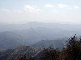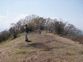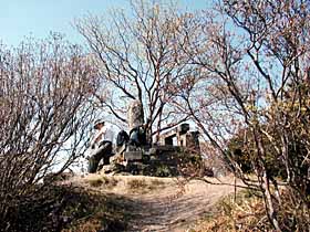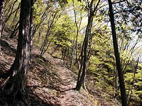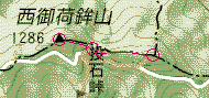 2005年5月4日(水・休)晴 (板橋区の自宅より原付で)投石峠1304…1325西御荷鉾山1337…投石峠1353… (1015)21 (△1286) 16 31 1424東御荷鉾山1429…1500投石峠(原付で自宅へ) (△1246) 31 体力度A 神経度A (歩行合計約1時間50分) (バイクの運転込みでは 体力度B 神経度B) ◇5万図 万場御荷鉾山は公共交通機関利用では東京から日帰りは困難ですが、車利用なら、御荷鉾スーパー林道の通る山頂直下まで高度を稼げますので、余裕のハイキングになります。しかし、筆者は無いカー族。と言うことで今回はスーパーカブ50で東西御荷鉾山の間の鞍部に当たる投石峠(現地の標識では「投げ石峠」。「とうせき」と読まれたくないからでしょうか?。)まで行き、2峰をそれぞれ往復することにしました。 以前は山へ行くことを考慮してジュベル250という、林道ツーリングタイプの中型バイクを所有していたのですが、あまり利用しないまま朽ちてきて廃車に。昨年4月、それと入れ替わりに原付の名車スーパーカブ50を購入しました。 カブの運転操作に慣れるのには時間が掛かりました。というのは、ビジネスバイクなのて靴の甲を痛めないためにか、チェンジペダル操作はつま先側を踏んでシフトアップ、かかと側を踏んでシフトダウン(停車時はつま先側を踏んで3速からNにリターン)となっていて、これまで経験したつま先側のみを上げ下げするのと大いに異なるからです。また、方向指示器のスイッチも左右ではなく、上下に切り替えるので方向感覚が合いません。 また、カブは燃費がいい(実際、遠乗り主体で70km/L以上は走ります。)のですが、タンクが小さい(4L)ので、山中のスタンドがない場所でガス欠になることを気にしなければなりません。だからといって、燃料計が「給油」を示しても3L強しか入らないので、それより早めの給油は気が引けますし。 購入直後はあまり遠出せず、その後寒い季節になって全く乗っていなかったのですが、春以降、和田峠(陣馬)越え、顔振峠−刈場坂峠−正丸峠−山伏峠(奥武蔵)、更には奥多摩最奥の鶴峠越え、と遠乗りを経験し、自信がついてきましたので、今回投石峠を目指したわけです。 当日、板橋区の自宅を5時には出発しようと思っていたのですが、寝坊してしまい出発は8時過ぎ。中止しようとも思いましたが今日は1日中天気が良さそうなので、行けるところまで行って、帰りは明るいうちに山間部を抜ければ平地は夜になっても大丈夫だろうと思い直して決行。 往きは、川越−児玉−鬼石−神流(万場)と経由。神流川縁から投石峠へ直接登る道は悪そうなので、神流町役場やや東側から「みかぼ高原自然村」経由の道を辿りました。全面的に舗装道ですが、やはり傾斜はきつく、カブは1速までも使ってあえぎあえぎ登ります。しかし、上部は花が多く明るくて気持ちのいい道です。 スーパー林道に登り着いたら右へ僅かで西御荷鉾山南側直下の登山口。ここには、石碑のある園地となっていて、広めの駐車場もありますので、マイカー登山の場合ここに車を置いて、ここ−西御荷鉾山−投石峠−東御荷鉾山−投石峠−林道経由でここへと辿るのが良いでしょう。その場合投石峠から東西2峰を往復するのと比べて、西御荷鉾山−投石峠間の片道分が南側に膨らんだルートとなるため距離は若干長くなりますが、駐車場の標高は投石峠と西御荷鉾山の間にあるので、細かい登降を別にすれば、累積標高差は、ほぼ同等のはずです。 カブをさらに少し走らせれば投石峠に到着。峠の数m西寄り、電柱と指導標の間のスペースに駐車します。期待通り、自宅から5時間弱で到着。ここでの徒歩行動を2時間程度にすれば、余裕で明るいうちに平野部へ下れるはずです(^^)。 まず、西御荷鉾山を目指します。すぐ尾根を行くことも出来ますし、林道を30mくらい西へ歩いてからも登山道へ入れます。登山道は初め雑木の中、主稜を直登しますが、植林に変わる頃には傾斜も増してジグザクに登って行きます。焦って登ったせいか息切れしながらも時間的にはあっけなく山頂に達しました(^^;)。 西御荷鉾山山頂。 西御荷鉾山山頂より二子山・両神山。地形図からも分かるとおり頂稜部は東西に細長く、中央部の芝地辺りからの展望は北面・南面とも抜群です。やはり、両神山が印象的ですが、モヤっていて遠望が利かないのは季節的にも時間的にも仕方ありません。しかし、ツツジやサクラの類の花が多い近景も含めて伸びやかで好もしい眺めです。もっと早く出掛けていれば芝生に寝ころんでのんびりしたい所ではありますが、コンビニ弁当をそそくさと胃に詰め込んで下山に掛かります。 峠まで戻って、今度は東御荷鉾山を目指します。登山口は峠から林道を数10m東へ行った所です。初めのジグザクはざらざらと滑りやすくて厭な感じですが、やがて主稜の南面を東進するようになれば快適な道になります。こちらの方が、遊歩道化された西御荷鉾山への道より、山歩きとしては楽しめます。時間の心配もなくなって来たので西御荷鉾