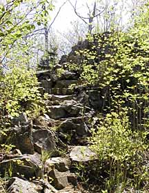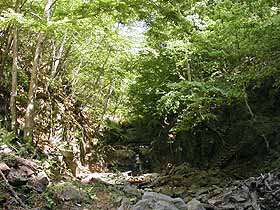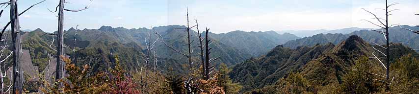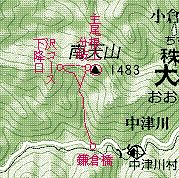 2005年5月21日(土)晴 (板橋区の自宅より原付で)鎌倉橋855…主尾根上分岐1015…1025南天山1115… (・814) 80 (1400) 10 (・1483) 22 沢コース下降口1137…1240鎌倉橋(原付で自宅へ) (1400) 63 体力度A+ 神経度A (歩行合計約3時間00分) (バイクの運転込みでは 体力度B 神経度B-) ◇5万図 三峰 万場 □筆者参考文献 「東京周辺の山350」(打田^一)南天山は公共交通機関利用では東京から日帰りは困難ですが、ガイドブック等の情報からマイカー利用なら、登山口の鎌倉橋付近に車を置いて3時間程度で山頂まで往復できそう。筆者はマイカー族ならぬ無いカー族(^^;)ですが、前回スーパーカブ50で東西御荷鉾山の間の鞍部に当たる投石峠まで行き、2峰をそれぞれ往復する事に成功しましたので、今回、カブ山行第2弾として南天山に挑戦することにしました。前回より歩程は延びるものの、走行距離や傾斜から見てカブの運転の労はこちらの方が少なそう。 前回、遅い出発のため御荷鉾山頂でゆっくりすることが出来なかったので、今回は板橋区の自宅を4時半頃に出発。R254R、463、R299と辿って、秩父からはR140を西進。指導標の「中津川」方面を追って行くと、前方に巨大な堰堤(滝沢ダム=建設工事中)が現れ、これも巨大な円周のループ橋でその左岸に登ります。その後も良い道を幾つかの真新しいトンネルをくぐって快調にカブを走らせますが、中津川BTを越えてしばらく後、道は未舗装となり、時速を20Km以下に落として慎重に進むと間もなく鎌倉橋。渡ってすぐ右が南天山の登山口で、左側に乗用車数台分の駐車スペースがあります。ここに、カブを留めて徒歩開始。 新緑が目に染みる鎌倉沢沿いの道。鎌倉沢沿いの急斜面に作られた道は遊歩道レベルに整備されていますが、長時間のバイクの運転直後のため、脚がふらつき加減(^^;)。少し休んでから歩き始めた方が良かったかも。やがて、沢に降りて木橋を何回も渡り返して進む箇所も出てきますが、新緑に染まり、渓相も美しい道です。指導標も完備していて、所々に「南天山までXm 起点まで(3150−X)m」の標識があります。 「南天山まで1400m 起点まで1750m」を過ぎた頃、道が「右:尾根コース 左:沢コース」に分かれますが、事前に見た幾つかの参考書の示す道は何れも「尾根コース」に相当すると思われるので、こちらが近いと見て取り敢えず右を採り、沢を渡って小尾根の左斜面をジグザクに登って行きます。針葉樹の植林帯に入りますが、それが薄くなって明るくなると待望の主尾根です。 露岩も出た山頂直下の道。山頂は右(東)ですが、先程分かれた「沢コース」はここまで合流しておらず、主尾根をもっと左(西)へ行った所に登り着くようです。山頂まで、10分ほどの尾根道は露岩も現れ、ツツジの花も咲き、明るくていい感じですが、結構急登で一汗かかされます。 露岩頭の山頂は、何本もの枯れ木に画されてはいるものの、浅間山や奥秩父主脈も望める360度の大展望。特に、赤岩尾根〜両神山周辺のコツゴツした連なりが間近くて見事です。時間は十分あるので、山座同定をしながら心おきなく展望を満喫しました(^^)。 ![]() 山頂からの大パノラマ。 最近ではこの山も関東広域のガイドブックに採りあげられるほどポピュラーになって、流石に山頂を一人で独占とはいかず、何組かの登山者に会いましたが、その中で中高年男女数人の組は、鎌倉沢ではなく北面(非一般ルート)から登って来たそうで、ここから南東へ続く尾根(非一般ルート)へ入って行きました。そちらは最初の鞍部からして見るからに急に落ち込み、その先の起伏も如何にも険しそうで、以前読んだガイド記事によれば、1347.8m三角点で北に向きを変えた先では15mの懸垂下降が必要な箇所も通らなければならないようです。勿論、筆者は十分展望を楽しんだ後、もと来た方へ下ります。 さっき急登して来た道を慎重に下り、尾根コースの分岐を見送り西進すれば起伏も穏やかになり、分岐から5分ほどで左へ下るので、ここが沢コースへの下降点かと思いましたが、ちょっと巻いただけですぐ主尾根に復してしまいます。本当の下降点は尾根コース分岐から15分ほども行った所で、尾根続きには「通行止」の表示、また、左「鎌倉橋」を示す指導標もありました。 左へ下って行くと、「沢コース」と言いながらも、斜面のジグザク下降や東方へのトラバース下降の方が、沢沿いになってから尾根コース合流点までより遙かに長いです。合流点からは、今朝来た道を鎌倉橋まで戻りました。 早出の甲斐あって、時間的に余裕が出来、帰りは秩父で武甲山資料館を見学したり、R299の途中からちょっと遠回りして山伏峠から名栗川沿いの道を辿ったり、のんびりバイクツーリングを楽しみながらも真っ暗にならないうちに帰宅することが出来ました(^^)。 南天山は、初めてその名を知った頃、鎌倉橋からのルートは周辺山域の中では比較的容易とは言え、それなりにルートファインディングも必要な薮山だったはずですが、その後ハイキングコース