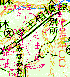 2006年2月25日(土)晴 京王堀之内1128…1153蓮正寺公園ふれあいの丘1201…1220長池ネーチャーセンター (100) 25 (140) 19 (150) 1230…1240長池公園南西端園地1250…清水入緑地最高点1304…1320 10 (160) 14 (160) 16 大平公園最高点1325…中郷公園1340…1342南大沢駅周辺1436…松木緑地横断道1509… (160) 15 (140) 2 (130) 33 (120) 25 1534富士見台公園展望台1543…1609京王堀之内 (130) 26 体力度A 神経度A+ (歩行合計約3時間30分) ◇5万図 八王子 □筆者参考文献 「ライトマップル 東京都道路地図」(昭文社)この日、9年ぶりのスキーに行く予定でした。「ホイチョイプロダクション」とかが流行っていたスキーバブル期は1シーズン数回行っていたスキーも、やがて勤務先の草レースのみの参加となり、更にはそれにも行かなくなっていました。当時は、下手なくせに2m以上もある硬くて重い板(GS用、SL用)を履いて、野辺山のアイスバーンで曲がれなくて苦しんでいましたが、無用の長物となってしまったそれらの板は昨年、粗大ごみに出してしまいました。 しかし、最近、お茶の水周辺歩いていると、売っている板が変わっていました。短くて、サイドカットも深く、しかもエッジは鋭角で、如何にも曲がり易そう。バブルも去ってスキー客は減り、リフト待ちも短そう。あの頃ほどの体力も気力もありませんが、お気楽に出来るならと、またやってみたくなり、見かけた中で一番安い初級者用の板(163cm 約12K円)を購入し、SL用を捨てたとき念のため取って置いた締具を自分で取り付け、上越新幹線利用の日帰りスキーの機会を窺っていたのです。 この日は、全国的に晴天・温暖な予報で、お気軽スキーにはもってこい。ジーンズで出掛け、オーバーズボンを重ねただけで滑るのですが、出がけに玄関で靴を履こうとしたら「ビリッ」っという厭な音。見てみると履き古したジーンズの左モモが4cmほどほころびています。しかし、どうせオーバーズボンを履くし、1日くらい何とかもつだろうとそのまま出発。日帰りなので、乗る電車を遅らせたくないのです。 しかし、最寄りの浮間舟渡から埼京線に乗って大宮へ向かう途中、帽子を忘れて来たことに気が付きました。帽子がなくては耳が冷えて痛くて滑れません。およよよよ。ここまで来たら自宅まで戻るのは時間的に遅れすぎ、今日はもう諦めるか、きっとスキー場でも売っているだろうからかなりの出費覚悟で現地で調達するしかない。もう、残り少ない今シーズンで、また日和に恵まれる週末があるかどうか分からない、「現地調達の帽子は割高でも却って記念になる」と自分に言い聞かせ、そのまま行く事にしました。 大宮駅で改札を出て、緑の窓口へ。せっかくなので未知のガーラ湯沢を目指して「ガーラ日帰りきっぷ」を買うつもりです。順番待ちで、インフォメーションの液晶を見上げると、朝利用可能なガーラ湯沢方面への新幹線は全て満席。ここで気持ちも萎えました。1.5時間ほどの自由席で通路に立ちっぱなしは、昔、スキーQきっぷ(すきっぷ)で日帰りスキーに言っていた頃は当たり前で、やる気がまんまんの時ならどうという事はないのですが、今日はお気楽スキーのつもりなのに、久々のスキー出発で次々に起こるアクシデントに気持ちは萎え気味。でも、スキー人口も減ったろうし座って行けるだろうから、と甘い考えで持ちこたえていたのです。 混むなら、「ガーラ日帰りきっぷ」はやめて、「スキー往復きっぷ」で中里へでも、でもそれなら、ウエブの割引券をプリントアウトすべきだった。等々色々考えは渦巻きましたが、短時間にこれだけのアクシデントが起こるのは「行っても楽しめない可能性が高い」(ここまでこの頻度で見込み違いがあったと言うことは、これからもどんどんアクシデントは起こる)という予兆と感じ、結局自宅へ戻って来てしまいました(^^;)。これは、結果論としては正解(^^;)だったようで、この日、ガーラはゴンドラが止まるほどの強風だったそうです。 自宅に戻り着いたのはまだ7時前ですから、スキーの代わりにどこかへハイキングに出掛けようと思いましたが、慣れない早起き行動の疲れがどっと出て、取り敢えずゴロリン。目的地を決め、支度して自宅を出発したのは結局、10時前でした(^^;)。 以前「趣味悠々〜里山歩きの入門〜」(NHK教育)で、京王線・南大沢南側周辺のルートを紹介していました。そのとき手持ちの地図(「ライトマップル 東京都道路地図」)で見てみると、確かに、南大沢周辺は線路の北側も含め、緑地・公園だらけ。番組自体は好みに合わなかったのでその1回きりしか見ませんでしたが、いつかはその辺で周遊ルートを組み立てて歩いてみようかと思っていました。それが、本日、図らずも実現の運びとなりました。 京王堀之内駅を南側へ出て第1の目的地・蓮正寺公園は線路沿い西方ですが、エスカレータを発見、本能的に(^^;)上へ上へと登ってしまいました。エスカレータ3連の後、斜行エレベータ沿いの階段も登り、団地林立の丘陵上へ。右へ