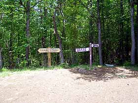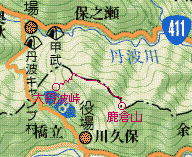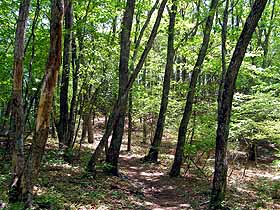 2006年5月21日(日)晴 (板橋区自宅より原付で)大丹波峠1010…1100鹿倉山1120…1158大丹波峠(原付で帰宅) (920) 50 (△1288) 38 体力度A 神経度A (歩行合計約1時間35分) (バイクの運転込みでは 体力度A+ 神経度A+) ◇5万図 丹波鹿倉(ししくら)山は奥多摩のガイドブックにもよく紹介されていますが、奥多摩最奥というか大菩薩東端みたいな位置にあり、公共交通機関利用では東京から日帰りはきつそうです。しかし、マイカー利用なら、西側、山頂まで標高差370m程の大丹波峠に車を置いて1時間程度で到達できそう。筆者はマイカー族ならぬ無いカー族(^^;)ですが、今回、スーパーカブ50山行の今年の第1弾としてこの山を選びました。標高の低い割に交通の便が悪いので静かな山歩きが期待出来ます。 例によって、富士街道、新青梅街道と進み、東大和の「山田うどん」で朝食。更に、青梅街道で奥多摩山間部を行きますが、青梅を過ぎてかなり田舎っぽい所でスピード取り締まり機器設置部分とその先に検挙のための要員を発見。今日はそのような日と心得て、スピードその他取り締まり対象にならないように慎重にカブを進めます。奥多摩湖で休憩。駐車場には二輪が多く、おじさんライダーの多さに驚かされます。 丹波(たば)の集落に入ったところで左折、橋を渡り役場の前を通って小菅方面への峠道(県道18)の登りに掛かります。何しろ非力なカブ50ですから始めは1速使用の急登ですが、やがて2速中心で登って行きます。無名の峠(標高950m弱)を越えて小菅側へ少し下ると左手に「鹿倉山」の指導標があり、大丹波峠への林道が分岐しています。 この道は簡易舗装からすぐ未舗装となりますが、傾斜も緩めで轍も比較的浅く、カブでも何とか登って行けます。林道終点で左折して、やや急で細くなった樹間の道を僅かに登れば大きめ(10m四方以上くらい)に切り開かれた大丹波峠に着きます。駐車場はないので切り開きの端に駐輪。指導標、案内板の他、「熊よけにラジオなど鳴らせ」みたいな掲示がありますが、実際にはザックに入っていた鈴を忘れたと思い、静かな山中でラジオは無粋なので、何も鳴らさずに出発。 この峠、確かに鞍部にはあるのですが、鹿倉山方面からの主稜は北西に向かっていてその南西側の山腹に、丹波大菩薩道方面からの主稜がつながっているようなずれた地形ですので、直ぐに主稜に取り付く事は出来ず、始めは主稜の南西の山腹をジグザクに登って行く感じです。 始めは植林が主ですが、支尾根の左手には雑木も現れ、主稜に出てからは雑木の部分が多くなって緑の木洩れ日を浴びることが出来ます。ただし、植林もあまり下刈りなどしていないようで、雑木林も太古からの自然林ではなく、植林の間の広葉樹が育って自然帰りしたような感じです。 雑木の美林。美林の後、肩のような所を過ぎ扁平なピークを二つ越えてひと登りすれば三角点のある鹿倉山山頂です。大丹波峠の案内板には1時間20分とありますが、今回は歩行部分がここだけだったためピッチも上がり、50分で到達しました。麓から歩いて、奥多摩湖へ下る場合でも、この区間は地形図から見た予想通り、1時間くらいでしょう。 ここまで、休憩中の熟年カップル1組を追い越しただけで、山頂は筆者一人(^^)。しかし人出が少ないにも拘わらず、ここまでの道は常に幅は1m内外あり、草も全くない遊歩道仕様で、この季節でも全く問題ありません。展望は樹林越しに大菩薩方面が望める程度で、しかも本日は視界がモヤっていて不明瞭ですが、黒川鶏冠山がいい形で望まれ、印象的です。 鹿倉山山頂。 山頂より樹林越しに大菩薩方面。先程のカップルが登頂してきたところで、往路を下ります。交通不便とは言え、流石に、ガイドブックにもよく載っている山で、下りでは10人以上の高年団体を含め、3組の登山者とすれ違いました。 戻り着いた大丹波峠。再びカブにまたがり大丹波峠から県道18まで未舗装道を慎重に下ります。県道18に出たら、往路を戻るのではなく小菅へ下りました。小菅からは深山橋を渡り青梅街道を戻るのが最短ですが、まだ昼過ぎですし、本日は帰宅が夕方になっても昨日のような雷雨の心配もなさそうなので、深山橋の手前で右折し、奥多摩周遊道に入りました。 奥多摩周遊道は山越えの道とは言え流石観光道路、傾斜も程々、カーブのRも大きめで、カブでも比較的軽快に登って行くことが出来ました。しかし、そんな道ですから馬力の違う他車は飛ばす飛ばす(T_T)。すぐ脇を追い越される時は勿論ビビりますが、右カーブでは対向車線のハングオンした2輪がスリップして突っ込んでこないかとヒヤヒヤです。 上部の展望の良さそうな駐車場で休憩しようと思っていましたが、殆ど満車。勿論カブを留めるくらいの余地は見つかりそうですが、如何にも悪そうなお兄ちゃん達がたむろしているのでパス(^^;)。そのまま、数馬へと下りました。 数馬から五日市までは、緩い下りで快調に飛ばせる道ですが、本日は取り締まりもきつ