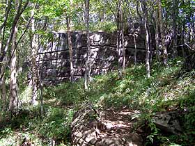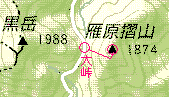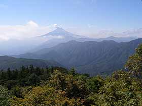 2006年9月24日(日)晴 (板橋区の自宅より二輪で)大峠1010…1050雁ヶ腹摺山1105…1145大峠(二輪で自宅へ) (1560) 40 (・1874) 40 体力度A 神経度A (歩行合計約1時間30分) (バイクの運転込みでは 体力度A+ 神経度A+) ◇5万図 都留 丹波スーパカブ90登山の第1弾は、自動車登山定番(?)の大峠〜雁ヶ腹摺山です。以前、500円札の絵柄として知られていて、行きたくても、余程の健脚者でないと日帰りは困難だった雁ヶ腹摺山。しかし、その後、勤務先の先輩から、「林道が出来て、大峠から僅かで達することが出来、地元の人で賑わっている。」との情報を得て、当時VT−250Fで行った事があります。現在残っているその時の印象は、山頂からの富士山は評判通りだったことと、山頂南面の草原(?)のイメージのみで、峠から山頂までの歩程については具体的記憶なし。再訪の価値十分(^^)。 近年、スーパカブ50を購入し、公共交通手段では日帰り困難な山に幾つか登りました。チェンジペダルやウインカーの独特の操作にも慣れてきて大変気に入っていたのですが、30q/h走行が困難な事や、2段階右折の煩わしさがありました。そんな中、環状8号線がついに東武・東上線を貫通し、自宅のある板橋区から、R20等西方への幹線道路へのアクセスが格段に向上しましたが、その部分は「原付走行禁止」の陸橋やトンネルが多く、カブ50(排気量49cc=原付一種)からカブ90(排気量85cc=原付二種)への乗り換えを決意した次第です。カブ90は50に比べて車長は同等、重さも7kgしか増えないので、最近、めっきり体力の落ちた筆者にも、取りまわしは容易。コケそうになったとき支えられる安心感からは、250ccの林道バイク等より山向きと言えそうです(^^;)。 50から90への転換に当たって一番心配したのは航続距離。元々街乗り用のカブですから、タンクが4Lしかありません。それでもカブ50は60q/L以上走っていたので、心配なく山へも入っていたのですが、カブ90でも同じ4Lタンクで定地走行カタログデータでは燃費が50の半分以下。もしカタログデータの比率通り30q/Lだと航続距離100q強なので給油にかなり気を遣いそう。補助タンクの携行も考えましたが、実際値は50q/L以上で、何とか山地以外での給油で間に合いそうです(^^)。 この日、始めは曇天の予想でしたが、東海上の台風が予想ルートの最東端を通ったため快晴(^^)。絶好の行楽日和となりました。板橋区の自宅から、環8−R20へ。しかし、R20の大垂水峠はなぜか休日小型二輪が通行禁止なので、国立付近から〔20〕−R16−〔413〕−〔412〕と迂回して相模湖駅前でR20に復します。 R20を進み、大月を過ぎて大峠への林道に入るのですが、R20を行き過ぎて「真木温泉」の標識を頼りに辿った結果、真木温泉で行き止まりになって引き返したり、多少の試行錯誤があった後、バス停もあり、真木川左岸を集落沿いに北上する如何にもメインルートと言う感じの本線に入りました。 大峠への林道は、全線舗装のうえ、殆どの区間で2車線あるいはそれに近い幅員を有し、峠に近付くにつれ、傾斜やカープは多少きつくなるものの何の不安もなく大峠に到達出来ました。 大峠。大峠到達時、既に、駐車スペースは満車で、左端(大月寄り)のトイレ近くに駐輪。右手の登山道に入りました。 始めは、樹林帯ですがやがて低木帯の明るい道となり、振り返れば富士山を中心とした展望が広がります。その後、再び樹林帯となり、石垣(?)が現れます。山城としては山奥過ぎますから、石垣のように割れた天然石なのかも知れません。その後、僅かなススキの原を経て山頂に到着。 明るい登り道から富士山方面の展望。 山頂直下の石垣?。ここからは500円札の富士山の展望が得られますが、ススキの原の両端は樹林帯となっているので、先程の途中の道の方が展望は広いです。北面は樹林帯で展望皆無。 山頂。
