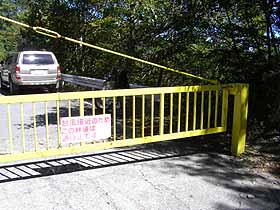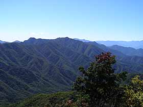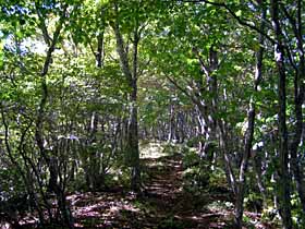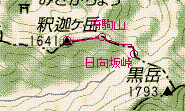 2006年10月8日(日)快晴 (バイクで)日向坂峠1144…府駒山1202…1226釈迦ヶ岳1251…府駒山1314… (1450) 18(△1562) 24 (・1641) 23 21 1335日向坂峠(バイクで帰宅) 体力度A 神経度A (歩行合計約1時間30分) (バイクの運転込みでは 体力度A+ 神経度A+) ◇5万図 甲府一雨毎に気温も下がって来て、バイク登山の適期も終盤、スーパーカブ90登山の第3弾は御坂・釈迦ヶ岳まで足を伸ばしました。近年、釈迦ヶ岳は様々なガイドブックや紀行に展望抜群の山として紹介されていますが、元々交通不便な御坂山地の主脈から更に北に外れていて、東京から公共交通利用では日帰りが厳しい山です。しかし、山頂の東側水平直線距離1.7km程の所、黒岳との鞍部の日向坂峠(どんべえ峠)を林道が乗っ越しており、ここまでカブで行ければ日帰り可能です。ちょっと長距離ツーリングになるうえ、バイク向け道路地図帳「ツーリングマップル」にも単なる車道の記号しか載っていない林道の状況は不安ですが、3連休の中日でもあり、天気も上々、バイクツーリングだけでも楽しめそうなので「ダメで元々」で決行しました。 板橋区の自宅から環八に入ると、温低+台風2個合体の「温帯台風」とも言える強力な低気圧が2日前に大雨を降らせたお陰で空気は澄み正面に富士、ついで丹沢主稜がくっきりと望めます。ただ、低気圧は遙か北東に去ったものの、名残の強風が吹き荒れていて、カブでの60km以上の走行時にはバランスを崩されてビビります。しかし、強風時は遠望が利く楽しみもあり、釈迦ヶ岳山頂での展望に期待が高まります。 高尾山横の大垂水峠が、休日は、何故か自転車はOKなのに小型バイク以下は通行禁止ため、R20−〈20〉−R16−R413−R412と辿り、相模湖駅前でR20に復します。この辺、渋滞していて「日向坂峠まで5時間以内」の目論みに暗雲。相模湖インター入口を越えると流れ出しましたが、不安定な2輪のカブ、強風の中、カーブでは4輪に詰められがちでビビります。 ビビりの極致は笹子トンネル。長いトンネルは風の影響はないものの、制限速度+α(計測誤差範囲)で走っていても後続の4輪は超違法速度で10mの距離に詰めてきます。ここで、万一バランスを崩したりして急減速したりすれば後ろから殺られるのは確実なので何とか穏便に追い越して貰いたいのですが、トンネル内は狭いので、追い越させる時も、四輪が遠くを通れば右にはみ出して対向車との事故に巻き込まれそうですし、はみ出さなければすぐ近くを通るので変な横風を受けて感じ悪いです。 笹子トンネルを抜けるといよいよ甲府盆地。南アルプス等の展望も広がりますが、「お楽しみは後」、ここで事故っては元も子もないので、脇見運転は程々に先を急ぎます。R20から「河口湖 御坂」の標識に従って左折、〈34〉に入ります。 この付近、観光農園が多く、道の両側にブドウ狩りの客引きが目立ちます。やがてR137に入り、若宮交差点では直進バイパス、左折旧道に分かれますが左折した後すぐ先で合流。 この後、目的の林道「蕪入沢上芦川線」の入口は案の定判りにくく、藤木野−立沢間の3kmほどを登って下って戻ってまた登って、ようやく見つけました。地図から見て、林道入口は、R137の左側を並行する金川に右手から合流して来る支流(唐沢川)の橋を渡った辺りというのが手掛かりです。 林道は完全に舗装されていますが、落石の跡が不気味。路上に残るのは最大で拳程度、あとは砂利ですが、道端に片付けられている石は、人頭大は当たり前、たまに50cm越えもあり、こんなのに直撃されたらひとたまりもありません。しかし、路面そのものは良好で、ビビりながらも気分良く美林や展望の中を登って行き、最後に支尾根を乗っ越した後、少しトラバースして日向坂峠に着きました。やはり、途中の渋滞が響き、5時間では着きませんでした。 日向坂峠のゲート。峠には「台風接近のためこの林道は通行止めです」と芦川側から読み取れる表示板の付いたゲートがあって、それが閉まっており、御坂側・芦川側それぞれに登って来た側に駐車して元来た方へ下るしかありません。カブをゲート近くに置いて、早速、釈迦ヶ岳への登りに入ります。 日向坂峠から釈迦ヶ岳への道は、小さな起伏をこなしかながら高度を上げて行くのですが、伐採跡地のような明るい道から広葉樹の美林に入り、見上げれば葉の間に金色に輝く木洩れ日とコバルトブルーの空、緑と一部色づき始めた赤と黄の葉でステンドグラスのような透過光、足下には花と、道自体楽しめました。 美林の道。 色づき始めた木の葉越しに山頂方面。三角点のある府駒山を越え、いよいよ釈迦ヶ岳本峰への最後の登りは両手動員の露岩の急登ですが、ひと登りで頂上と言う訳には行かず、左手に富士山の望める場所を過ぎて少し和んだ後、もうひと登りしてようやく山頂です。 釈迦ヶ岳山頂より、御坂主脈・節刀ヶ岳方面。 同地より、甲府盆地と奥秩父方面。山頂は露岩と低木に松などあって、天上の楽園のような筆者理想の