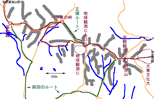 2013年6月30日(日)曇 東武線・高坂1205…西本宿信号1222…1258物見山1312…地球観測C入口1341… (30) 27 36 (△135) 29 (100) 54 1435笛吹峠1440…明光寺1500…学校橋1523…1545武蔵嵐山 (85) 20 (55) 23 (40) 22 (60) 体力度A 神経度A+(歩行合計約3時間40分) ◇5万図 川越 熊谷 □筆者参考文献 「埼玉県の山」(1995 山と渓谷社) 熱い季節に低山は向かないとされていますが、藪がなければ低山も里山も問題ありません。むしろ里山歩きは体力の消耗が小さいので夏向きかも知れません。そう言う訳でお手軽なコースはないかと地形図上を物色していると、この物見山が見つかりました。と言っても、5万図上には軌跡が欄外に地点名と時刻が記されていましたから、過去に行った事があるのです(2001.03.11)。ただし、その軌跡は一部、ガイドブックのルートから大きく逸れていますので、今回は、正規ルートを目指して、初めてに近い感覚で訪れることが出来ました。 東武東上線の高坂駅から西へ向かいます。歩道上には銅像(彫刻)が次々と現れますが、そのうち何体かは首、手、脚が切断された胴体のみのもので、見方によってはグロい感じがします。関越道を跨いで更に道成に行くと「大東文化大」の看板の立つ交差点(信号機に「西本宿」と表示)があり、右折。 正面にこれから踏み入る青垣を眺めつつ緩く登っていくと、左手に埼玉県こども動物自然公園が現れ、その先両側に大東文化大の施設を見送れば「←物見山」「岩殿山観音→」の標識がある峠に登り着きます。 まず、右手地下道をくぐって下って行くと岩殿観音の境内。観音堂の左手の階段を登ってさっきまで歩いてきた車道を渡れば物見山公園です。上へ上へと登って、最高点を乗り越えると頂上周辺は野球の内野くらいの広さの平地になっていて、四阿やベンチがあるのでここでランチタイム。広場の縁からは樹間にそこそこの展望を得ることが出来ます。 最高点の左側の巻道を使って先ほどの車道へ下り、100mほど先から右へ分岐する林道に入ります。前回はここへ入らずに車道をどんどん下って行ってしまって、笛吹峠へは車道を南側から上って行った事が5万図に記録されていますが、何故そうしたのか、記録も記憶もありません。今回は、取り敢えず正規ルートに入れたので一安心。この道は林道規格の舗装道ですがすぐに車止めがあり、遊歩道として機能しています。 美林の中を行く道。来てみるとここが本日の白眉です。素晴らしい美林の中を行く尾根道で、丘陵地帯にありがちなぼんやりとした地形ではなく、両側へ分岐する支尾根やその間に切れ込む谷の形がはっきりしていて、ミニ山岳を歩いている感じなのです。前回は、よりによりって一番肝心な場所を通らなかったという事が判明、再訪して良かったと思います。 いくつかの分岐を見送った後、少し尾根を外れてやや下って行くと反対側の車止めがあり、遊歩道終了。しかし、この先の林道も車は殆ど通らないのでのんびり歩けます。「地球観測センター→」の看板に従って右折して程なく地球観測センター入口ですが、敷地へ向かう広い道を見送って右手の林道に入ります。 やがて、右に分岐するやや細い道が現れますが、少し入ってみるなど迷った末それを見送り、道成に行きました。しかし、この道はどんどん尾根を離れてとうとう池のある場所つまり谷にまで下りてしまいました。やがて、開けて水田が広がります。まあ、この田園風景も悪くありませんが、今回も正規ルートを外れてしまったのにはガックリ。右手山裾沿いに進み、やがて突き当たったやや広い車道は笛吹峠道より1本東側の峠道です。ここから西へ突き抜けることが出来れば笛吹峠は近いのですが、西側は造成工事現場だったり林だったりして道はなく、結局、この車道を登って、ひとつ東の峠から戻り気味方向の尾根上の林道に入り笛吹峠に至りました。 笛吹峠。笛吹峠は林に囲まれ、トイレ、四阿、数台分の駐車スペースがありますが付近に商用施設や民家は見あたらないひっそりとした場所です。ここからは、林間の車道を下って行きます。リゾート地みたいで雰囲気はいいですが、車が通るので歩くのに最適とは言えません。バイクツーリングで通りたいような道です。 やがて里道っぱくなると、浅い谷を横切って緩い登りとなり、右手お寺(明光寺)の入口でと小休止。その先、再び緩い下りとなった道を行くと、平安時代、坂上田村麻呂将軍が東征中に心配して会いに来た妻に離縁を宣言したという「縁切橋」の表示板が目に留まりました。 下り切って都幾川を渡る学校橋付近からは笠山方面が美しく眺められます。後は道成に行って突き当たったら左へ少々で武蔵嵐山駅入口です。 今回のコース、物見山や笛吹峠等、地名のある所よりも、その間の無名の尾根道が一番素晴らしい場所でした、でも、それ以外の場所も都会の日常から離れて田園地帯を散歩するいい感じの道の連続でした。何回でもお手軽に訪れる事の出来る範囲内なので、次回