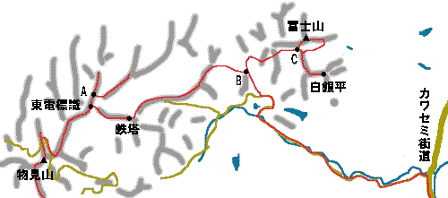 2014年11月14日(金)快晴 西武線・高麗725…802金毘羅神社818…824日和田山829…高指山前846 (110) 37 (260) 6 (△305) 17 (320) …905物見山915…(4回迷う)…1133富士山1153…1209白銀平展望台1220 21 (△375) 138(内約60分ロス)(△220) 16 (190) …1303重文高麗家前1308…1335JR・高麗川 43 (75) 27 (80) 体力度B-(迷わなければA+) 神経度B (歩行合計 約5時間35分(内約60分はコースアウト往復)) ◇5万図 川越例によって、近場でまだ行っていない山を5万図で探して富士山(埼玉県日高市)を見つけ、ネットで登山可能を確認。この山だけでは物足りないので日和田山〜物見山コースと結びました。物見山〜富士山の尾根道は所有参考文献に未掲載のルートで5万図で見たところ主尾根のつながりが不連続(それまでの主尾根の脇の一段下から別方向へ始まる尾根が主尾根の続きとなるようなパターン)なのでRF(ルートファインディング)を楽しめそうです。 高麗駅近くのセーブオンで弁当を2個購入。適当に道を拾って7-11の前から日和田山に入ります。山頂直下の金毘羅神社で絶景を満喫しながら1回目の弁当タイム。日和田山では小休止後、尾根伝いに物見山を目指します。車道へ上りついてすぐ右が高指山ですが、山頂が無線施設では立入れないうえ立木の成長で直下からも昔のような展望もないのですぐ引き返します。車道をゆるく下り指導標に導かれて売店の先から尾根道を登ればさほどの苦労もなく物見山ベンチや山頂標識のある物見山に着きます。ここからが本日の核心部。ザックからGPS、コンパス、革軍手を取出し難路に備えます。 結果としては4回道を間違えて引き返しました。しかし、この程度の歩程としては早めの出発としたので日没の恐怖なしで楽しめました。 物見山から尾根を道なりに進むとすぐに立派な三角点標石が鎮座。どうしてこちらに山頂標識を立てなかったのか疑問です。その先下って行くと両側に車道。右側に降りてみると車道が尾根を左へ回り込んでいる場所であることがわかります。そこで、車道のカーブ先端から入る尾根道を少し下ってみましたが方向がずっと北向き。目指す尾根は北東向きの筈なので引き返し、車道を南へ辿り、目指す尾根上らしき道の入口を見つけました。反対側に明瞭な道は見当たりませんので車道へ降りる道順は正解だったようです。さっきの場所については帰宅後ネットで見た2.5万図なら別の尾根であることがすぐに判るのですが、手持ちの5万図では山名注記の「見」や三角点標高注記の「3」の字のせいで車道が途切れていて判り難かったのです。 尾根道に入るとすぐに現れる左への巻き道は明瞭だったのですがそのまま下ってしまう可能性を恐れて、念のため尾根通しにピークを越えて行きました。次のピークを越えて下るとまたもや方向が北向き。引き返してピークの手前の分岐から東寄りの道を下ると、ここが本来のルートと確証を持てました。ここまで2回間違えましたがロスは合計数分位で済んでいます。しかし、この後かなりのダメージを食らう大間違いを犯す事になります。 この先大き目の段差がある屈曲点があることは5万図からも読み取れています。しかし、手持ちのGPSは頭上の視界を樹木等で塞がれていると機能しないので現在地の確認をしないまま道なりに進んでしまいました。やがて現れた分岐(A地点とする)には両方の道に赤テープがあり右の道は南方向へ戻るようなトラバース道っぽいので直進を選択。しかしかなり下ってGPSで現在地確認すると北へ下っていた事が判明(3回目の間違い)。A地点へ戻りトラバース道へ。 この道もトラバースから急降下の後明瞭な尾根道となりましたので今度こそはと思い、先を急ぎます。しかし、右手樹間から主尾根っぽい稜線を発見。GPSの使える場所まで行って現在地確認するとまたしても1本北側の尾根上のようでした(4回目の間違い)。今度は左手への分岐を見落とさないよう慎重に見ながらA地点より更に上まで戻ります。 東電の巡視路標識があった分岐まで戻り、なんとか現在地を確認。標識が「新所沢線69号」を指す物見山方面から見て右へ下っている道が正解らしいと判りました。さっき行った正面の道の入口地面にきにはポール類が横たわっていて「こっちへ行くな」の印らしくはなっています。しかし、それは筆者の目指す道と同じ道へ導くために設置したのかどうかは判らないので先ほどは気づいていながらも無視したのです。先ほどここでしっかり現在地確認をしていれば3・4回目の間違い(合計1時間近いロス)は犯さずに済んだはずなのでした。しかし近辺で開ける頭上の空は狭く、衛星がGPSの視界に入るまで待たなければならないため、すぐに信号が入って来ないと諦めて先を急いでしまっていたのです。地形図から判断出来たかもしれないのですが持っていたのは5万図なので細かい現在地同定は始めから諦めてました。それに主尾根が不連続だと山腹を直接下って先の尾根に移るとは限らず前の尾根を同じくらいの高さまで下ってから山腹を