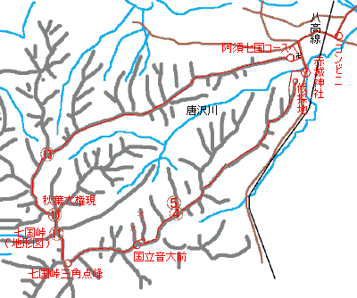2015年 1月29日(木)晴 西武線・元加治915…937コンビニ942…阿須丘陵七国コースへ957…L分岐点1042 (80) 22 (80) 15 (110) 45 (215) …1101七国峠三角点峰1118…1132国立音大前(下降路往復)1142 19 (△226) 14 (210) … (敷地北側を迂回) …1217C分岐点(D地点往復)1223 (支尾根往復20分ロス差引)15 (195) …1255尾根末端伐採地1302…赤城神社1315…1345西武線・元加治 32 (120) 13 (100) 30 (80) 体力度A+ 神経度B (ロス差引歩行合計約3時間40分) ◇5万図 川越 青梅七国峠と言えば東青梅−塩船観音から辿る霞丘陵コースを登り、北へ抜ける何本かの道のうちひとつを使って飯能へ下るのが代表的なプランですが、付近のなだらかな丘陵地には多数の道が通っているので様々なプランが組めます。今回は阿須付近から唐沢川を挟んで北側の尾根を登り南側の尾根を下る周遊コースを辿りました。初めて歩いた部分も大方の区間は遊歩道または林道仕様の道で無問題でしたが七国峠三角点峰の東850mくらいの所から直線距離300mほどの区間では国立音大敷地を避けるため若干右往左往しました。 元加治駅改札口は北側のみで駅前から左(西)側の踏切を渡り道なりに西南西へ進みます。郵便局の先を左折し駿台大を見ながら阿岩橋を渡れば<195>に突当たります。(正面にも細い道があるので厳密には十字路。)右へ八高線をくぐって行くのが順路ですが、その前に左のコンビニ(7-11)に寄って弁当購入。 程なく阿須の交差点で、目的の尾根の末端は目の前です。自治会館の裏あたりからすぐにでも取り付けそうでしたが、人目もあるので左の長澤寺へ回り込んで墓地の脇から尾根に乗りました。すぐに空掘状に乗越す道を横切り僅か先に何とトラロープの柵が。およよよ、早速立入禁止区域かとビビリましたがこちらから見える立札は裏側。ロープをくぐって立札を見ると「阿須丘陵七国コース ←」の表示。こちら側がハイキングコースの正規ルートで七国峠方面から来た尾根道はここから北へ下っているのでした。 ここから七国峠までは指導標完備の遊歩道が続きます。しばらく西南西方向ですが現地標識L地点を過ぎると左にカーブして道は南向きとなります。このあたり自動車の通行もありました。やがてI秋葉大権現、J地形図注記の七国峠、と通過して塩船観音方面からの道が合流するK七国峠に着きます。 この付近は広場になっていますがすぐ左側のピークに登れば三角点があります。昔は7つの国が見えたという七国峠ですが植林が育ってしまったため林の上に大岳山付近が顔を出す程度です。標石に腰掛けて弁当タイム。 七国峠三角点峰からの展望。三角点からは北東へ進みます。やがて道は東向きとなります。この辺は阿須丘陵七国コースには含まれませんがいい道が続きます。このまま阿須付近まで途中の下降路に入らないように分岐点での道選びだけ慎重に行えばいいと思ったのもつかの間、金網の柵が前途を塞ぎます。柵には隙間が設けられていますが「関係者以外は立ち入らないで下さい 国立音楽大学」という表示。 国立音大施設前。「グランド内に自動車・自二・原付等の乗り入れを堅く禁じます。」の表示もありますが、ここから見える範囲内にグラウンド関連の施設はなく潅木帯の趣。とはいえ、はっきり「関係者以外立入禁止」の表示があるのでこのまま進むわけには行きません。取敢えず左へカーブする道なりに下降しましたがどんどん北北西へ下って行くばかりなので引返しました。まだ日没まで相当時間があるので藪漕ぎの覚悟を決めて大学施設敷地の北側を迂回することを試みました。この辺の柵が稜線付近までなので僅か北側を迂回すれば少し先で尾根道へ復帰できると期待しての事です。 まず浅い谷を渡り支尾根に登り返しました。しかし、次の谷へは藪も深く傾斜が急で、これをいくつか繰り返すのは困難と判断しました。取敢えずこの支尾根を北へ下ることにしましたが、尾根道はだんだん不明瞭になり300mくらい進むと完全に藪。仕方なく引返しましがこれは幸運でした。先ほど支尾根に出た地点より少し登って主尾根に沿う金網に辿り着けたのです。 早速金網に沿うように左(北東)に進みました。すぐに金網がなくなりましたがここは当初予定通りの主尾根道です。尾根上はかなり幅が広く平らなので、昔一旦なにかの用地に造成して廃用になった場所なのかも知れません。やがて尾根上の藪がひどくなったので再び僅か北側を進むとしっかりした道に乗ることが出来ました。更に少し先では林道幅の道に合流し、程なく「阿須丘陵七国コース C →」の標識がある分岐点に着きました。何とかハイキングコースの正規ルートに合流出来たのでほっとしました。 分岐点Cには案内図がなかったので道なりっぽく見えた左側の道を選びましたがすぐ先の標識D地点に案内図があり、この道は行くと唐沢川の谷へ下りてしまうことが判り、C地点へ引返しました。この道は正規ルートがI秋葉大権現あるいはJ地形図注記七国峠から唐沢川に下った後、南側のこの尾根
