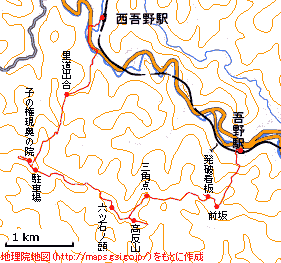 2015年 4月 2日(木)曇後晴 西武線・吾野858…932前坂937…943発破看板付近951…1028三角点1038 (180) 34 (440) 06 (460) 37 (△522) …1051高反山1056(東側往復)1108…六ツ石ノ頭1122…1203駐車場1219 13 (・532) 14 (540) 41 (600) …1227子の権現奥の院1233…里道出合1315…1342西武線・西吾野 08 (640) 42 (310) 27 (240) 体力度B- 神経度B (歩行合計約4時間10分) ◇5万図 秩父奥武蔵は近場なこともあり、あまり有名でないルートも歩いていますが、大高山の少し西〜子の権現は未踏でした。伊豆ヶ岳〜天覧山の尾根でガイドブックに記述を見かけないのが久須美坂〜多峰主山間(1995年11月踏破済)と今回の区間ですが、五万図を見るとこちらは如何にも採石場の縁と思われる崖記号が尾根を若干浸食して描かれていたので遠慮していたのです。しかし、ネットで検索すると結構歩かれているようなので、多少迂回させられることも覚悟の上で出かけました。 吾野駅前の広場から「吾野湧水」の標識に導かれて線路をくぐるとすぐ左、湧水の手前に大高山を示す標識があり、それに従って山道に入ります。驚くような急登ではないのですが、植林の中の道はぐいぐい高度を稼がせてくれ、駅があっという間に遙か眼下の眺めとなります。やがて登りが緩んで回りを見ると、植林は間伐や下草狩り等、非常に良く手入れされていて、近くの谷とかの地形が樹間を通しても割と明瞭に見えます。そして、しばらく行けば意外にあっけなく主尾根上の峠に着くことが出来ました。峠には「前坂」と書かれた標注があり、以前、天覚山〜大高山を歩いたときは今登って来た道を下ったはずです。ここからが未踏区間で、大高山とは逆方向、標識が「スルギ子の山」を指す方へ登って行きます。 尾根道を辿ると「ハイキングコース」という表示があるにもかかわらず、そのすぐ先に「発破実施注意」の看板があり、「発破時間 10時頃 12時頃、15時頃」「発破3分前にサイレンを鳴らしますから絶対にこの地点より接近しないでください。」との事でした。もうすぐ10時なのでさっさと通過しなければなりません。採石場は尾根の右(北)側のはずですが、前に続くの道はそこから若干左(南)側へ巻いて行くのでそれを進みますと、急に藪っぽくなり、尾根上に出ると殆ど道ではなくなりました。戻り気味にさっきの看板との間の460m圏ピークに登ってみましたが、道も指導標もありません。このまま藪尾根を強行突破すれば発破時間に採石場突入という事態も考えられましたので退却。そうしたら、看板より更に少し戻ったところで南側への明瞭な巻き道を発見。 この道は結構下って行くのでその時は「どれほど迂回させられるのか」と不安に思いました。しかし、数分で降り着いた車道を更に数分行くと採石場の上縁沿いとなり大喜び。この区間、尾根道が普通にピークを巻く程度の迂回で済みました^^)。本日、実際に発破作業していたのは尾根北側かなり下方でしたが、発破看板のおかげて藪漕ぎ強行突破を早めに断念出来たのは幸いでした^^;)。 採石場上縁より奥武蔵高原(グリーンライン)方面。採石場上縁の外れに小さな祠があってそこから車道と分かれて再び小径に入れます。この辺りは杉の植林帯が大部分なのですが、その先、雑木の痩せ尾根となって大喜び。その矢先、足がかりのはっきりしない数mの急登が現れてビビりました。右側は見た目60度以上の絶壁、左側も40度くらいはありそうな急斜面で巻道が見あたらないので、やはり直登するのが本線に間違いありません。掴まれそうな位置に立木も殆どないので、今日は使わないと思っていた皮軍手を着用し、四肢動員で木の根にすがって登りました。上部に「スリップ注意」の掲示がありましたが、下りだったらロープが欲しいような所です。 痩せ尾根の急登。522.0m三角点ピークでは標石に腰掛けてコースタイムを記録。さっきの藪漕ぎでボールペンを紛失してしまったので、デジカメ撮影時のタイムスタンプを利用、画像から同定困難な場所では仕方なく携帯電話のメモ帳機能で記録。筆者の場合、携帯電話は緊急連絡用で、メール機能も使っていないので文字を打つのに随分と時間がかかり、2〜3項目打ち終わったら10分近く経過していました^^;)。 その先、樹間に子の権現ピークらしき山が見えた後、再び尾根道は植林帯となり、登り着いたピークに「高反山」の標識がありました。小休止の後地図を確認せずそのまま進み、方向が変だと言うことに気がついて引き返しました。誤って標高差30mも下ってしまった所を登り返すのは精神的にも余計にバテる感じです。地図を見ると高反山は縦走ルートを外れているピークなのが判り、本線復帰へは山頂より更に少し引き返しました。 その後植林の中、特記すべきものがないような道が続き、「六ツ石ノ頭」標識ピークを過ぎた頃は頭の中は弁当の事ばかりでもう惰性で歩いていました。この日、朝食が早朝だったので昼食は11時前後が適当だったのです。しかし、コースタイムの記録上、目印