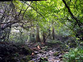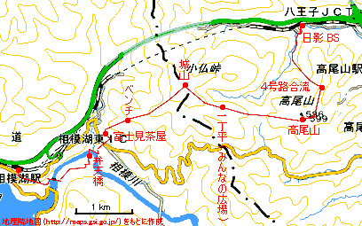 2015年 7月31日(金)晴 (京王線・高尾よりバスで)日影BS 925…1010 4号路合流1015…1030高尾山1050 (230) 45 (520) 15 (△599) …1120一丁平(みんなの広場)1135…1153城山1217…1247ベンチ1254…富士見茶屋1314 30 (560) 18 (△670) 30 (380) 20 (210) …1332弁天橋1337…1408JR・相模湖 18 (130) 31 (200) 体力度B- 神経度A (歩行合計約4時間00分) ◇5万図 八王子 上野原今回は、今まで知った高尾山の登山道で唯一未踏だったいろはの森・学習の道を登り、東海自然歩道を城山−弁天橋と辿りました。良く整備されたコースなので、真夏でも草や虫等の問題はなさそうです。 最近は影の薄い東海自然歩道ですが、設定当時は結構話題になっていて、筆者は「エアリアガイド 東海自然歩道@ 高尾から富士川へ」(1970 昭文社)を購入しています。 高尾駅から日影バス停までここ3回くらい徒歩でしたが、今回はバスを利用しました。いくら歩きに来たとは言え、灼熱の車道歩きは可能であれば辞退したいところです。 バス停の少し先で日影沢林道に入り、キャンプ場で左へ入り、バス停から10分ほどで右に北尾根(仮称)コースの分岐を見送り、沢沿いに進みます。沢を渡ってジグザグに登って尾根道となり、更に尾根の右側の道となると左から来る4号路に合流し小休止。この辺まで来ると下界の車道等に比べて環境は涼しいのですが、体内からの発熱で汗だくだくです。 始めは沢沿いのいろはの森・学習の道。すぐ先で右に分かれる4号路を見送って進むと、左からの1号路に合流して程なく高尾山山頂です。 天下の高尾山ですから平日ながら数十人で賑わっています。前回、3月に来たときは改築工事中だったビジターセンターが完成していたので見学しました。 城山を目指します。現在この道は殆ど奥高尾縦走路との認識ですが、東海自然歩道の一部でもあります。かなり下った後、登りますが、ちょくちょく振り返ってもなかなか高尾山が目の高さに来ません。まあ、高尾山から130m近く下っており、高尾山と城山の標高差は70mなので、かなり城山に近付いた地点まで来ないと高度が回復しないのは当然です。 やがて、広場に出て一休み。ここの地名を知りたくて周りを探すと「みんなの広場 一丁平」と言う表示を見つけましたが前回来た「一丁平」(展望台)とは様子が違います。帰宅後調べてみると、前回の「一丁平」はすぐ先のピーク付近で、今回は巻いてしまったようです。 大汗かきながら、城山に登り着くと、茶屋のかき氷を食べている人が目に付き、バカ高でもない(300円)ので「食べたい」という誘惑に駆られましたが、ここまでかなりお茶(2Lペットボトル)を飲んでいて、弁当を食うのにこれ以上胃をタプタプにするのは宜しくないので自重しました。山頂の広場は、殆ど茶屋のテーブルに占められているので、一段下の広場の倒木に腰掛けて弁当タイム。 一段下の広場から城山山頂部を見る。東海自然歩道はここから奥高尾縦走路と分かれて相模側へ下って行きます。30分くらい下ったところにベンチがあったので小休止。樹林の中の下りは始めは涼しかったのですが、里に近付くにしたがって暑くなってきました。2゚C違えば体感でもはっきり判ることは室内冷房でも経験していることで、気温差/高度差の0.6゚C/100mはバカになりません。足下に墓地が見え、富士見茶屋の前で里に出ます。 斜面の小径から弁天橋を見下ろす。ここから弁天橋を示す指導標を頼りに里道を行きますが炎熱地獄です。R20を渡り、車道から小径に入って下って行くと、少し涼しくなり、斜面をトラバースする道の途中から、弁天橋らしき橋が見えます。下りきって小さな橋で支流を渡ると、小平地に四阿のようなバラックが建っていて縁台風のテーブル上に大小4匹のぬこがリラックスしていました。 リラックスするぬこ4匹。少し登って、相模川に架かる弁天橋を渡り、小休止。どうと言うこともない場所ですが、緑に囲まれた川辺を歩くのが、R20を駅まで直行せずここまで足を伸ばす価値という事でしょうか。大分下ったので、駅までの登り返しが憂鬱です。 斜面を登り、またまた炎熱地獄の車道となって養護学校わきから突当たりを右へ。少し先で左・嵐山方面へ向かう東海自然歩道とお別れです。 右に発電所を見て、その先の堰堤が見えます。上を渡ってみると小河内ダムとかに比べるとかなりしょぼい感じの建造物ですが、確かにこれが相模川をせき止めて相模湖が出来ているのが判ります。堰堤名を見ると「相模ダム」。そのまんまやんけ。小河内ダム−奥多摩湖のように堰堤と湖の名前は違うのが普通なのですが。こんなに狭い幅で堰き止めて奥多摩湖に近い(帰宅後調べてみると約3/4)の面積の湖が出来ているのはかなり良い立地だと思いましたが、高さ(水深)がないので貯水容量は約1/4です。 相模ダムからそのまま車道を行けば湖畔の相模湖公園ですが、相変わらず炎熱地獄の中、右の小径を登って相模湖駅に直行しました。 今回、小径部分もほぼ遊歩道と言っていいくらい整備された道な