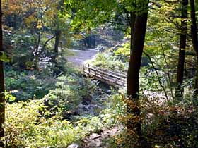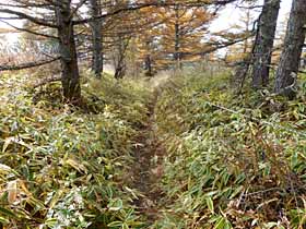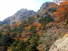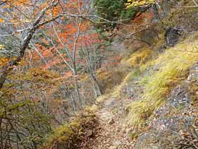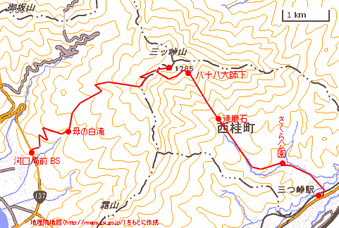2015年10月20日(火)晴 富士急線・三つ峠755…821さくら公園838…916達磨石922…1101八十八大師下1107 (615) 26 (660) 38 (950) 99 (1590) …1202三ッ峠開運山1254…1423母の白滝1432…1505河口局前BS(バスで富士山へ) 55 (△1785) 89 (1000) 33 (840) 体力度B 神経度A+ (歩行合計約6時間05分) ◇5万図 都留 □筆者参考文献 「東京付近の山」(1998 実業之日本社)まだ藪山(筆者的には主に超低山)には早い季節だし、先日の塔ノ岳大倉尾根の登りでゆっくり登ればそこそこの標高差は克服できる事が確認できたので、近年ご無沙汰している三ッ峠に行って来ました。初めて登ったのはもう45年くらい前で達磨石からの表コース。その後距離も標高差もバスで稼ぐ楽な裏コース、バス利用より更に歩程短縮のバイク使用の裏コース、笹子から清八峠経由のコース、と4〜5回は行ってます。(バイク以外のときの下山路はいずれも天上山コース。ずっと尾根なので好展望だし河口湖駅近くに下りられるのは好都合なので。) その後、バリエーションルートとして東尾根コースを試みましたが、アプローチで野犬の集団に遭い、ビビッて退散、それ以降この山には行ってませんでした。しかし、表コースは大好きな深夜アニメ「ヤマノススメ」でも紹介され、間違いなくいい山なのを再認識しましたし、でも前回の記憶は殆どよみがえらず、2回目もいいんじゃないかと思ったのです。今回は、下山路には参考書にサブコースとして載っている母の白滝コースを採用しました。 ところで、表コース、地図で見る限り、標高差も距離も大倉尾根ほぼ同等と言うかむしろこちらの方が若干小さい感じなのに、参考書のコースタイムでは大倉尾根3時間20分に対してこちらは4時間30分となっていて不思議です。執筆者による差もありましょうが、一冊の本の中ですから、グレードやコースタイムはそこそこ整合性を持っているはずなのにこの大差はなぜ?。大倉尾根を登ったのが僅か11日前ですから、今回はこの点についての確認もできると思いました。 時間的余裕を持って登れるように自宅最寄りのJR駅・埼京線浮間舟渡から朝一の電車で新宿へ。「Yahoo!路線情報」で調べたところ、この出発時刻だと大月で乗れる富士急の列車はJRの場合と変わらないので新宿−高尾間は京王線を利用。その方が片道331円も安いのです。(尚、JRなら新宿経由より武蔵浦和経由の方が乗車時間が短いが乗れる富士急の列車は一緒。) 降りついた三つ峠駅のホームから、三ッ峠も富士山も見えましたが、本日も朝からからあまり遠望の利く視界ではないようで残念です。 流石、表コース。駅前から指導標完備で迷う余地はありません。正面に三ッ峠を見ながら下暮地の集落(意外に住宅地が続くので、むしろ市街地と言うべきか)を行きますが、ちょうど通勤時間帯のせいか、自動車の往来が多いです。この辺、昔は、未舗装で、両側は殆ど畑か空き地の中を行く農道のイメージでしたが、記憶は確かではなく、もしかしたら歴史的な時間の経過を逆算した脳内イメージかも知れません。 浅い谷沿いとなり三ッ峠が見えなくなります。西桂町営レジャー施設「三ッ峠グリーンセンター」入口には表コースの登山案内図がありますが、驚くほど斜度が誇張されています(達磨石−八十八大師は83度くらいありそう)。 その先、右手に神社を見た後左手に岩のような形の公衆トイレ(近付いて見るとプラスチック製のようです)があるさくら公園。見渡す範囲内にベンチを発見できないので低い石垣に腰掛けて本日1度目の弁当タイム(^_^)。運搬距離を減らすため、弁当は出来る限り現地近くで調達するのが常ですが、「Yahoo!地図情報」で調べたところ、三つ峠駅付近にはコンビニが1件しかなく、適当な品が在庫切れだと困るので、本日は自宅側の駅近くで調達済みです。 だんだん傾斜がきつくなると道は蛇行します。1箇所車道右カーブのところを直進するショートカットの遊歩道があり、左下には透明な流れを見ることが出来ました。川底は一枚岩が多く滑滝状の部分と堰堤状の部分があり、ぱっと見コンクリート製っぽいですが良く見ると天然石のようです。人手が加わっているか自然のままかまでは判りませんが。 さくら公園から50分ほど車道を登って行くと左手に木橋があり、渡れば登山道の始まりです。少し登ると達磨石があり休憩。先ほどの木橋が見下ろせます。山頂まで3kmの表示も見かけたので大安心。それが事実ならこの先超1km/hの超スローペースで行っても12時半より前には登頂でき、13時出発としても十分な休憩時間がとれます。参考書のコースタイムで母の白滝コースは山頂→河口局前BSが2時間05分ですから、多少の遅れや休憩等を考慮しても15:38の富士山駅行バスには十分間に合う計算です。 達磨石付近から登山口を見下ろす。達磨石から八十八大師までは地図で見たとおりの急登が続きますが、途中、1時間も登ったところに「馬がえし」があり、びっくり。こんな急坂を馬に乗って登れたのでしょうか?。 八十八大師