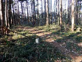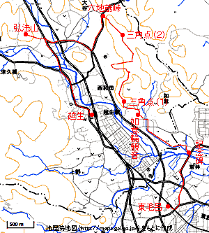 2016年2月4日(火)晴 東武線・東毛呂1216…1236記念碑1249…如意輪観音1312…三角点(1)1326 (60) 20 (50) 23 (80) 14 (△119.9) …1408三角点(2)1416…六地蔵峠1427…1501弘法山1509…1542東武線・越生 42 (△136.7) 11 (・88) 34 (164) 33 (65) 体力度A 神経度B- (歩行合計約3時間10分) ◇5万図 川越 ◇電子国土Webの当該コースに関係する部分を印刷して利用 □筆者参考文献 「武蔵野と奥武蔵」(1969 奥武蔵研究会)この季節向けのお手軽な超低山コースはないかなと、上記参考書をめくっていて目に入ったのが山吹丘陵という見慣れない項目です。標高差も距離もお手軽レベル。最近の情報を得ようとググってみれば、「山吹の里」しかヒットしませんから、ハイキングコースとしては、少なくとも近年では一般的でないのでしょう。もう少し大きな山だと道を誤れば遭難と言ううこともあり得ますから、一般的でないコースはルートファインディングに神経をすり減らすことになります。しかし、これくらいの山ならば道に迷っても少々タイムロスしたり里道歩きが多めになる位のことなので、それは覚悟の上と言うか、どれだけ想定通りのルートを辿れるか、というのもむしろ楽しみでもあります。 東毛呂駅に着いた時はもうお昼の時間ですが、駅舎内改札口そばのベンチで弁当を食べるのは変な感じがしたので、早めに適当な場所を見つけることにして取敢えず歩行開始。目指すルートは線路の東(北)側ですが、改札口は西(南)側にしかないので、駅前から左手の小道を通って踏切を渡ります。三叉路を左折し、道也に行けば最初の目標地である越辺川橋を渡ることが出来ました。橋からの越辺川上流方向の景色を眺めたら、左岸の大きめな白い鳥を1羽発見。写真に撮り、帰宅後調べたらハクチョウではなくサギの類のようです。筆者が野生で見た鳥としては最大級かも。 橋を渡り切ると左に遊歩道が延び、50mくらい先に座れそうな場所を発見。行ってみると、「毛呂山北部土地改良区竣功記念碑」でした。礎石に腰掛けて弁当タイム。次の目標地は山吹丘陵の119.9m三角点ピークです。 記念碑から道也に遊歩道を進み、目標方向(北西)に向かう水路沿いの農道を行きます。参考書では先ほどの越辺川橋からそのまま北上し箕和田湖に寄った後、その手前の道路を西進していますが、箕和田湖にはわざわざ寄る気も起きなかったので、参考書執筆当時はなかったと思われるこちらの道を選択しました。のんびり歩けて、眺めも広い道です。正面遠景はすぐそれと判る笠山、左手は大高取山で、笠山の右手前、こちら(南)向き斜面に住宅地がある山が目指す山吹丘陵でしょう。 農道より笠山と山吹丘陵。農道が北に向きを変え、突当たった車道を僅か西に行った交差点はもう山裾で「如意輪観音」を示す標識が目標方向(北西)を指しているので、そちらの道を登って行きます。車道の後に階段を登るとそれらしきお堂がありましたが、その後ろの斜面を更に登って行く道はありませんでした。北へ下る道があったのでそれを下り、住宅地下部の道を西進、階段を登り、西へ北へと道を拾って行き、住宅地上部西端から小径に入ります。その先、笹だらけの部分があり、この季節に来て良かったと思いました。それを過ぎるとあっけなく119.9m三角点と思われる標石を発見出来ました。次の目標地は北の尾根続きにある136.7m三角点ピークです。 119.9m三角点。また、笹薮区間はありましたが、その先は藪は少な目で、雑木の美林もありいい感じで歩けました。道は稜線のやや西側を北上してる感じでしたが、やがて突当たり的な分岐に。右の方が登っていて稜線に近付く感じでしたが、方向が東寄りであさっての方に行ってしまう恐れを感じました。左は西側から巻いて、北へ登って行く期待が持てましたのでこちらを選択。ところが、この道はそのまま西へ下り、里へ出てしまいました。でも里道を少し行くとすぐに山側へ向かう道があったので、それを進みました。すぐに林道は小径となりましたがどんどん登って行けば支尾根を経て主尾根の道へ出ることが出来ました。この道を行くと、一旦主尾根の西を巻いた後、右手にゴルフ場が見え、その境界柵に沿って北上するようになります。やがて、三角点ピークが近付くとまた西側を巻くようになりました。もう、三角点は近いはずで、道也に行くと通り過ぎてしまいそうなので、右手に逸れて、藪ではないものの道か道でないのか判らないような所を、上へ上へと行きました。すると、前方に広めの明瞭な尾根道を発見。その道に出たらすぐに136.7m三角点と思われる標石を発見出来ました。おにぎりタイム。次の目標地は六地蔵峠です。 136.7m三角点。三角点から尾根道を北西に下って行けば間もなく石像群のある地点で広い車道に出ました。ここが六地蔵峠で乗越す車道は<41>です。山吹丘陵はここまでで、次の目標地は弘法山です。 <41>は車が疾走していますが、歩道付きなのでビビらずに歩けました。越生高校(北)交差点で右折し、