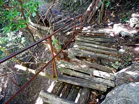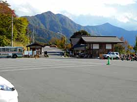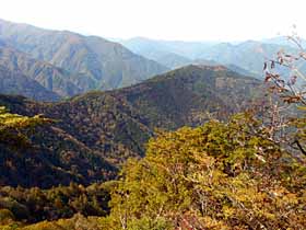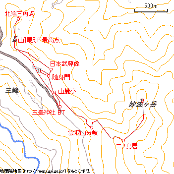 2016年10月12日(水)晴 (西武秩父よりバス)三峯神社BT1028…1033山麓亭1046…雲取山分岐1104 (1045) 05 (1065) 18 (1155) …1146妙法ヶ岳1223…雲取山分岐1302…山麓亭1319…1323随身門(参拝順路周回)1333 42 (1332) 39 (1155) 17(1065) 04 (1080) …1335日本武尊像1345…山頂駅P最高点1400…北端三角点1405…1428三峯神社BT 02 (1090) 15 (・1127) 05 (△1101) 23 (1045) 体力度A+ 神経度A+ (歩行合計約3時間05分) ◇5万図 三峰 □筆者参考文献 「関東百名山」(1993 石丸哲也他)妙法ヶ岳は秩父三峰の北峰にあたり、昔(93.10.1)登ってきつくない割に岩っぽい感じや展望が良くて好印象でした。最近、バイクで三峯神社駐車場まで行ったとき思い出して、また登ろうと思いました。しかし、昔使ったロープウェイが廃線になってどうしたものかと思っていました。麓から登ることも可能ですが、それでは「きつくない」という特長が生きません。バイクか車で三峯神社駐車場まで行く事も考えましたが、運転もそれなり体力や神経を使います。 そんな中、先日、バイクでバスとすれ違った事を思い出し、ネットで検索してみると、西武秩父駅から三峯神社駐車場まで東京から日帰りで利用可能な時間帯に直通バスがあるではあ〜りませんか。これを使って行くしかありません。西武バス 西武秩父駅−三峯神社の運賃927円(パスモ)は、秩父鉄道 御花畑−三峰口 440円、西武バス 三峰口−大輪 309円(パスモ)、三峰ロープウェイ 大輪−三峰山頂 950円(運行当時) の合計1,699円より遙かに安いですし、乗換えがないから安心して居眠りも出来るし(^^;、むしろ前回より好条件です。 西武秩父駅BT9:10発のバスに乗れば、定刻の10:25には三峯神社BT(三峯神社駐車場)に到着しました。(途中交互通行の区間もあるので、休日は遅れが出そうです。)表示に従い、駐車場の後ろ斜面を登って行くとビジターセンターの前を通り、雲取山登山口(奥宮参道入口)に着きます。すぐ先に山麓亭という大きな飲食店兼土産物店があり、向かいのベンチは開放されていたので、ここで軽い弁当タイム。 登山口から7分ほどコンクリ道路を行くと鳥居をくぐって山道(小径)に入ります。途中「5M先にクロスズメバチの巣があります。刺されないように注意しましょう。刺された人がいます。」の表示がありますが、巣を撤去できないのでしょうか?。 やがて左手の2つ目の鳥居(一ノ鳥居)をくぐって雲取山への縦走路から分かれます。3つ目の鳥居(二ノ鳥居)の手前からは太陽寺への道が分岐していますが、山崩れのため通行止になっていました。4つ目の鳥居付近からは岩っぽくなって、多少のアップダウンも出てきます。朽ちかかった木の桟道はちょっとビビって山側を歩きます。最後に下部45度くらいある急な階段を手摺にすがって登り切れば、石祠(三峯神社奥宮)のある妙法ヶ岳山頂です。この付近1300m圏にいくつかあるうち一番奥(北)の岩頭です。 妙法ヶ岳より山頂駅Pから南へ続く尾根を望む。樹木のためぐるり360度と言う訳には行きませんが、雲取山方面への尾根や白石山、白泰山、両神山、二子山等、更にはその後ろの西上州の山々の展望が素晴しく、三峰山頂駅ピークから南下する先ほど辿って来た尾根も見下ろせました。山座同定でも始めようものなら時間がいくらあっても足りなさそうです。山頂北西端の足下が切れ落ち前が開けた場所で本日2度目の弁当タイム。 妙法ヶ岳山頂近くの朽ちかかった桟道。来た道を、山麓亭前まで戻ります。ロープウェイ利用なら下りは歩くところですが、本日は三峰山頂駅ピーク周辺を散歩して、三峯神社BTからバスで西武秩父へ戻る事にしました。まずは三峯神社へ。 三峯神社は過去2度は訪れている筈なのですがどんなところだったかの記憶が殆どないので初めて同様の気分です。入口の鳥居をくぐって3分ほどで「参拝順路」と示された先に「山峯三」と書かれた門(帰宅後「随身門と知る)があり、時計回りに一周して10分ほどで随身門の横に戻ってきました。途中、拝殿等の建物には極彩色の彫刻が施され、見ごたえがあります。山上の寺社は珍しくありませんが、筆者が見たそれらの中では最大級の規模です。帰宅後の検索で拝殿は1800年建立、1962年改修と、現在の姿になったのは比較的最近のようですが、それにしてもこんな比高の大きい山の上によくこれだけのものを造ったものです。ただし残念ながら社格は伊勢神宮Sランク、明治神宮等をAランクとすると、ここはEランク以下のようです。 次は、この辺り三峰山頂駅ピーク最高点を目指します。取敢えず随身門横から上へ上へと登って行きますとあっけなくピークに着いてしまいました。中央部には岩が積み上げられ、中心に弥生人みたいな出で立ちの巨大な立像。記念碑を見て日本武尊と知りました。ここで5万図(平成元年)を確認すると、三峰山頂駅ピーク最高点はここより北北西1km近く先にある1101.5m三角点付近のようです。行ってみることにします。 尾根通しに車道から山道(小径)に入り緩い起伏のピークを越えていくと再び車道