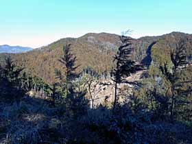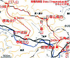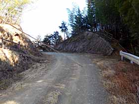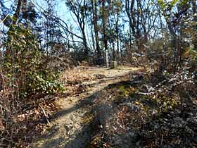 2017年2月3日(金)快晴 (東武線・小川町駅よりバス)寺岡BS840(15分ロス)…安戸城跡907…標高点P943 (135) 27 (・239) 36 (・340) …分岐1008…臼入山1019…1029分岐1053…1157官ノ倉山1208…1216石尊山南西1221 25(410) 11(△421) 10 (410) 64 (・344) 08 (340) …1259三角点1312…1330腰越城跡本郭1351(10分ロス)…1410木落しBS(小川町駅へ) 38 (△249) 18 (216) 19 (105) 体力度A+ 神経度A+ (歩行合計約4時間15分) ◇5万図 寄居 □筆者参考文献 「埼玉県の山」(1995 堀江昇他)前回(北側の町境界 291m標高点P〜三郡境のルート)に引続き、臼入山のバリエーションコースです。しかし、今回のコースは官ノ倉山−臼入山の一般的ルート以外の区間もネット上に複数の報告があります。つまり、結構歩かれているルートのようで、前回より難度は低そうです。なので、あまり詳しい情報は仕入れずに出掛けました。ただし、今回は前回身にしみて、多少迷っても余裕のある早出です。 寺岡BSから地形図の破線入口を目指してバス道を100m強前進。神社を見つけ、その先(左側)の小径を登ります。すぐに保育園のフェンスに突当たりましたが右は保育園入口で行き止まり。で、左から回り込んだものの、保育園の裏手から道はありません。バス道に戻って、神社の右の小径を行ったらすぐに保育園のフェンスで行き止まり。またバス道に戻り、寺岡BS方向へ引き返し、今度は保育園の看板のあるコンクリ車道へ入ると、保育園の門の前からはダートになり、明瞭な道が山中へ続いています。これを辿ると、安戸城跡(239m標高点ピーク)に登り着きました。 安戸城跡はその表示と多少の造成跡は見られるものの、門外漢の筆者から見て目立つ城跡らしい痕跡はありません。しばらく行くと突当たり(三叉路)があり、勿論左へ行きます。 340m標高点Pらしき場所を過ぎると伐採地となり、前方には今歩いている尾根が右にカーブして臼入山手前方面へ向かう様子が、右手の主稜(官ノ倉山−臼入山)山腹には車道が望まれます。少し先で右手に車道らしき道が接して来ますが、さっき見えた車道の続きではなさそうです。 340m標高点Pの西より尾根分岐点(臼入山南東約260m)方面。右にカープした尾根道をぐいぐい登っていけば最後斜度が緩んで、登って来た尾根道が主稜の道に突当たる分岐(三叉路)に着き、左に5分ほどで、また三叉路になっているピーク、更に左へ5分ほどで臼入山山頂です。 ここは樹間に展望もあり明るくていい雰囲気の場所なので、弁当タイムにする予定でしたが、風が強く、弁当の中身が吹き飛ばされそうなほどで、しかも寒いので、写真を2枚撮っただけで退散。先ほどの分岐点で弁当タイムにしました。木に囲まれて展望のない場所ですが食事するには風が防げる方が大事です。 尾根道分岐点。左・官ノ倉山、正面斜め左・安戸城跡方面。腹ごしらえが出来たら官ノ倉山への縦走開始。この道は1999年10月に逆向きに歩いているのですが、道の様子の記憶は殆どありません。記録を読むと当時は官ノ倉峠−臼入山のコースもバリエーションルートだったようで、日曜日なのに人に会うことなく、藪っぽい細道を枝道進入に注意しながら歩いたようです。しかし、現在は一般的なハイキングコースになっていて、平日なのに数組のハイカーに出会いました。 8分位行くと、左手に金勝山や本田技研の事業所が見下ろせる場所がありましたが遠景の赤城山等はモヤの中でした。そのすぐ先では尾根道では比較的珍しい竹林になっていて、鞍部を車道が切通し状に乗越していました。今朝、南側の尾根から見えた車道でしょう。 竹林と車道。その先、小さなピークをいくつか越えて行きますが、それぞれに「天ノ峰」「虚空蔵山」「不動沢ノ頭」などと私設の山名表示がされています。 やがて、小広い鞍部に道が交差する官ノ倉峠を過ぎ、「さっきまで無名ピークの上り下りと違い、流石、名のある山だと」と思わせる露岩の出た道を登れば官ノ倉山です。 以前は木立に囲まれて展望はなかった官ノ倉山の山頂の展望が良いのにはびっ栗!。赤城山は相変わらずモヤの中でしたが榛名山はうっすら見えました。木があまりないのにさっきの臼入山のような強風はなく、気温も上がって来たのでベンチに座っているのは結構快適ですが、もう食べるべき弁当がないのは残念です。直下のテラスからは笠山・堂平山が目立ちます。 官ノ倉山東峰に当たる石尊山はこの山域で最高の展望地のはずですが、行ってみると雑木の中で展望がなくて期待外れ。山名標識もなく何かの間違いかと思って頂稜部を20mくらい先へ行って前を覗いてみましたが下ってる感じでやはり樹林帯が続いている様子だったので諦めました。でも、何となく違和感が残ったので、これを書くに当たって調べてみると、やはり勘違いでした(^^;。石尊山の頂稜部は南西〜北東に100mくらいあって、筆者のこの日いた腰越城跡への分岐ピークはその南西端、展望の良い祠のある場所(頂上)は北東端にありました。頂上まで往復する時間は十分あったのに