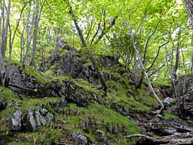 2017年5月29日(月)晴 (西武線・飯能よりバス)名郷BS753…支尾根上903…1058蕨山1125…1155藤棚山1204 (327) 70 (828) 115 (1033) 30 (△920) …1239大ヨケの頭1245…金毘羅神社跡1347…1428さわらびの湯BS(バスで飯能へ) 35 (・771) 62 (580) 41 (250) 体力度B 神経度A (歩行合計約6時間10分) ◇5万図 秩父 □筆者参考文献 「埼玉県の山」(1995 打田^一他)蕨山は少なくとも過去2回は登っているはずなのですが記録が見つかりませんから1992年以前だと思います。今回の、名郷から登って金毘羅尾根を下るコースはごく一般的な日帰りコースのイメージですし、記憶も殆ど残っていないので再訪場所としては絶好かと思いました。 「ヤマノススメ」痛バス。飯能駅で乗車した湯の沢行き一番バスはアニメ「ヤマノススメ」の痛バスでした。橋を渡って入った林道は15分ほどで終点となり、ここが登山口です。 ここから植林帯をジグザグに登って行きますが10分ほどで息切れして、休み休み行きました。やがて、蕨山のすぐ西のピーク(1044m)から北に張り出す支尾根上にたどり着きますが、ここまで参考タイム50分のところ、1時間10分かかっています。 左に尾根を登って行きます。雑木の美林や芝、苔むした露岩の道は絵画の中を行くような趣です。しかし、もう息切れだけでなく足も重く肩も凝って来ました。時間は十分あるのでマイペースで行きますが、素晴しい道を堪能する余裕はあまりありませんT_T)。 美林と露岩にコケと芝の尾根道。へろへろになりながら、有間山分岐(1044mP頂稜部北端)に着き、左へ僅かで蕨山山頂です。名郷から参考タイム2時間のところ3時間5分も掛かってしまいましたT_T)。参考タイムの1.5倍は異常としか言いようがありません。たまたまの体調不良?。全てが加齢による体力低下でない事を祈ります 山頂の様子もショックでした。昔のイメージでは、山頂部は広い禿山で有間山の山稜が大きく見えたのですが、実際は樹間の切開きで、低木部分の上から遠い山が見える程度。本日は視程が悪いので結局、山座同定する気になるような景色はありませんでしたT_T)。この季節、人にたかる虫が多いのは知っていましたが、防虫スプレーを忘れたのは不覚でした。ハエ等を気にしながらの弁当タイムの後、金毘羅尾根を下山します。 始めザレて滑り易い下りかあり、足を滑らせて小石を転がしてしまいました。そしたら、間が悪い事に本日唯一すれ違った登山者が下方に見えました。「ラク」と叫んでみましたが石は途中で止まったようです。すれ違いざまに「すいません。足を滑らせてしまって。」と弁明したところ、にこっとして「大丈夫ですか?」。申し訳なく恥ずかしかったです。 金毘羅尾根も美林の道。金毘羅尾根の道は登りや急な下りは少なめで、比較的穏やかに下って行けますので、バテた身には助かります。相変わらず視界が開ける場所は殆どありませんが美林が続きます。 金毘羅神社跡。石祠がある金毘羅神社跡からは右にやや急に下って行きます。河又に下りるはずでしたが、車道に下りついた地点直近のバス停は「さわらびの湯」でした。名郷−河又−飯能間のバス路線でさわらびの湯−河又は盲腸線ですが、時刻表を見ると日中は殆どさわらびの湯に寄るようです。なので、河又までの車道歩きは割愛してここでバスを待ちました。下りも参考タイム2時間20分のところ、約3時間かかってしまいました。 展望には恵まれませんが、雑木の美林や露岩の道は趣があり、それなりに楽しめるコースだと思います。今回、歩程が6時間を越えましたが健脚者なら4時間もかからないと思います。 ▲項目索引▲ ◎トップページへ戻る◎ |