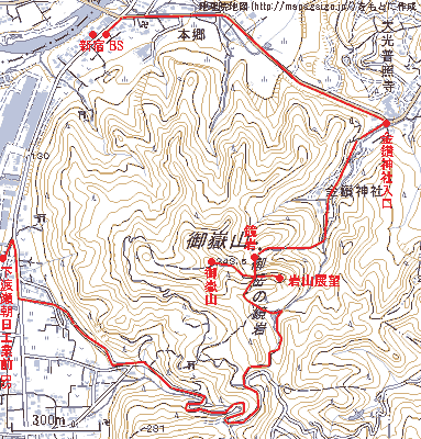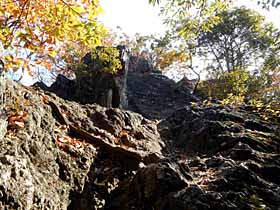 2017年11月15日(水)晴 (JR・丹荘駅…公会堂前BSよりバス)新宿BS844…金鑚神社入口859…918鏡岩923 (120) 15 (160) 19 (280) …御嶽山933…946岩山展望1045…下渡瀬朝日工業前BS1126 10(△344) 13 (320) 41 (130) (…新宿BSよりバスで丹荘駅入口BSへ…丹荘駅) 体力度A 神経度A+ (歩行合計約1時間50分) ◇5万図 高崎昔は行くべき山やそのルートを決めるのはガイドブックの情報からでしたが、掲載されている中で個人的ニーズに合った山は殆ど登りつくし、僅かに登り残したルート(例えば鳥屋戸尾根。初心者の頃はガイドブックの「若干山慣れた人向き」という記述で遠慮していた。)も昔なら行けそうだったけど今ではきつそうだったりします。軽く登れて面白そうな個人的未踏の山はないかと、ネット上で地理院地図を徘徊し、手ごろな大きさの山を見つけたら検索でふるいにかける今日この頃。しかし、地形図上で「これは!」と思っても、登った人の記録を読むと難路しかルートがなかったり、展望皆無のうえ他にも特筆すべき見所がなかったりが殆ど。で、久々に見つけた良さそうな山が神川・御嶽(みたけ)山です。交通の便はよくありませんが、歩程が短いので、東京から公共交通機関利用の日帰りは比較的容易です。 八高線・丹荘駅前を左に行き、線路と交差するバス通り<22>に出ます。左折し、踏切を渡って南西方向へ。最初に見つけたバス停は、事前に調べてあった丹荘駅最寄バス停・丹荘駅入口ではなく、神川町役場入口でした。事前に地図で見つけたバス停記号はこちらですが、踏切の手前(北東側)のバス停記号(丹荘駅入口)を見落としていたため勘違いしていました。で、バス停に掲示されている時刻表を見ると次のバスまで30分以上ありました。まだ8時前で、じっとしてても寒いだけなので、バス通りを目指す方向に歩き、二つ先のバス停・公会堂前で乗車しました。 新宿BSで下車。少し戻って右折しR462を行きます。始め右側を歩いていましたが、結構交通量も多く大型車の比率も高いのでビビり、左側だけにある歩道に移動。しかし、この歩道もなくなってしまい再び右側を行きます。神経度A+の「+」は、ここでのビビり度に対して付けたようなものです。 金鑚神社の入口より境内の道。金鑚(かなさな)神社の入口でR462から別れ、左手の鳥居をくぐっても車道が続きますが、周りの景色は神社の境内で、それっぽい建物を何箇所も見ることが出来ます。 神社の奥から「←御嶽山 入口」の標識に導かれて遊歩道的な山道を登って行くと10分ほどで鏡岩。4×9mほどの断層面の露頭ですが、国指定特別天然記念物と言う割に、ぱっと見はしょぼいスラブです。 鏡岩から僅かな登りで稜線に達します。ここは左・岩山展望、右・御嶽山山頂、正面右に南側へ下る道がある峠となっています。取敢えず山頂を目指して右へ登って行きます。「山頂へ0.2km」の指導標がありますが、山頂直下はトラロープも設置されているような急登なので意外に長く感じます。ここは遊歩道ではなく、木の根、露岩の道なので、ちょっと「登山」の実感があって楽しい。 御嶽山山頂。山頂は気に囲まれていて、展望は良くありません。山頂の平坦地の写真と、そこからまばらな立木越しに見える赤城山方面の写真を撮って下山。下りは山頂直下より、登りの時はなんとも思わなかったトラロープのなくなった辺りがずるずると滑りそうで怖い。 先ほどの峠まで下り、尾根をそのまま進むと四阿や石仏群のある広場になり、その先、指導標が「岩山展望」(なぜか「台」が付いていません)を指すピークに登って行きます。この登りは比高は僅かながら、完全に露岩の道なので本峰の登り以上に「登山」の実感があります。頂上岩頭の僅か手前がやや平坦に均してあるのでここで弁当タイム。 岩山展望への露岩の道。 岩山展望の休憩地。遠景は左・城峯山、右・雨降山。ここからは、北東方面、平野の先に榛名・赤城の山々が、南西方面に城峯山・雨降山が目立つなど360度の好展望が得られます。西側は御嶽山本峰が遠望を塞ぎますが、岩頭の向こう側に回り込めば東側の平野が見下ろせて、工業団地右側のソーラーパネル群が目を引きます。岩頭上からなら両側見えるわけですが、狭くて怖そうなので、そこに立って見渡すのは遠慮しておきました。この岩頭の標高は、地理院地図からは310mくらいまでしか表示されませんが、本峰(343.5m)との目視による比較では320mくらいありそうです。食事をし展望を楽しんだらまた峠に戻ります。 峠から南側へ下りました。少し下ると林道となり、右ヘアピンカーブ(実は沢沿いに直進すれば金鑚神社に戻る道もある三叉路)手前の湿地を木道でショートカットの後、緩く登って尾根を乗越すと雨降山や御荷鉾山が見えます。道は山腹を下って行き、ゴルフ場から下って来る舗装道路に合流。この道はかなり大きく蛇行して下って行きますが、ショートカットの小径はなさそうです。 下り切る寸前の所に「渡瀬コース」の登山口があり、「ハイキ