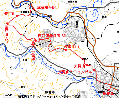 2017年12月9日(土)快晴 西武線・飯能駅0720…0737天覧山入口コンビニ0743…0750天覧山0805 (108) 17 (117) 07 (・197) …0836多峯主山0901…西武飯能日高BT0943…0955丘の上公園1025 31 (△271) 42 (209) 12 (256) …1116釜戸山入口1126…釜戸山1147…1222武蔵横手駅 51 (・303) 21(△293) 35 (115) 体力度A 神経度A+ (歩行合計約3時間55分) ◇5万図 川越早く目覚めた好天の日。思い付きで山へ。天覧山・多峯主山はそういう時手軽に行けて、展望もいい山。早出だからそれだけでは勿体ないので天覚山方面に下りたくなるまで行ける所まで行ってみようと。当初は大高山までの大縦走(火暴)も可能性として視野に入っていましたが…。 今回の懸案事項は多峯主山の西の宅地造成地(永田台)の通過です。95.11.18に逆コースで通ったときは造成地の南縁にわずかに残された林の中を辿ったりしたのですが、現在その辺りは工事予定地で立入禁止です。最近、バイクで永田台側の登山口まで行って多峯主山に登った事はあるので永田台までは心配ないのですが、永田台の西端で天覚山方面に続く尾根道へスムーズに入れるかどうかが憂慮されました。 飯能駅からすぐ西に向かった方が近いのですが、駅すぐのファミリーマートに普通の弁当がなかったのでコンビニを求めて北上、バス通りを西へ行きます。しかし、コンビニなし。飯能河原交差点から北上すればすぐ左が天覧山入口ですが、そこにコンビニらしき商店がありました。看板に「time's」とありますが7-11のような大手チェーンではなく個人経営の万屋という趣です。しかし、幸いそこで幕の内弁当を入手することが出来ました。帰宅後検索したら「タイムズマート」という元フランチャイズチェーンで、現在は本部がなくなって独立経営のようです。店の人に、天覧山も出て来た深夜アニメ「ヤマノススメ」(2期まで放送済)の影響を聞いてみると「たくさん来た。海外からも来た。」とかなり集客に寄与したようで、「今度3期がある。」と、続編の放送にも期待している様子でした。 この日は比較的視界良好で、天覧山から富士山もくっきり見えました。多峯主山へは、尾根を辿る事が多いのですが、この日は一旦谷へ下り、見返り坂を登るメインルートを採りました。多峯主山からも好展望を堪能しました。 多峯主山より大持山(手前に丘の上公園の塔)・武甲山方面。左手にソーラー発電所や水道タンクを見つつ造成地(永田台)側の登山口に降り立ちました。造成地の南縁に沿って進もうとしましたが立入禁止地帯の手前を沿う道路は段差(急な下り斜面)の所で右へカーブしていて、登山口から北北東に向かっていた道に合流。そこまで始めから真っ直ぐ行ったときと比べて400mくらい余分に(2倍以上)歩いてしまいました(^^;。 ファミリーマートのある交差点を越して道也に行けば左へカーブして造成地西端の道に突き当たりました。僅か左、「西武飯能日高」バスターミナルの先(南)から山の方(西)へ登る車道発見。これを登って行くと最後右へカーブして「横手配水場」に突当たりました。車道はここでお終いですが、30m位手前に山側へ登れそうな場所を発見。道なのかどうか分かりませんが、藪もないし足場も悪くないので登っていくと、上方に横向きの鎖が見えます。 「駐車場でもあるのかな」と思いましたが、登り着いてみると広めの平坦地が造成されていて右手(北端)には携帯電話基地局らしきアンテナ塔。左の方に「利用に関する注意事項」の看板があって ここが「丘の上公園」である事を知りました。四阿もあったので、ここで弁当タイムにしました。 丘の上公園より多峯主山方面を振りかえる。丘の上公園への本来の道は、横手配水場への道より大分南側から登って来ているので、結果的には近道することが出来ました(^_^)。ここからは、造成地の家並や段差、その先の多峯主山方面が眺められます。 看板の奥から登山道があり、これを登っていけば「天覚山 久須美坂 公園広場」の標識。この付近は277.5m三角点ピークと思われます。天覚山方面を目指して左へ尾根道を辿ります。 やがて、左・久須美へ下る道の指導標がありますが、「久須美坂」はここなのか、少し先、武蔵横手からの道が登り付く鞍部なのかよく判りません。 尾根道を進むと、303m標高点ピークに「釜戸山入口」の標識。通過して僅か先でランナーが追い越して行きました。土曜日なのでこの先人出もありそうだし、懸案の造成地→尾根道も達成したし、未踏の「釜戸山」にも興味湧いたし、で天覚山への縦走はあっさり断念(^^;、釜戸山入口へ戻り、北側に派生する尾根道に入り、釜戸山を目指しました。 分岐点で地理院地図を見たときの予想通り、293.2m三角点ピークが釜戸山でした。展望はよくありませんが、樹間に先ほど辿ってきた主稜が眺められます。「武蔵横手駅→」の指導標に従い、右へ下ります。無名のコースなのに道や指導標はよく整備されていますが、尾根から右へ下って谷を行くようになると倒木が目に付きます。 谷沿いは