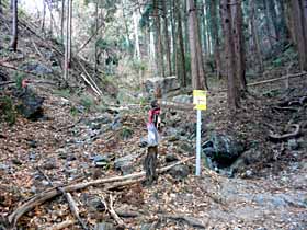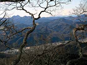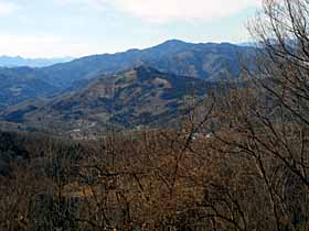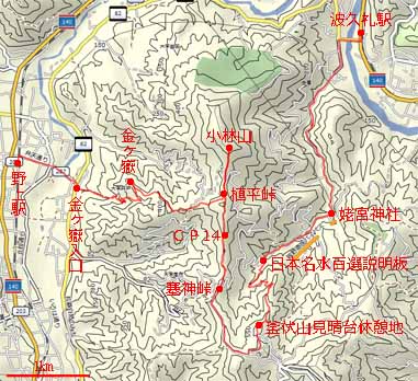2019年1月25日(金)晴 秩父鉄道・野上駅804…金ヶ嶽入口819…900金ヶ嶽910…956植平峠1004 (140) 15 (138) 41 (382) 46 (475) …1024小林山1043…植平峠1056…1108チェックポイント14 1113…1133塞神峠1146 20 (△539) 13 (475) 12 (446) 20 (450) …1235釜伏山見晴台休憩地1255…日本名水百選説明板1400…1415姥宮神社1425 49 (578) 65 (256) 15 (184) …1511波久礼駅 46 (113) 体力度A+ 神経度A+ (歩行合計約6時間15分) 【GPS記録】距離14.1km ◇5万図 寄居 □筆者参考資料 「ながとろ遊々ハイキングマップ」(長瀞町観光協会)先日、宝登山から野上駅に下りたとき駅の向こうに三角に見えた小山が気になりました。勿論、角錐型の独立峰ではなく、その後ろの主稜線から派生する支尾根の末端に過ぎないことは百も承知ですが、後ろの山の外秩父らしいまろやかな感じとの対比により、とんがって見えたのです。 帰宅後、参考資料を見ると、それは「金ヶ嶽」で、後ろの主稜線へ繋がるハイキングコースにもなっているようなので、早速行くことに決めました。 外秩父には結構行ってるのですが、釜伏山の西から北に伸びる尾根は、外秩父主脈北部と言ってもいいような山域なのに、筆者の空白地帯でした。ガイドブックに採り挙げられていないから見逃していたと思ったのですが、実は「埼玉県の山」(旧版)の「釜伏山」の項の後半ルートとして掲載されていました。(今回帰宅後、その記事を確認して発見しました。)釜伏山はその記事を見て知り、96.02.10に登ったのですが、前半の情報だけ参考にして、釜伏峠から尾根を南へ辿り二本木峠から打出BSへ下山していたので、北部のハイキングコースとしての存在はずっと忘れていたのです^^;)。 野上駅北の踏切から東へ進み、高砂橋を渡って突当りから右に僅かで「金ヶ嶽」の説明板(長瀞町)がある金ヶ嶽への入口です。 踏切から東へ金ヶ嶽を目指す。登って行くと始め林道だった道が小径に変わり、Y字路に。正面谷沿いの道が地理院地図の破線ですが、見るからに難路なので参考資料にも載っている右の迂回路を行きます。 地理院地図の破線は見るからに難路。金ヶ嶽南東の鞍部に登り着き、左へ僅かで正面に建物、その手前から右へ登れば金ヶ嶽の山頂です。木に囲まれて展望は良くありません。北面足下をのぞき込むと45度以上ありそうな急斜面です。 反対側から建物の正面に回り込むと「春日神社」の表札。地図の記号から神社があることは判っていましたし、途中の指導標でそれが「春日神社」であろうとは知ってはいましたが、建物自体は物置小屋風です。神社の正面に、破線の道が登り着いていますが、ここから見える範囲は急傾斜ではあるものの荒れていません。なので、逆コースの場合、ここを下って、途中から難儀するはめになりそうです。 先程の鞍部から反対側へ、主稜線を目指します。途中、左側が45度くらい切れ落ちたトラバースがあり、少しビビって慎重に通過。左・葉原峠、右・植平を示す指導標を見て頭が混乱しますが「植平」は峠名ではなく集落名と解釈して左へ。やがて主稜線に登りついた場所が植平峠です。ここからまず、538.6m三角点ピーク(小林山)を往復します。 尾根を少し北へ進むと右手樹間から寄居方面が望まれます。その先「葉原峠」で車道を横断し、登りに入ります。歩くことに没頭していたら頂上の150mくらい手前で尾根道より明瞭な右の巻道に入ってしまいました。すぐ気が付いて数mほど戻って尾根を登ります。登り着いた山頂には、「銃猟禁止区域」の赤い立札の軸に「小林山」と書かれた小さな板がくくり付けられています。(ここは参考資料では「大平山(小林山)」となっています。) 植平峠へ戻って、主稜線を南へ辿ります。展望は樹間程度ですが、穏やかで気分の良い尾根歩きです。12分ほどで「葉原峠」と掘られた石の標注の場所に着き、「ながとろ遊々ハイキング チェックポイント14」の標識や、すぐ近くにはレリーフ状の石仏もあったので少し休憩。メモ帳に「葉原峠 1108-13」と記録しましたが、帰宅後、葉原峠は小林山の手前で既に通っていた事に気が付きました。標注の「葉原峠」は、その字の面の方向の道が「葉原峠に至る」という意味なのでしょう。なるほど、植平峠の標注にあった字が「植平峠」ではなく「植平」だったのも、現地の地名ではなく「こちら植平に至る」だったからか。 そこから8分ほどで仙元峠。春日神社よりかなり小型の祠らしき小屋があります。ここの標注にも「仙元峠」と掘られていますがその下に「長瀞町」と掘られているので、その事により「こちら仙元峠に至る」ではなく「ここが仙元峠」と示しているのかも知れません。 更に12分ほどで車道に出ます。ここは車道の三叉路で「塞神峠 埼玉県 環境庁」の大きな標注が立っています。ここで路肩の石に腰掛けて、弁当タイム及び今後のルートの検討。 本命のA案は、参考書のハイキングコースでここから長瀞方面に下るルート。B案は、体力や気力、時間に余裕があれば、0.7kmほど南から西へ向か