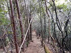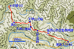 2019年4月12日(金)曇 釣場BS 900…高山925…949天神山南峰956…山王坂峠1005 (・182) 25(・330) 24 (・307) 09 (220) …1016堂西山防空監視哨跡1022…1040尾長入口BS 11 (・291) 18 (・140) 体力度A 神経度A (歩行合計約1時間35分) ◇5万図 秩父 川越前回ハイキングの下山地付近「原市場の森」をググって見ると、地元で整備中のハイキングコースとして紹介されていたのがこの中藤尾根です。前回ややきつかった事もあり、今回ショートコースは丁度いいので早速出かけました。 西武線・飯能駅から中沢行のバスに乗り、釣場で下車。満開のソメイヨシノより鮮やかなピンクの花(葉が殆どなく、ツツジっぽいが小さめの花。ミツバツツジか?。)の写真撮影などしながら1〜2分も進めば左手に「中藤尾根」の指導標がある登山口てす。 登山口。板で土留めされたステップの急斜面をジグザグに登って行けば尾根道となります。尾根は急傾斜ではありませんが直登なのでそこそこ急登です。この辺り植林帯ですが、間伐が行き届いているので、尾根や谷の地形がよく見えて面白いです。ただし、こういう場所では掴んだり、根を足場に出来る木もまばらなので、特に下りではずり落ちそうで少々ビビります。 歩き始めて20分ほどで通過する久根花山は肩のような所で、そこから5分ほどで高山に登り着きます。ここが本日の最高点ですが樹木に囲まれた寂峰です。 露岩の金亀石や三ッ窪峠を経て登り着いた天神山北峰で右折し4分ほどで天神山南峰。 天神山南峰の頂稜部はほぼ平坦に細長く、植林に囲まれた山頂より少し手前の方が雑木で明るいので、こちらに戻って休憩。しかし、展望はありません。 天神山を過ぎると雑木のやや急な下りあり。その後また植林帯となり、下り着いた鞍部は明瞭な道が交差する顕著な峠ですが、そこに立つ指導標に現地名なし。(調べたら無名ではなく「山王坂峠」でした。 雑木のやや急な下り。次のピーク周辺には人工的な小地形が見られたので城跡かと思ったら、現地に立つ説明板から「堂西山防空監視哨跡」と知りました。「戦時中、空襲に飛来する敵航空機をいち早く発見し、軍に通報する為の見晴らし所」がここにあったとの事ですが、ここも植林に囲まれて展望皆無。 堂西山防空監視哨跡。堂西山から下った鞍部には奥秩父線66号鉄塔があり、本日唯一の展望地。左右の電線沿いに視界が開けますが、鞍部なので遠望できる角度は広くありませんし、近隣の山に比べて標高が低いので、閉塞的な展望です。 石祠のあるピークを経て、里道に下り着けば尾長入口BSまで僅かです。 花壇の縁のコンクリブロックに座ったりしつつ30分以上待ってバスに乗りましたが、隣の停留所まで近かったので歩けば良かった。運賃は変わりませんが、隣の停留所にはベンチがあったからです。 堂西山まで頻出した真新しい指導標がそれ以東では皆無(登山口に古い指導標はあり)となるのは、またで全体としては整備中なのでしょうが、道は全区間明瞭です。しかし、特段の見所や展望地もないので低難度のショートコースとは言え、入門者にはお勧めできません。天覧山〜多峰主山や日和田山〜高指山等が先でしょう。でも、有名所を歩き尽くした人が、ショートコースで山の空気に浸かりたい場合には静かでいいと思います。 ▲項目索引▲ ◎トップページへ戻る◎ |
