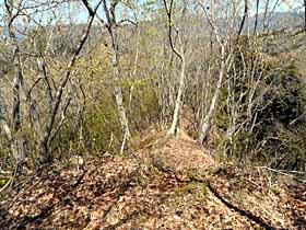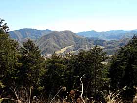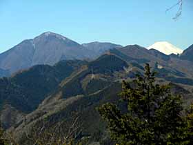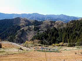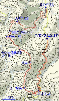 2019年4月16日(火)快晴 やまなみ温泉BT 820…900菅井入口910…送電鉄塔928…1004峰山1024 (299) 40 (398) 18 (466) 36 (・570) …457m標高点西の下降点1042…1109 414m峰1114…400m圏の小屋1124 18 (450) 27 (・414) 10 (401) …小津久BS1143…1213賽の神BS 19 (277) 30 (255) 体力度A+ 神経度A+ (歩行合計約3時間35分) 【GPS記録】距離10.3km ◇5万図 上野原例によって、地理院地図(電子国土)上徘徊中に見つけて、ググって登れることを確認した山です。結構登られていて、地元観光協会の「藤野15名山」に選ばれていますが、調べてみたら他の14座は踏破済みでした。もっとマイナーな山も含まれているのにこの山が残ったのは、「中央線の山を歩く」(藤井寿夫)等の筆者愛用の参考文献に採り上げられていないためです。 それほどの距離・累積標高差にはならないので、やまなみ温泉BTから<76>を南下して菅井から尾根を北上、峰山からは北西に尾根を辿り、414m峰から右折して小津久へ下ろうという、出来るだけ長めに尾根を歩く計画にしました。 藤野駅から8:00発奥牧野行バスに乗りやまなみ温泉下車。次のバスは10:40発なのですが、普通に行けば14時過ぎには下山出来そうなので、帰りのバスの接続はこちらの方が良くなります。しかし、初めてのルートで道迷いなどの遅延も考えられますし、早い時間帯の方が遠望も利きますので早い方のバスで行きました。 バス通り<76>を先へ進みます。この区間も以前はバスの便があったようです。初めは谷底を行く感じですが、途中から明るく開けた感じになります。「これより五町 尾崎城城下町」の標識を見てすぐ先、正面にトンネルが見えてたら、右に分岐する林道が菅井集落への道です。「庚申塔」等と彫られた石碑の下の段に腰掛けて軽食タイム。 林道を登り切った鞍部周辺が菅井集落です。この辺りは東海自然歩道のコースにもなっていて指導標完備。少し西へ進んで、畑の向こうに丹沢北部(焼山・黍殻山・袖平山等)の山を眺める図はのどかでいい感じです。 菅井集落の西より南面の眺め。東海自然歩道を左へ分けた先、送電鉄塔の鞍部から北へ辿る尾根沿いの道は、峰山本峰への登り手前までは、ピークをことごとく巻くうえ、若干下り基調なので楽です。その分最後に一気に登ることになりますが、それも標高差130mほどですので、休み休み登れば大バテする事はありません。頂上直下は手摺付きのコンクリ擬木の階段ですが、ステップの土がえぐれてハードル状になっているところは、いけないとは知りつつも横の踏み跡を歩いてしまいます。 祠のある峰山山頂は木立の中ですが、東面に石老山・石砂山方面、南西面に丹沢北部の山や檜洞丸〜大室山・加入道山、ムギチロ・(奥に富士山)・鳥井立〜朝日山方面の展望が得られます。展望と食事を楽しんだら北へ。 峰山より石砂山方面の展望。 峰山より大室山・加入道山、ムギチロ、富士山。始めの150mほどは頂稜部と言ってよく、その北端には石碑が3つ並んでいます。その先で西寄りに進路をとり、457m標高点の西から北へ下降するのですが、木に赤テープはあるものの、その前後を行ったり来たりしても下る踏み跡が見つかりません。しかし藪は濃くないので、進むべき尾根の方向に適当に下ったら、すぐに明瞭な道に出ました。ここには指導標があり、前方の尾根が舟久保方面、トラバース道右が大鐘方面、左が峰山方面となっています。峰山は逆方向なので、さっきの下降点より西のどこかからか折り返して来ているのでしょう。予定通り舟久保方面への尾根を行きます。 しばらく道也に尾根を辿り、登り着いた414m峰で休憩と進路の確認。ここには朽ちた指導標が「右折・小津久方面」を示しています。 次の400m圏峰は山頂部が広く、道也に行くと尾根を右(東)へ外れてしまうので、左奥へ行くと4m四方くらいの新し目の小屋がありました。周りはかなり広めに整地されていますが多少藪っぽいです。窓は鎧状で中を窺い知ることはできませんが、倉庫でしょうか。小屋の右奥から、尾根を下ります。 気分のいい尾根道。この尾根道は低木主体で明るくて、足下の岩が苔むしていたりして、非常に気分のいい道です。最後、ジグザグに下れば車道に出て、右へ僅かに行けばバス通り<517>に合流。 ここにバス停の標識が立っていますが、「小津久」ではなく「舟久保」でした。地図上の舟久保はもっとずっと西の方なので一瞬、下りて来た道を疑いましたが、予定通りのルートでした。次の交差点にある小津久BSまで250mほどです。山間部なのに間隔が短くてびっくり。 次の藤野駅行の小津久のバス時刻は14:07(2時間以上待ち)ですが、賽の神まで2.5kmくらい歩けばやまなみ温泉発の12:38に乗れます。普通に歩けば余裕で間に合うはずですが、万一乗り遅れたら次は14:20なので、つい焦って早足になり、賽の神BSで30分近く待つ事になりました(^^;。 好天に恵まれたのみならず、この季節にしては遠望も利いたせいもありますが、菅井集落の風景、山頂からの展望、下山路の低木の尾根