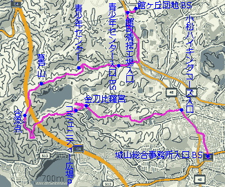 城山総合事務所入口BS 0956…小松ハイキングコース入口1012…金刀比羅宮1051