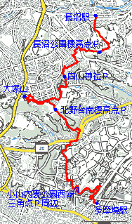 朝早く目が覚め、関東地方は終日晴れの予報。夕べはしこたま飲んで体調万全ではないけど、どこかハイキングへ行かないと勿体無い。で、多摩丘陵の宅地造成を免れたピークを巡る事に。長沼から三角点や標高点のあるピークを5つ廻ってゴールは多摩境。駅近くで知人が営む天ぷら屋で天丼を食って帰るというプランです。色々検討したり朝飯食ったりしてるうちに出発が遅れてしまいましたが、予定通りに行けば昼食時間帯に多摩境へ到達するはずで丁度良い。京王線・長沼駅から南へ行けば長沼公園内の道となります。この辺り、小規模ながら主尾根から何本もの支尾根や谷が北へ伸びていて、山へ来た気分を味わえます。公園からは西へ出るので、分岐では東(左)の道を選びつつ登って行き、主尾根に到達。ここまで雑木林ですが対面する南斜面は畑。主尾根を西へ行き、184m標高点が第1目標地です。 184m標高点付近には廃屋のような小屋がありました。その先の「峠の小さな美術館」の一部かもしれません。尾根通しに行きますが、その後尾根上は建物の敷地となって道は稜線の右(北)へ下って行きます。公園を出て少し行けば野猿街道に突当たります。左(南)方に少し登って行けば野猿峠ですが、第2目標地点は白山神社のある178m標高点ピークですので割愛。 野猿街道には中央分離帯がありますが、僅か左に分離帯の切れ目を発見、そこを横断。正面の道へ入ろうとしたら、そこはお寺(光照寺)の入口で、「立入りお断りします」の掲示あり。少し北の交差点から西へ進みました。この交差点まで来るなら横断歩道を渡れていました。(^^; 光照寺のある残丘部の北側を迂回して、斜面状の造成宅地「絹ヶ丘」の上部を通って、白山神社P目指します。今日は上天気なのに視程はよくありませんが、坂道を通して電線越しに富士山が見えました。 坂道を通して電線越しに富士山。広めの道に出る所で「白山神社裏参道入口」の標柱を発見。その手前の左折路がそれらしいので、そこを行くと「白山神社展望台」の標柱があり、バス停みたいな屋根の下に展望図もありますが、視界は立木で遮られています。そもそも、比高が不十分なので、立木の隙間からも近くの建物に遮られて遠望の山々は上部しか見えませんから、ここを「展望台」とした意図が解りません。 その先僅かな登りで白山神社に着きます。この辺りが178m標高点のある頂上ですが裏参道入口からの標高差は僅か10m強です。 神社から南へ下る階段はかなり長いです。階段下の里道を直進し、広めの車道に出る所に「白山神社表参道入口」の標柱がありますが、こちらの山頂(白山神社社殿)との標高差は50m近くあります。 第3目標地は西方の213.5m三角点ピーク・大塚山です。車道を右に行き左カーブしながら登って行くと、中山小学校の北側斜面上部から、谷越しに白山神社ピークを眺める事が出来ました。 中山小学校の北側斜面上部から白山神社ピーク。その先道は右カーブし、交差点で左折すれば、大塚山の入口の階段下までは道也です。大塚山へは途中、「けんぼく公園」の先で左に分岐する車道からも行けますが、そちらは下りで使います。 階段の上は美林の小径で、その先、広めの道に出たら右へ階段を登れば、石像や建物の土台がある大塚山山頂部です。樹木に囲まれて展望はよくありませんが、富士山は何とか見えました。三角点は一番奥、最高点と思われる辺りにあります。 さっき来た方へ下りますが、直進は「絹の道資料館」方面で大塚山ハイキングのメインルート「絹の道」です。今回は水道施設の手前から左へ行くと始まる車道を下ります。この車道は眺めが良くて気分のいい道です。右側には絹の道の尾根が見え、左側は「北野台」の造成宅地の家並から始まる広大な展望が開けます。程なく、さっき来た車道に合流します。 水道施設の車道より白山神社ピーク方面。第4目標地は南東方の193m標高点ピークです。すぐ先にあるバスターミナルの先を右折するとすぐに、尾根道に登っていけそうな階段がありますが、地図に道記号がないので、尾根道に向かう小径記号がある地点まで200m程進むと、ここも階段でした。 尾根道に出て左へ少し進むと道は分岐しますが、その手前右手の高まりがどうやらこの付近の最高点のようなので、193m標高点ピークと同定しました。標高点なので標石もなく、藪の中ですが、切開きにはなっている様にも見えます。 道に戻り分岐を右へ、その先の分岐は地理院地図では右はすぐ下って行く道のようなので左へ。程なくこの道は山腹から谷沿いとなりますが、後でGPSの地図を見ると、右の道は尾根を行けたように見えますので残念。山腹から尾根へ登れそうな右分岐道もありましたが、右斜面は畑で「栽培物盗るな」の表示があったりして、地元民に見つかったら怖いのでそのまま谷沿いへ続く道を行きました。 里道に出てから更に下って「神明神社前」バス停の道に突当たり右へ。平行してた1本東側の太い道に合流