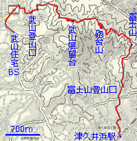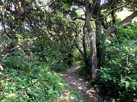 2019年6月19日(水)晴 京急・津久井浜駅859…富士山登山口917…941富士山951 (16) 18 (32) 24(△182.9) …砲台山1017…1033武山展望台1057…武山登山口1122…1138武山住宅BS 26(・204) 16 (・200) 25 (57) 16 (21) 体力度A 神経度A (歩行合計約2時間15分) ◇5万図 横須賀 □筆者参考資料 「東京近郊日帰りハイキング」(1981 馬場渓二)梅雨の晴れ間の軽ハイキング第2弾は三浦富士〜武山という三浦半島では定番のコース。全国に富士と呼ばれる山は多数ありますが、5万図に「富士山」と註記があり「ふじさん」と読ませる二等以上の三角点峰は本家とここの2座のみという噂です。(他は「○○富士」だったり「ふじやま」だったり。)ただし本家の富士山も視界に入るコースなので、区別するために本文中は「三浦富士」と記します。 三浦富士へは京急長沢が最寄駅ですが、すぐに登山道へ入ってしまうのもあっけないので、今回は山を眺めつつアプローチする津久井浜駅からのコースとしました。 津久井浜駅から京急ストア前の道に出て左、すぐに高架をくぐって北へ適当に道を拾って行きます。やがて、石像と「三浦富士 武山」を示す指導標があり、その示す方向へ行くものの、すぐの右分岐で奥に鳥居が見えますので、そちらの道へ。 期待通りその鳥居は三浦富士の登山口でした。コンクリの小径を登って行くと車道に合流、それを行きます。車道の途中、ソーラーパネル群の向こうに三浦富士らしき山が望めました。道が小径となってぐいぐい登れば露岩に石祠や石碑が並ぶ、三浦富士山頂です。樹木のため展望は限定的で、本日は視程が悪く、海岸付近はもう霞んでいて、その先の海・陸・空の区別が付きません。 縦走路は緑が濃密。ミニ縦走開始。低木や下草が濃密な樹林帯を行きます。でも、この季節でも道には藪はなく、快適に歩けます。次のピークはこのコースの最高峰である砲台山。縦走路は山頂直下南西側を巻いていますが、当然、山頂に寄って行きます。でも、砲台跡らしいコンクリの遺構とアンテナ塔があるだけで、好展望もないのですぐ縦走路に戻りました。 いよいよ着いた最終ピーク武山の山頂部は非常に広く、東端近くにある「アゼリアハウス」は1階が休憩所、屋上が展望台でいずれも無料で自由に利用できます。展望台からは360度の展望が得られますが、今日の視程では三浦半島先端部も霞み勝ち。しかし、それでも流石に砲台山ははっきり見えます。その右奥の三浦富士も砲台山とかなり重なってはいますが、地理院地図で直線を引いてみると途中にそれより高い地点はないので、山頂は見えていたはずです。 武山展望台より砲台山方面の眺め。展望を楽しんだ後、1階で少し休憩して出発。下山の前に山頂西端地近くの武山不動に寄って行きます。本殿の裏(西側)に回ってみましたがそこから直接の下山路が見つからないので、山頂中央部近くまで戻って西麓へ下る道に入ります。 武山不動。この道はコンクリ舗装の細めの車道ですが里道に合流するまで車には出合わずに済みました。合流点には「↑武山山頂」を示す標柱や「武山・砲台山・三浦富士 ハイキングコース」の立札等があり、ここが登山口と言っていいでしょう。 武山登山口。登山口からは下り方向に里道を拾って太めの道<26>に下り着きました。左に進み、出合った<214>を左に進んで武山住宅BSを発見。そこから三浦海岸駅行のバスに乗る事が出来ました。 久々に歩きましたが、この季節でも気分良く歩けるいいコースでした。武山の展望台からの眺めは素晴しいので、遠望の利く日に行ってみたい場所です。 ▲項目索引▲ ◎トップページへ戻る◎ |