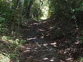 2019年6月26日(水)晴 湯坂路入口BS 1002…1015鷹巣城跡1022…1042浅間山1050…湯坂城跡1207 (806) 13 (・834) 20 (△801.5) 77 (274) …1233箱根湯本駅 26 (95) 体力度A 神経度A (歩行合計約2時間25分) ◇5万図 小田原梅雨の晴れ間の軽ハイキング第3弾は箱根の古道・湯坂路。ガイドブックには結構逆コースで掲載されていて、実際そのように歩く人も多そうですが、筆者的には湯坂路入口BSスタート一択。バスやケーブルカー等の乗物を下りに使うのはバカらしいと考えてしまうのです。 小田原駅東口から箱根登山バスで湯坂路入口へ。伊豆箱根バスでも行けるので、合わせると平日なのに結構頻発しています。そのため、小田原では空席があるくらいでしたが途中からかなり乗って来て、小涌園あたりでは満員。しかも、8割くらいは外国人に見えました。なので、乗車客0、降車客筆者1人の湯坂路入口BSで、後扉より後ろの座席から降りるのはちょっと大変でした。 一部区間箱根登山鉄道を利用することも出来ます。小田原駅東口〜湯坂路入口バスの運賃は980円ですが、途中まで電車に乗った場合の残り区間のバス運賃との合計は、箱根湯本乗換1040円、大平台乗換960円、宮ノ下乗換1000円、小涌谷乗換950円なので、道路が渋滞しそうなら一考の価値があります。鉄道好きなら小涌谷まで電車がいいかも。でも、座って行きたければ小田原からバスです。 湯坂路入口BSから僅かに戻ると湯坂路の入口。樹林帯の道をだらだらと登って行けば鷹巣城跡(鷹巣山山頂)。ここが本日の最高点で、ベンチ・テーブルがありますが、展望皆無。 下ってまただらだら登れば浅間山。標高は湯坂路入口と同じくらい。ここで弁当タイムの予定でしたが、日向のベンチが熱くてゆっくり座っていられないので中止。展望も、今来た道の上に、神山方面の上部が見える程度。 浅間山より神山方面の眺め。 アザミっぽいの花やアゲハっぽい蝶がちらほら。浅間山からは下り一方。樹相の変化はあるものの、ずっと樹林に挟まれて展望皆無。そして、終盤に現れる石畳は地味に難路です。足への衝撃は強いし滑るし。普通の露岩帯なら水平または受けてる面を選んで足を置く事が出来ますが、石畳は全ての石の面が傾斜に揃えてあるので靴底の摩擦力頼りなのです。ここでコケたらダメージ甚大なので慎重に歩きます。 石畳の道。結局、箱根湯本側の入口まで、弁当好適スポットなし。時間のチェックポイントに出来る地点も最終盤の湯本城跡のみでした。車道(R1)に出て橋を渡れば箱根湯本の市街地で、店を覗いたりしてちょっと観光気分を味わいながら駅に向かいました。 緑の中にどっぷり漬かり、観光気分も味わえて、非日常を感じる事は出来ましたが、ここまで展望地がないコースは稀です。箱根周辺なら、矢倉岳、金時山、明神ヶ岳等を先に歩く事をお勧めします。 ▲項目索引▲ ◎トップページへ戻る◎ |
